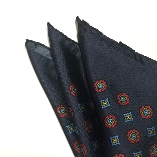 12.5" Navy Blue / Red / Yellow Floral Silk Twill Pocket Square