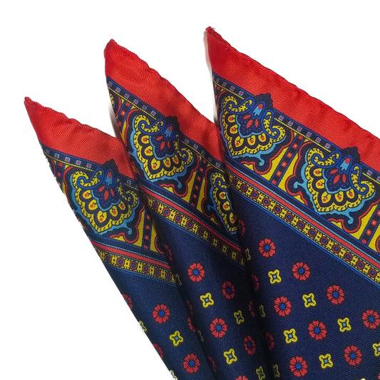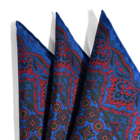 12.5" Royal Blue / Red Paisley Silk Twill Pocket Square