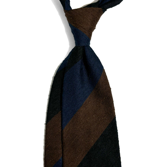 Untipped Navy Blue / Green / Brown Block Stripe Silk Shantung Tie
