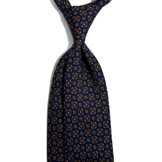 Hand-Printed Navy Blue & Gold Geometric Floral Ancient Madder Silk Tie