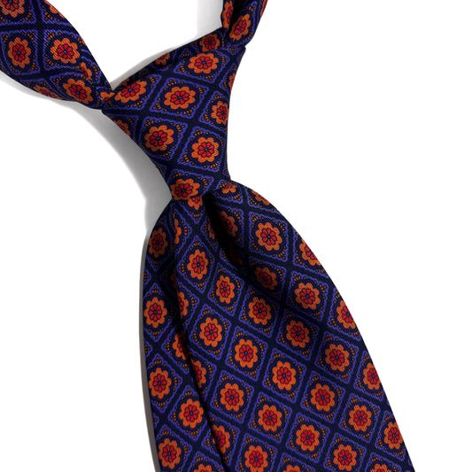 Hand-Printed Navy Blue & Red Geometric Floral Ancient Madder Silk Tie
