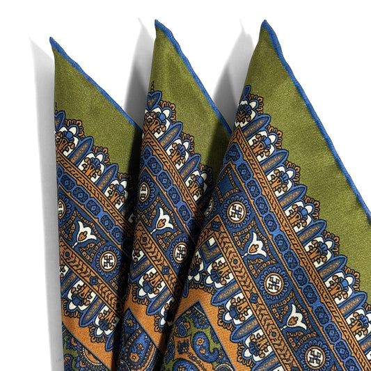 Olive Green & Orange Paisley Silk Pocket Square