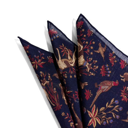 Terra - Floral Animal Motif - Navy Blue - Wool/Silk Pocket Square