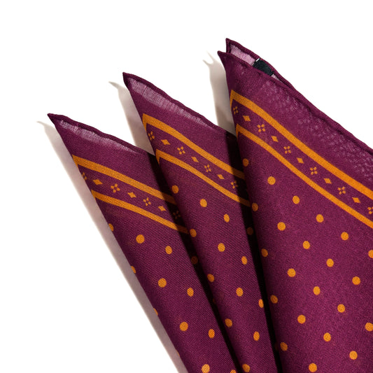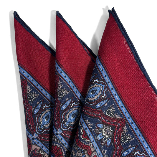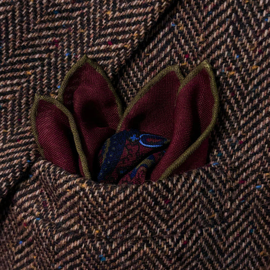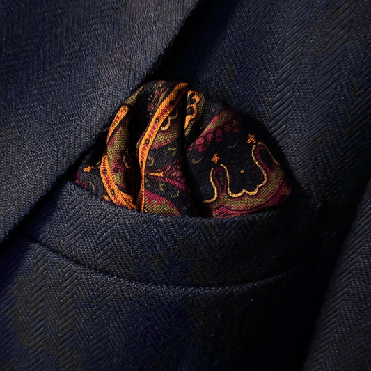 Discover an exclusive collection of wool/silk pocket squares, handcrafted in Macclesfield, England. Each piece is curated from a historic archive, showcasing exquisite, vibrant prints and finished with meticulously hand-rolled edges—a refined touch of craftsmanship and style for the discerning connoisseur.