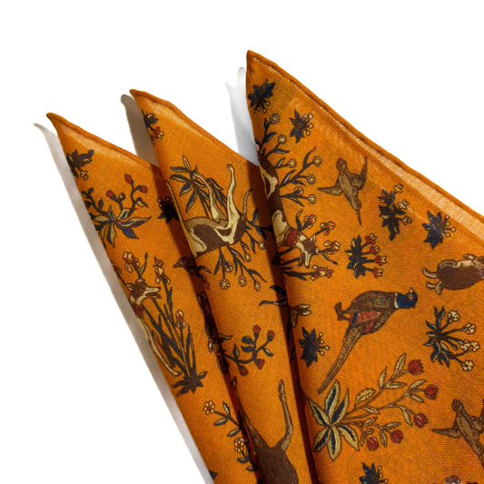 Terra - Floral Animal Motif - Mustard Yellow - Wool/Silk Pocket Square