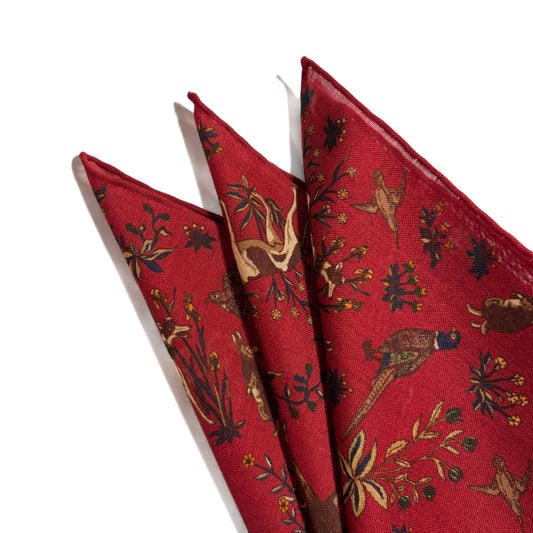 Terra - Floral Animal Motif - Red - Wool/Silk Pocket Square