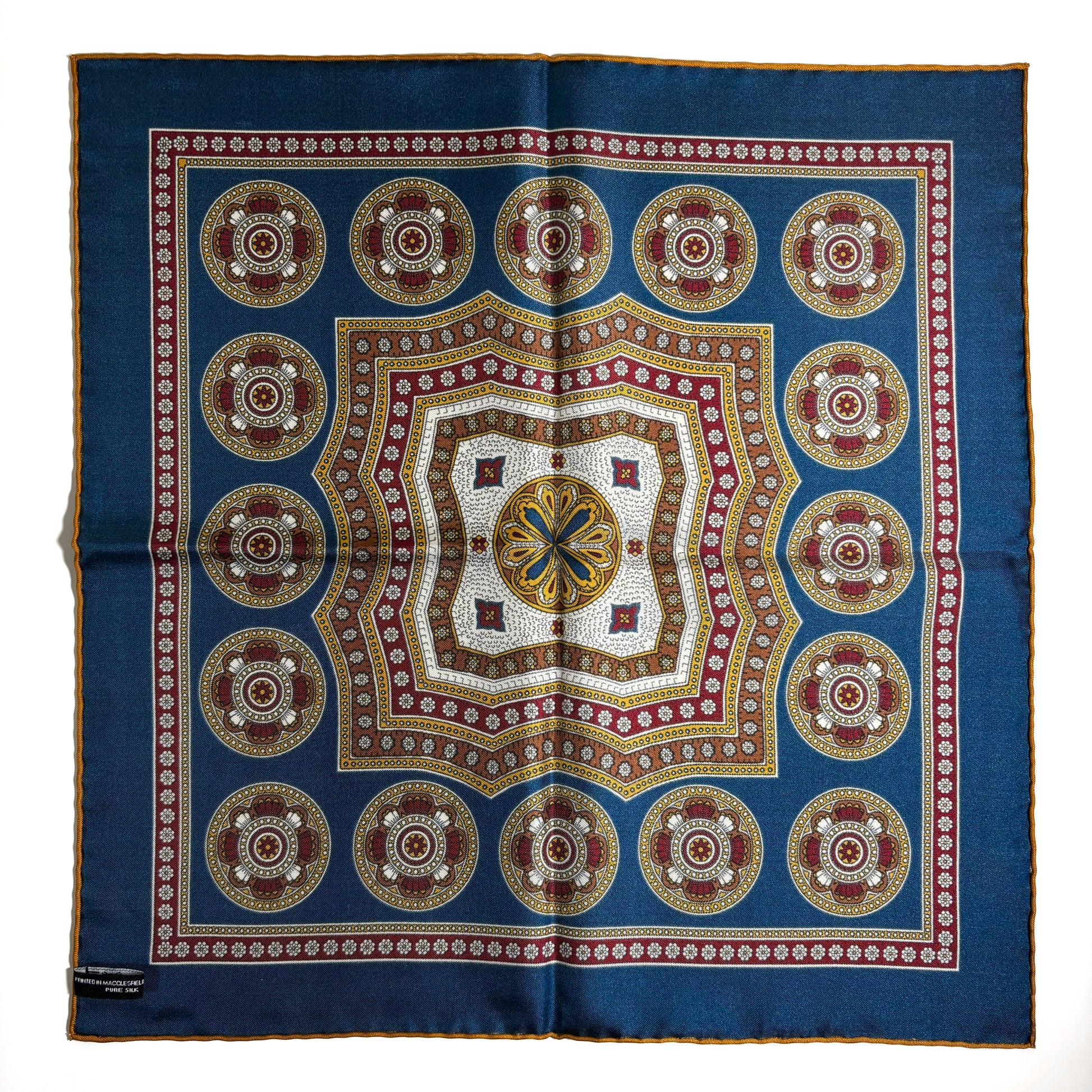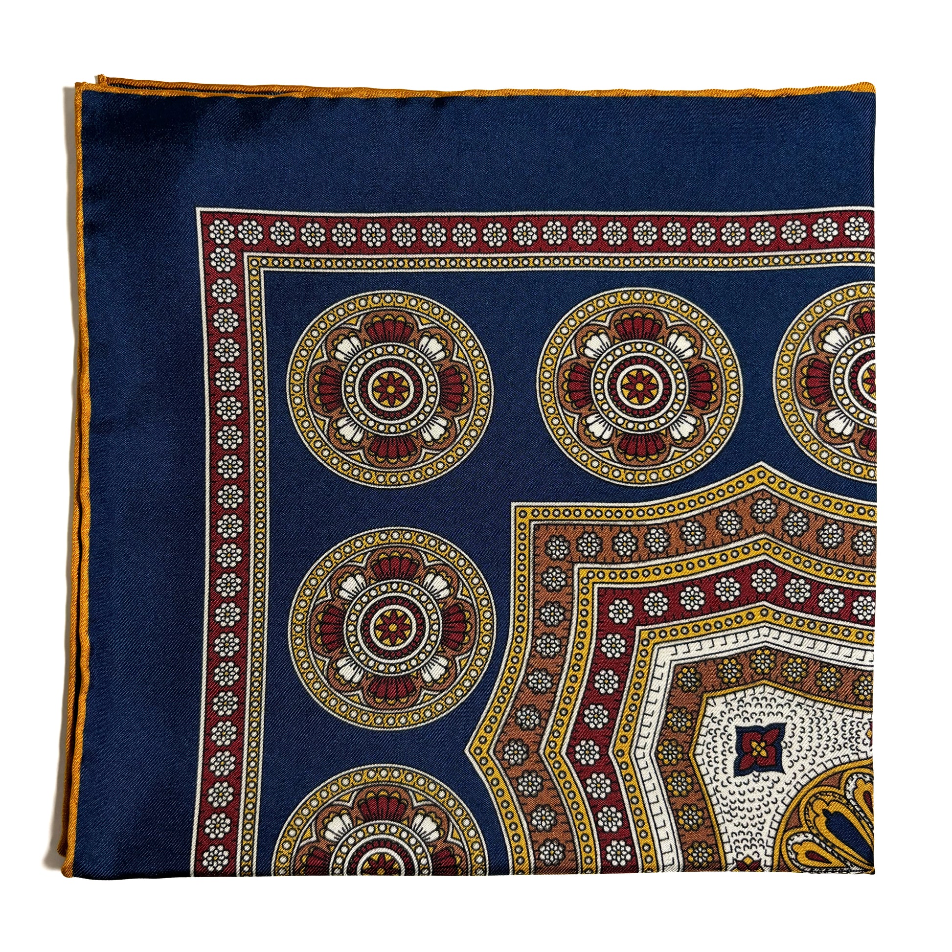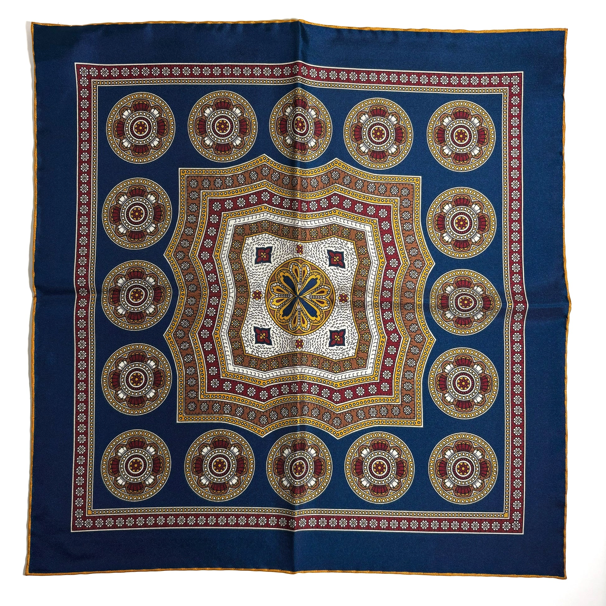 | A Timeless Silk Twill Pocket Square This design features a bold center medallion with smaller geometric ornaments dancing around the center, a solid border and a shoestring edge.
