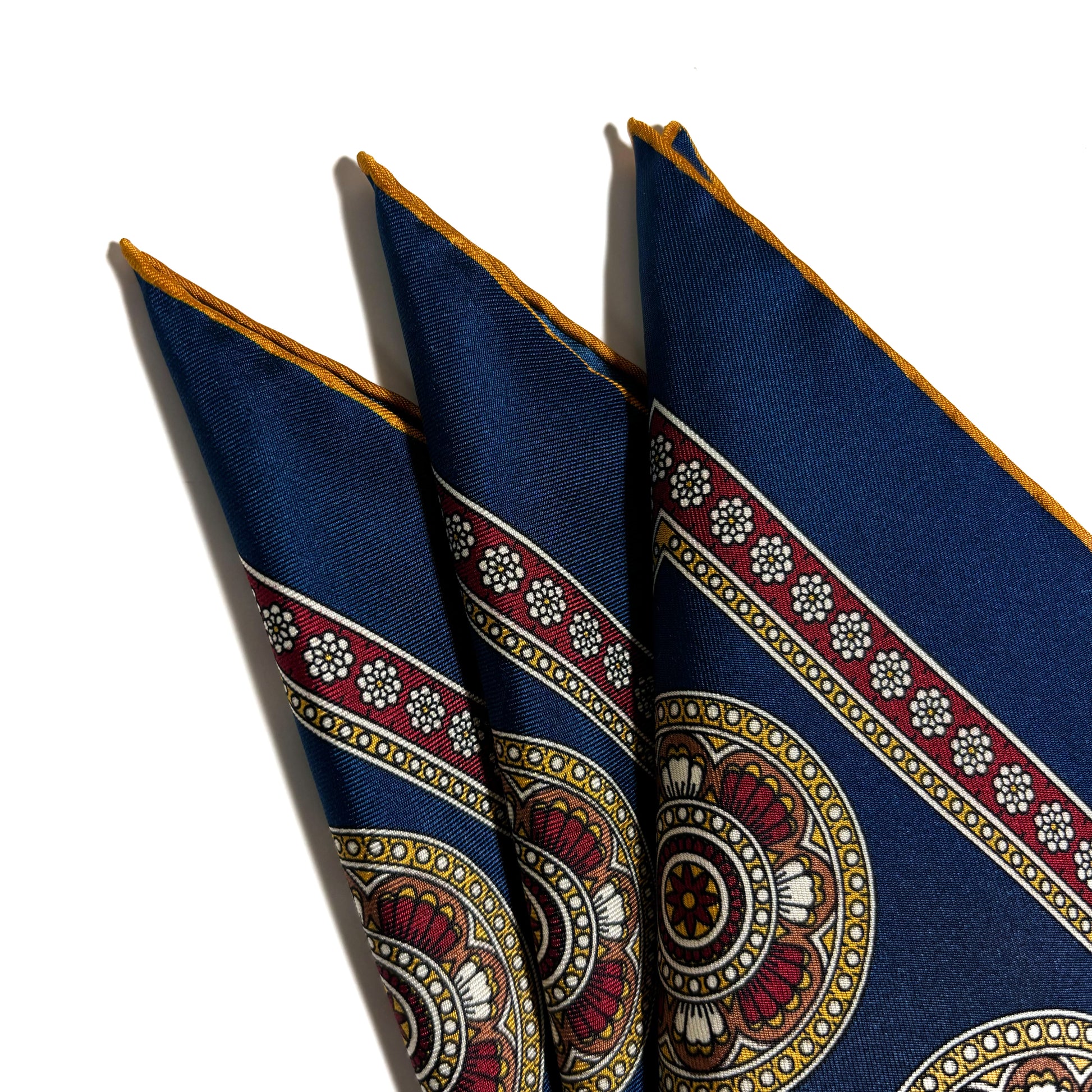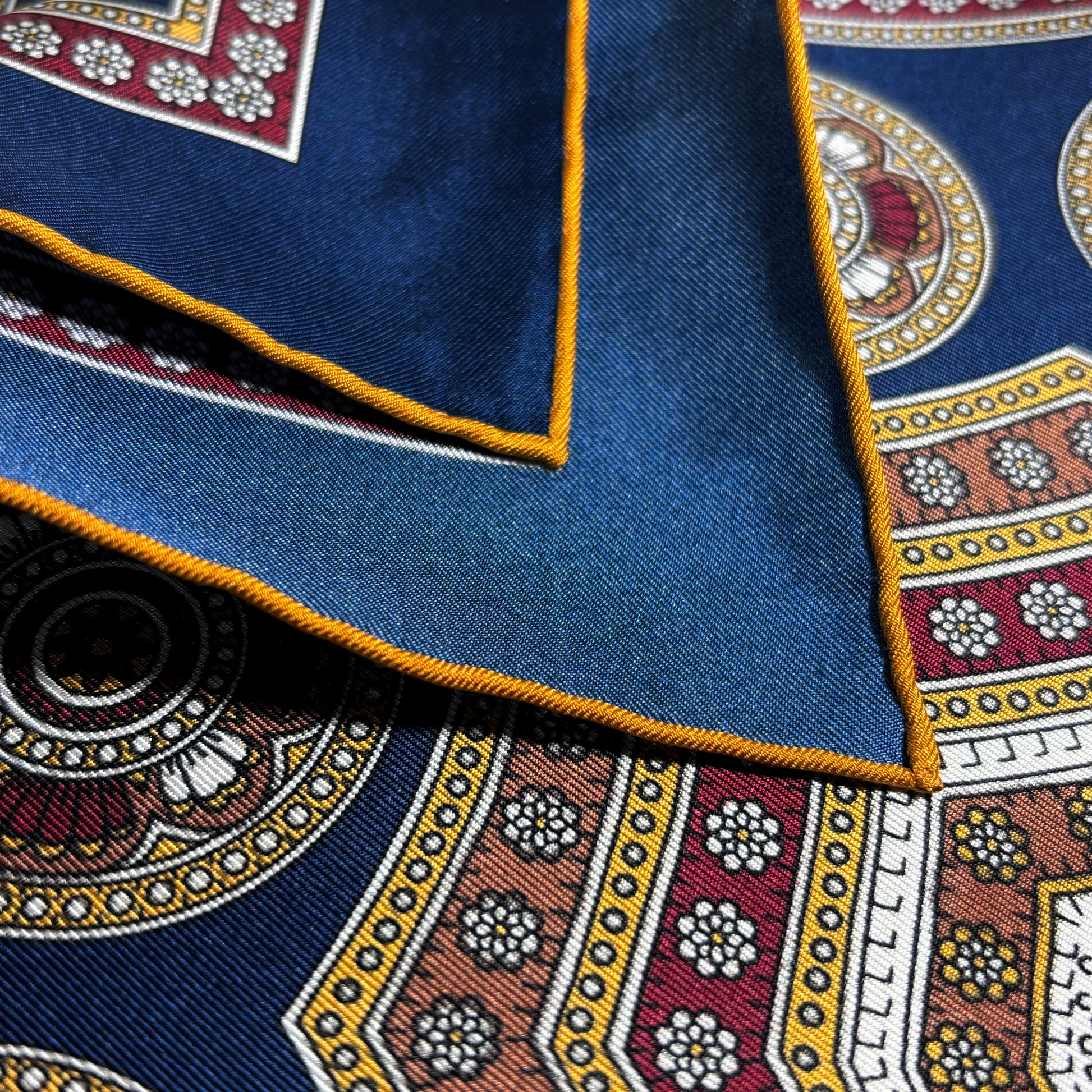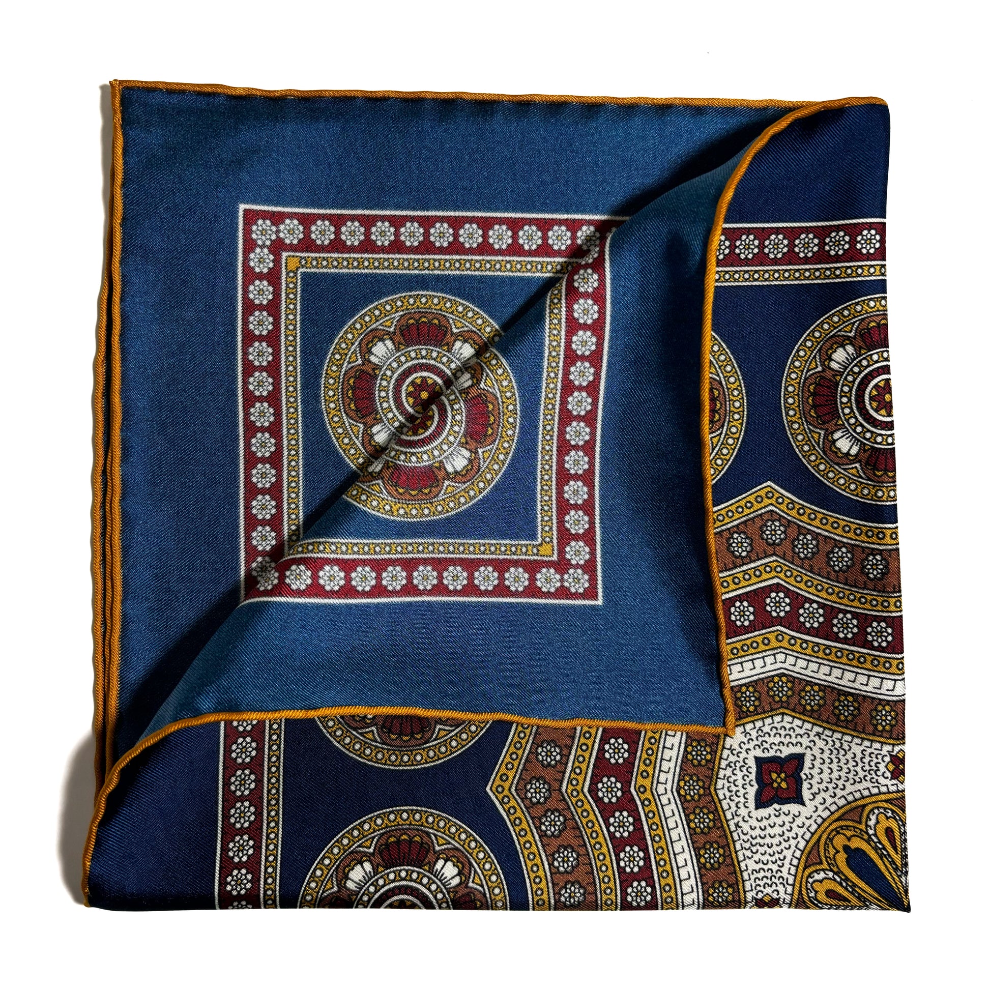 | A Timeless Silk Twill Pocket Square This design features a bold center medallion with smaller geometric ornaments dancing around the center, a solid border and a shoestring edge.