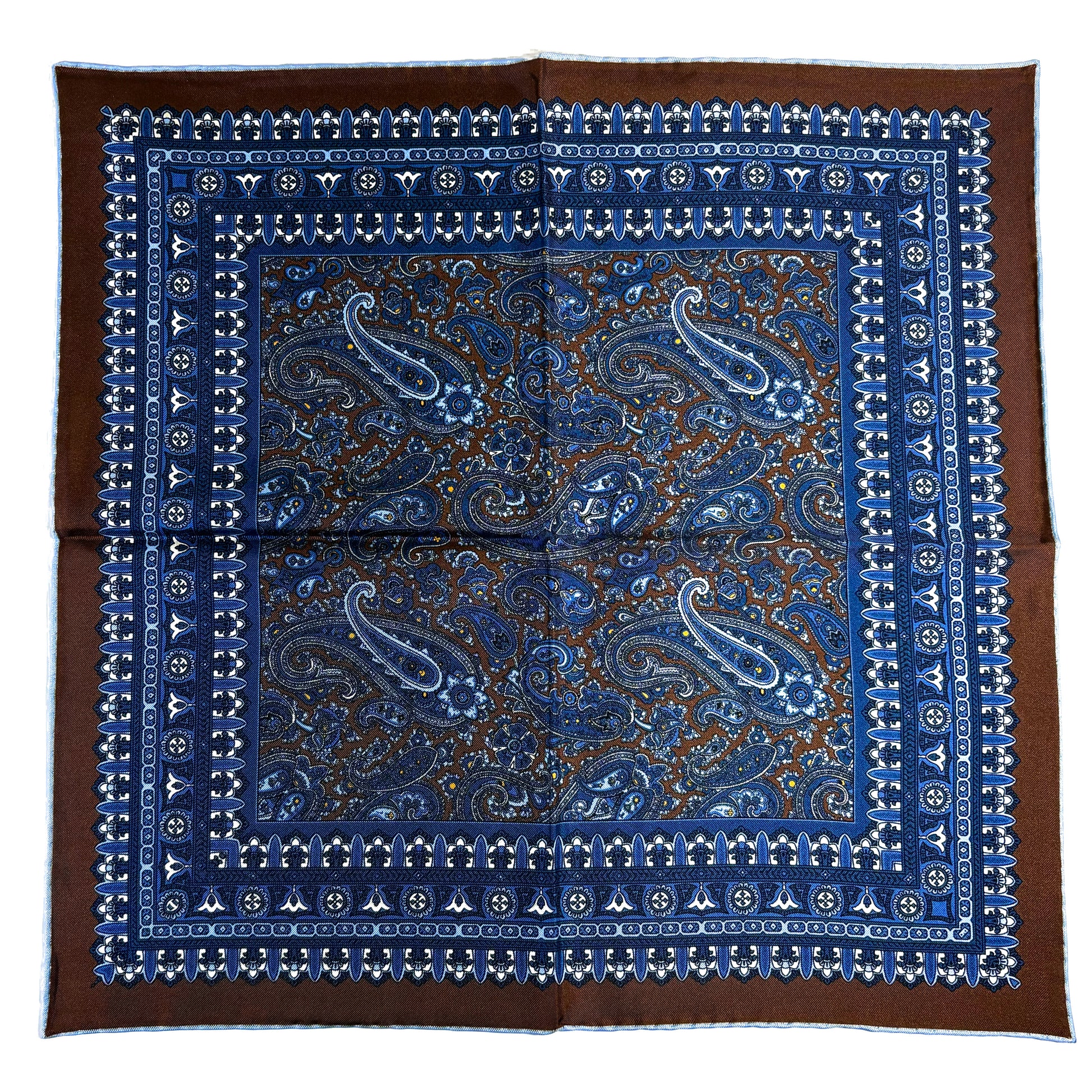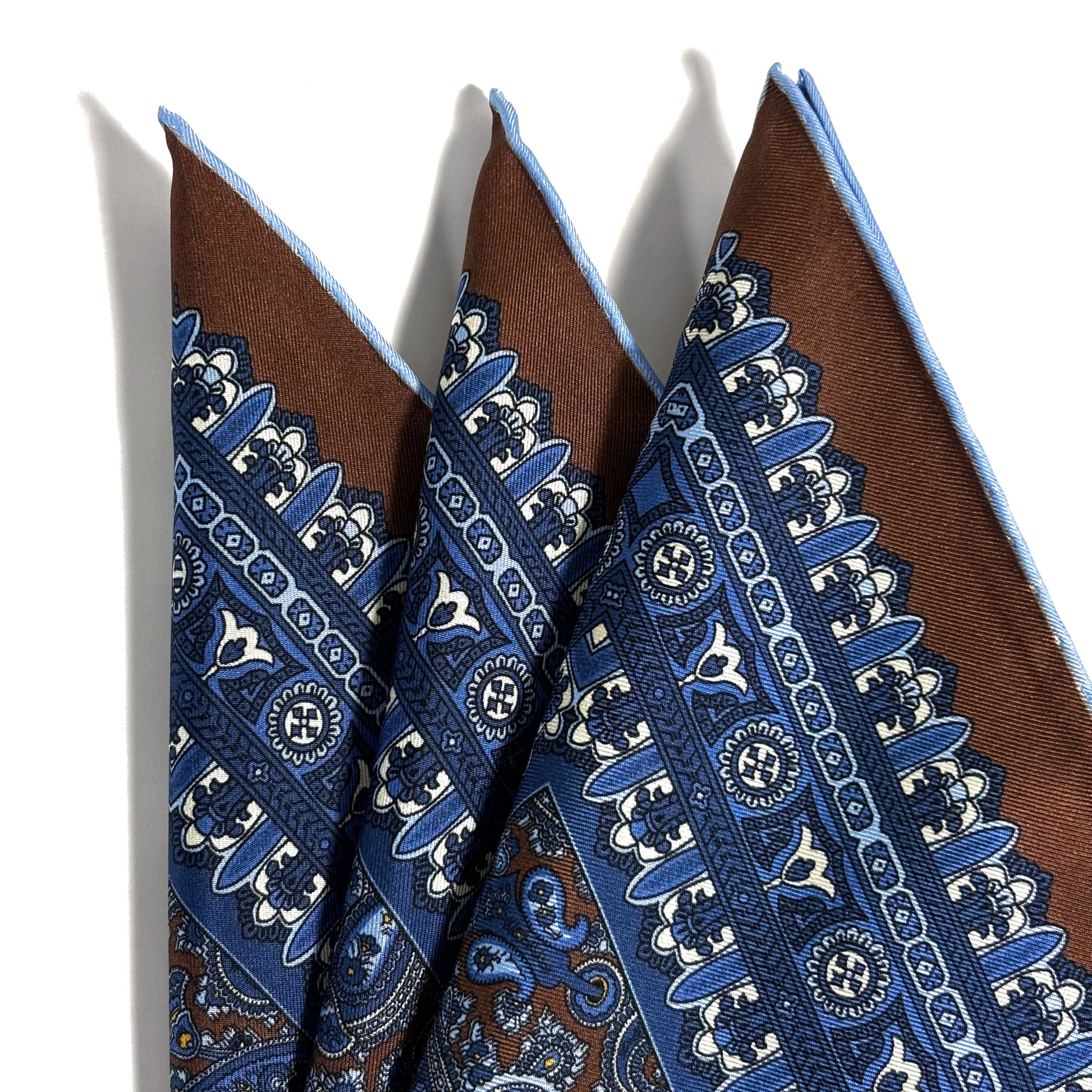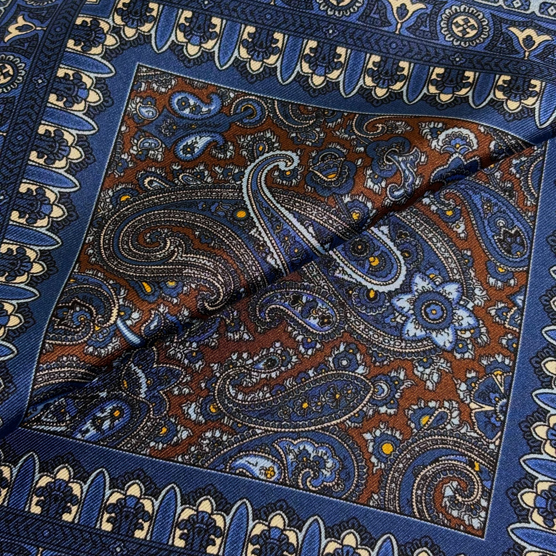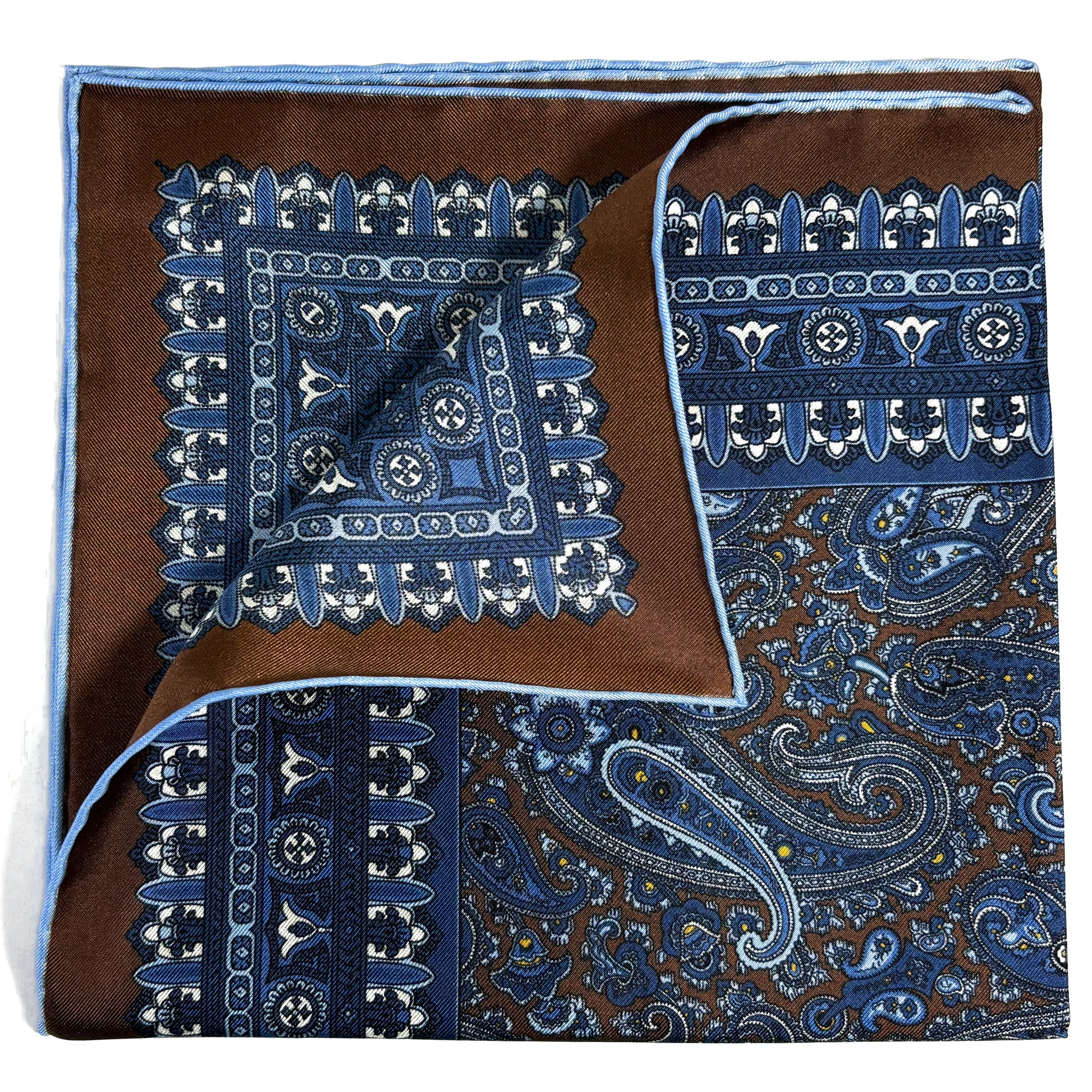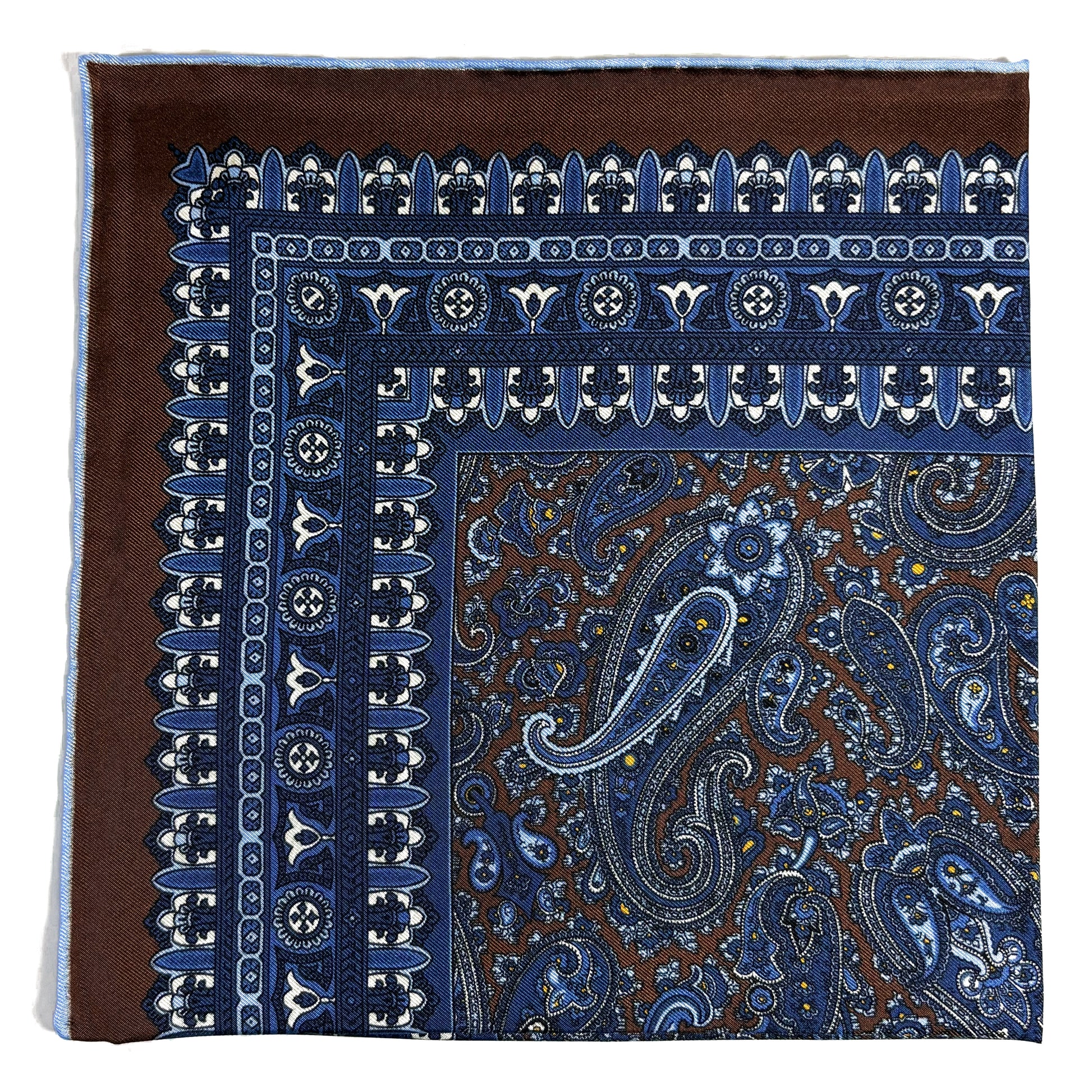 | A Timeless Silk Twill Pocket Square This design features a bold paisley pattern surrounded by a geometric frame, a solid border, and a shoestring edge.