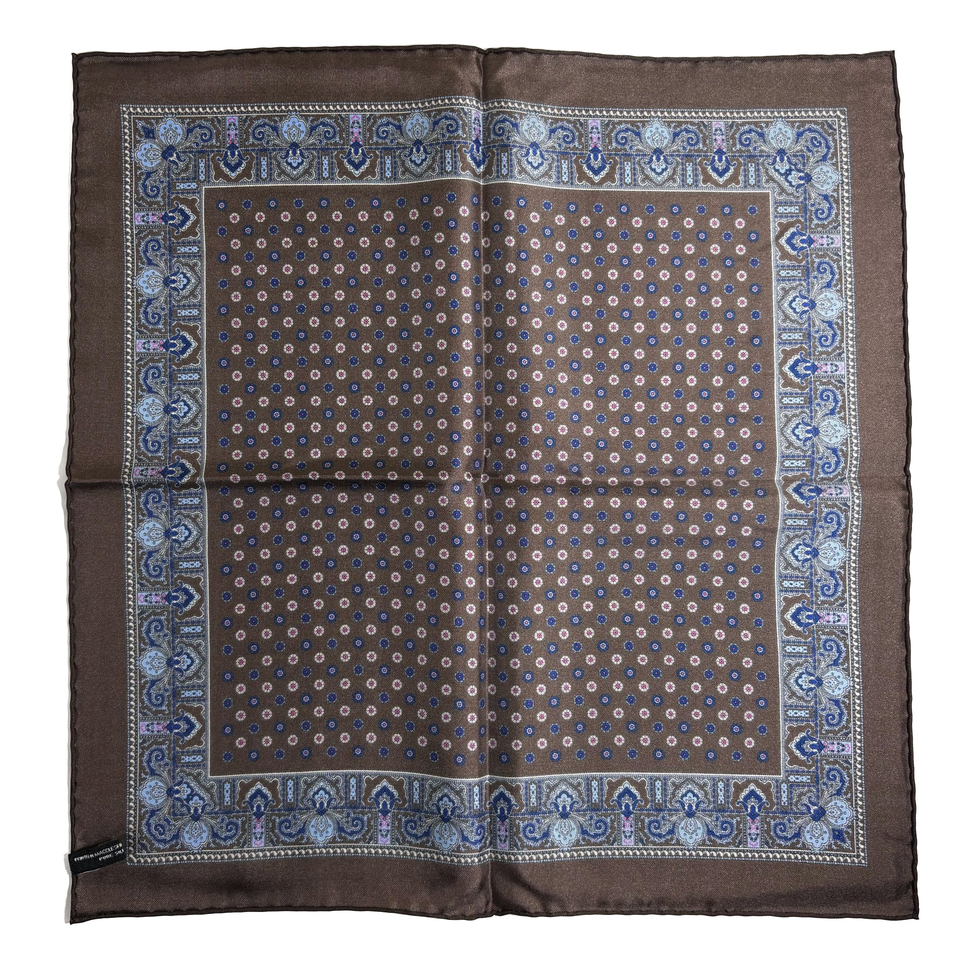 The designs were selected from a historic archive in Macclesfield, England with designs dating back hundreds of years. Each square was hand-sewn and printed in Macclesfield, ensuring a true British luxury product.