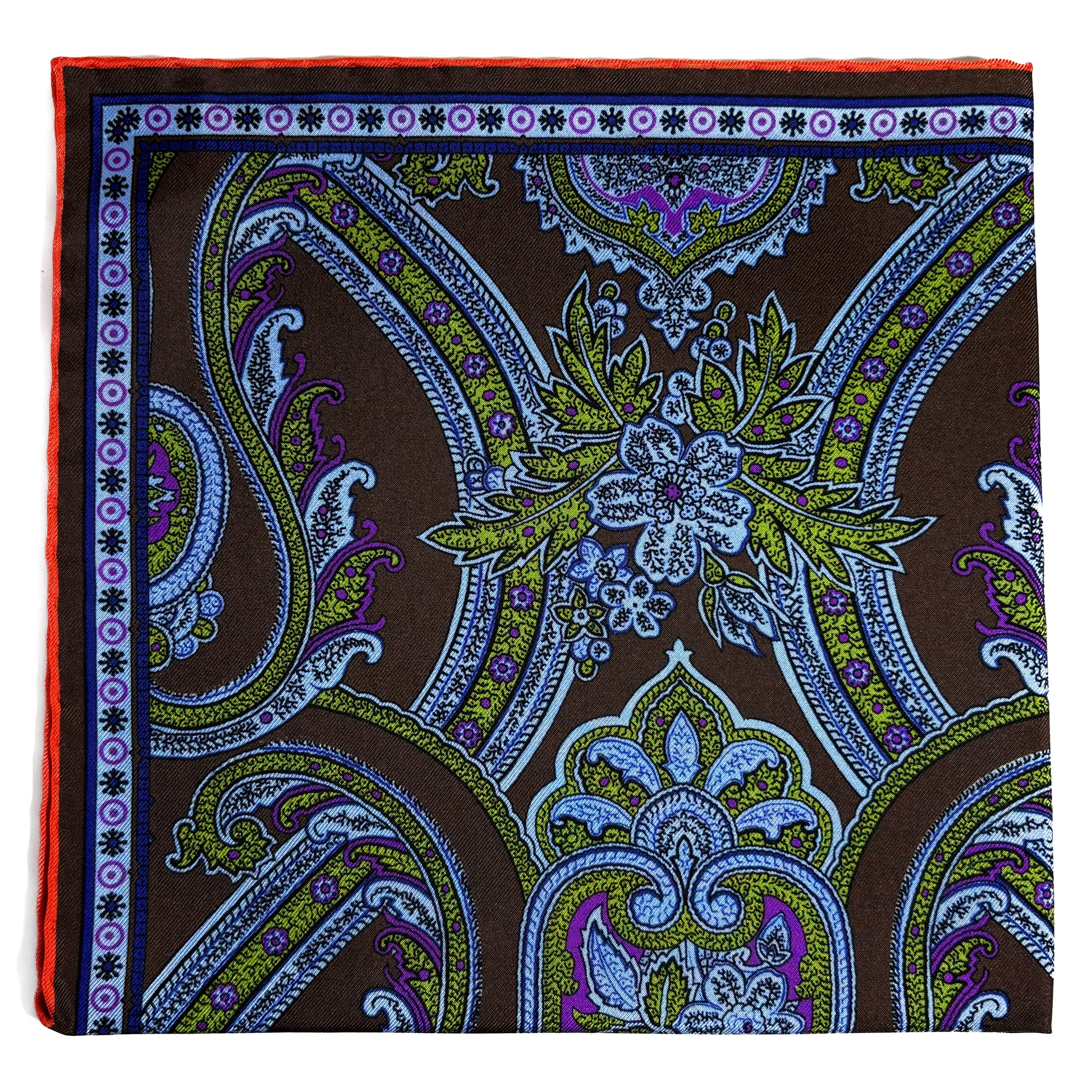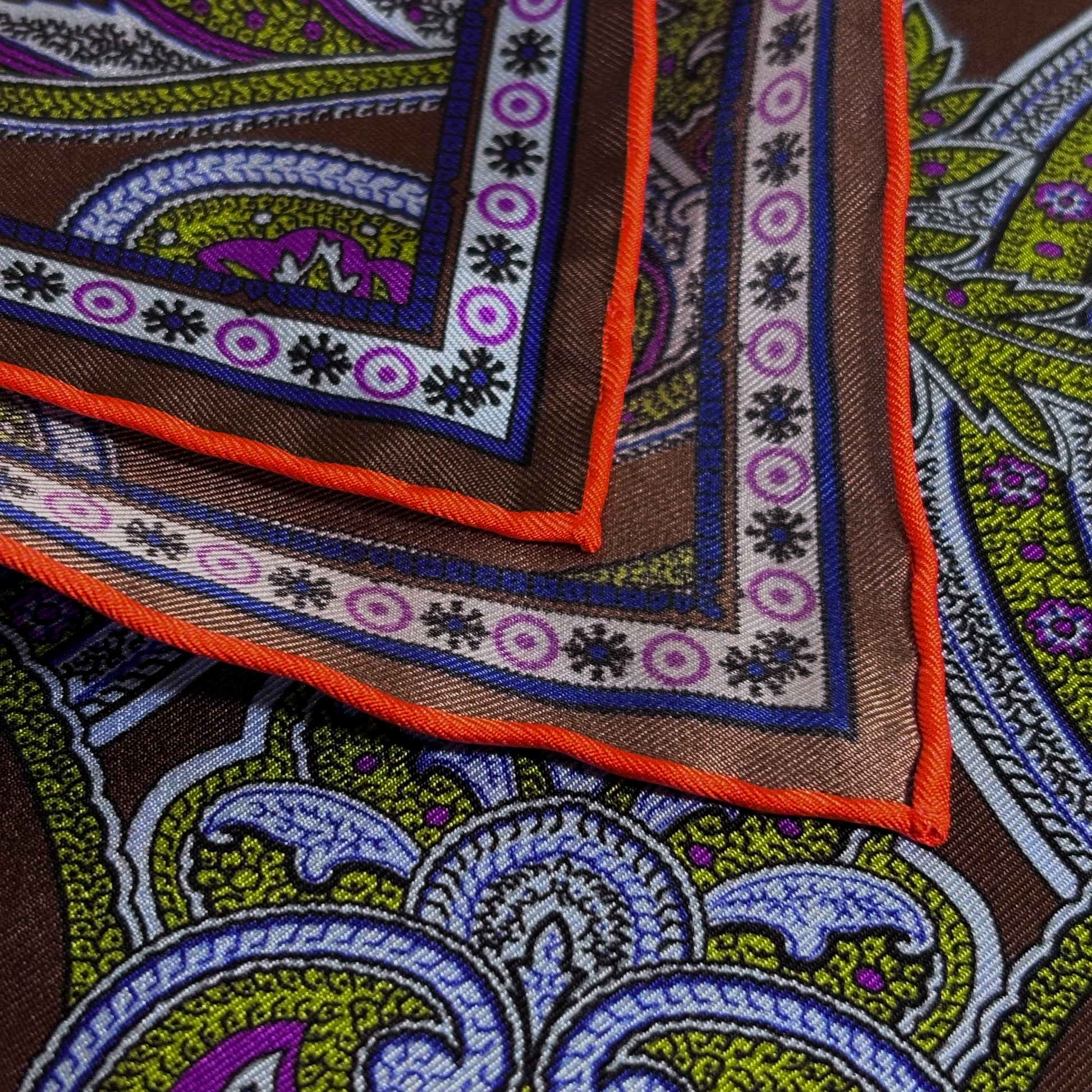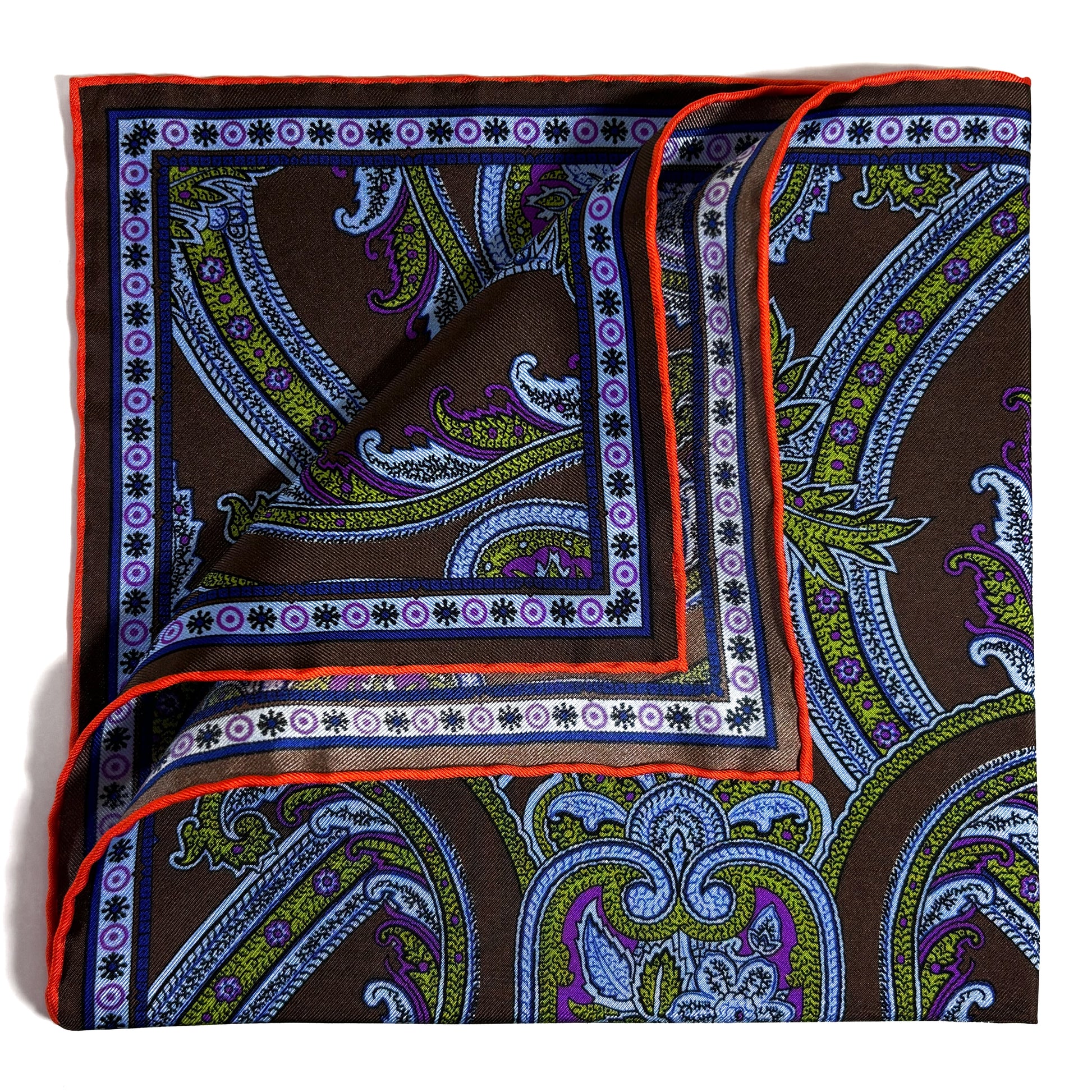 Crafted from 100% silk twill and handmade in England, this pocket square reflects the enduring legacy of British textile excellence. Produced in the historic town of Macclesfield—renowned for centuries of silk craftsmanship—each piece is hand-sewn with hand-rolled edges, offering refined structure and depth in every fold. Silk twill remains the gold standard for pocket squares, prized for its lightweight feel, rich dye absorption, and elegant sheen. The fabric is printed using a modern, eco-conscious method that delivers vibrant, double-sided color while minimizing waste. Measuring 16 inches across, this square is carefully sized to stay in place throughout the day, no matter how it's folded. An understated staple of timeless menswear, made with precision and purpose. |