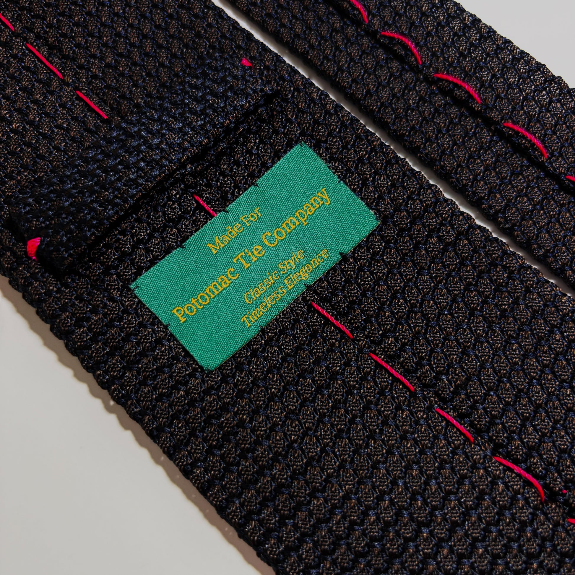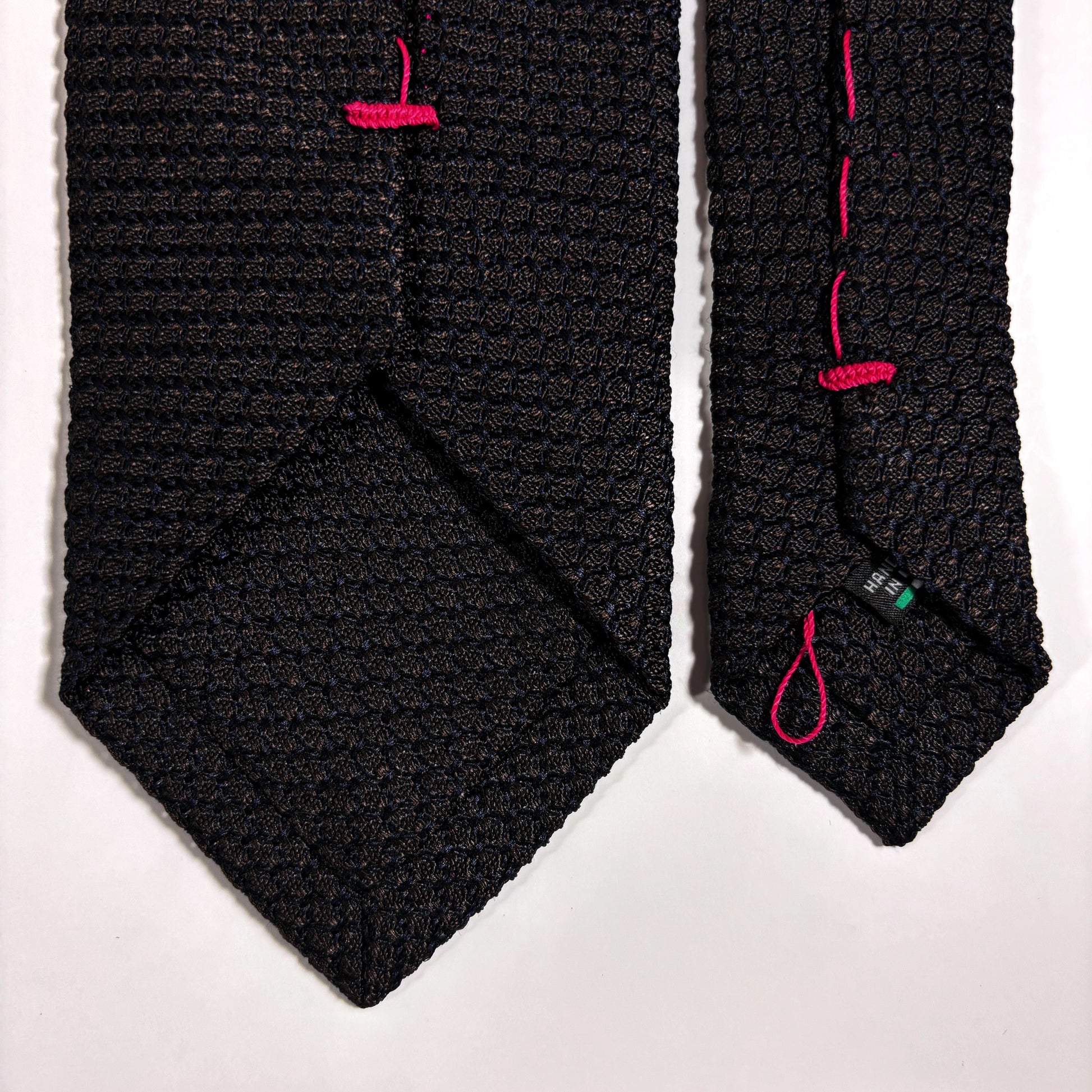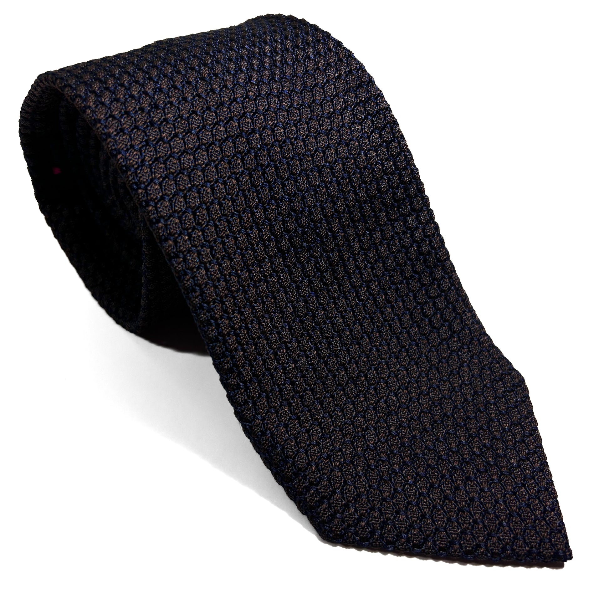 This variant of grenadine is called "Garza Grossa", often called Large Knot Grenadine. This variant is characterized by its large weave that somewhat resembles a knit tie. The added texture increases the depth of color and adds a sense of character to an otherwise simple design.