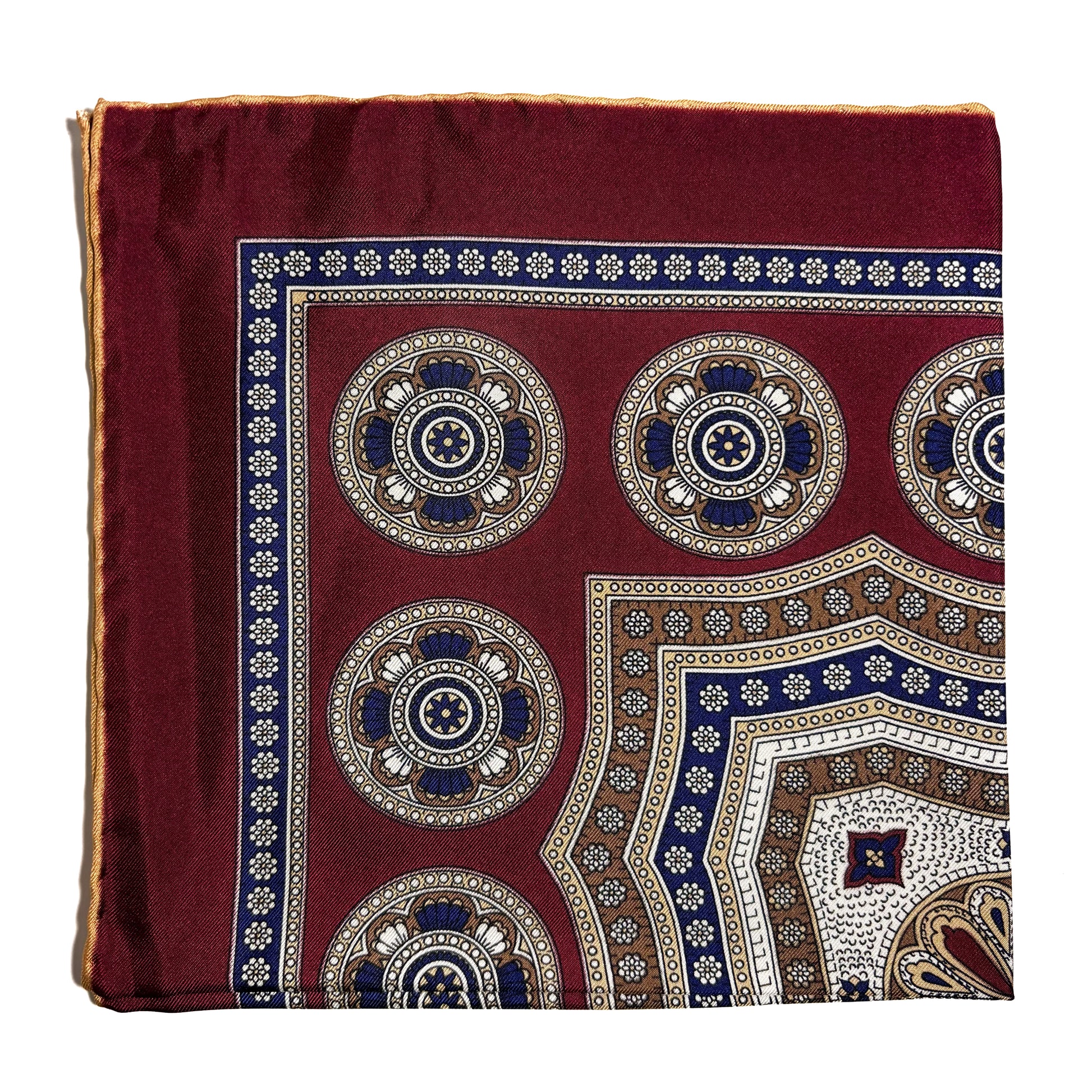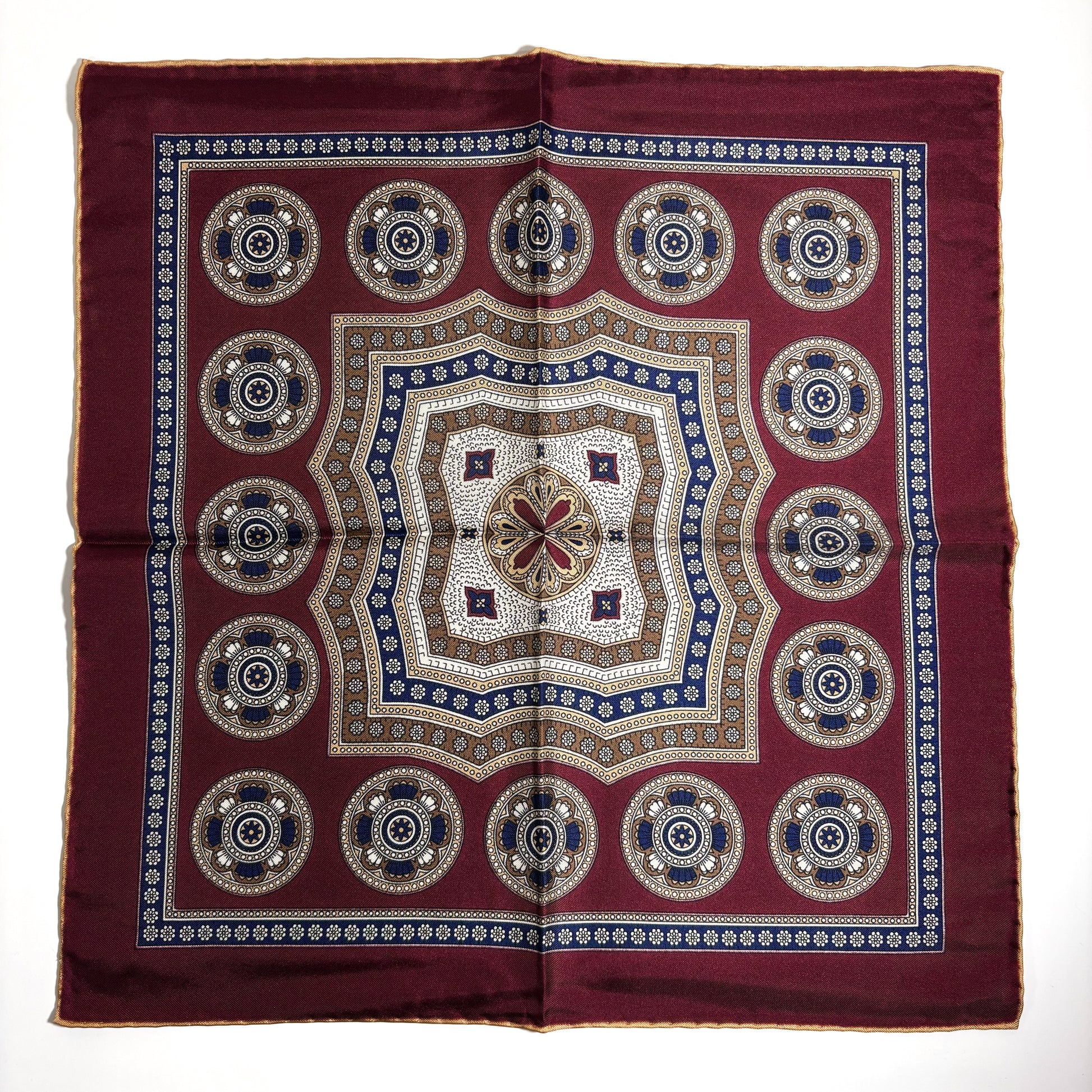 | A Timeless Silk Twill Pocket Square This design features a bold center medallion with smaller geometric ornaments dancing around the center, a solid border and a shoestring edge.