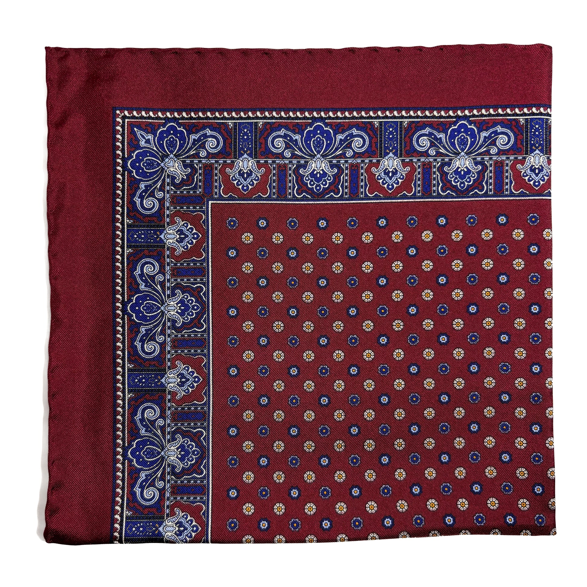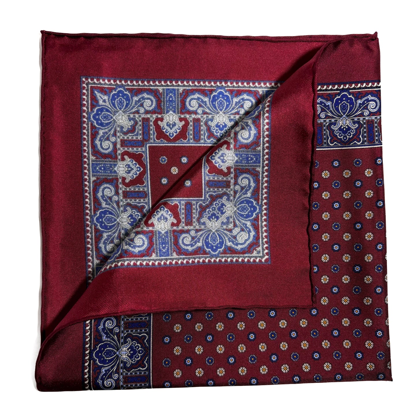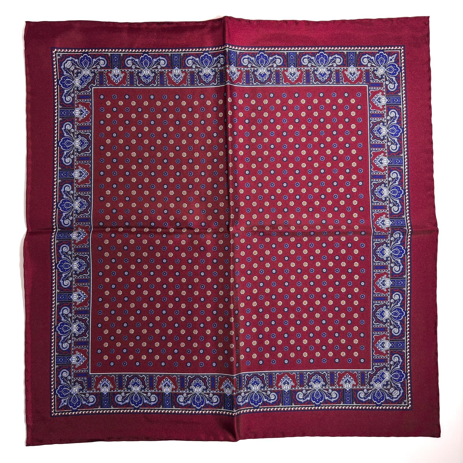 The designs were selected from a historic archive in Macclesfield, England with designs dating back hundreds of years. Each square was hand-sewn and printed in Macclesfield, ensuring a true British luxury product.