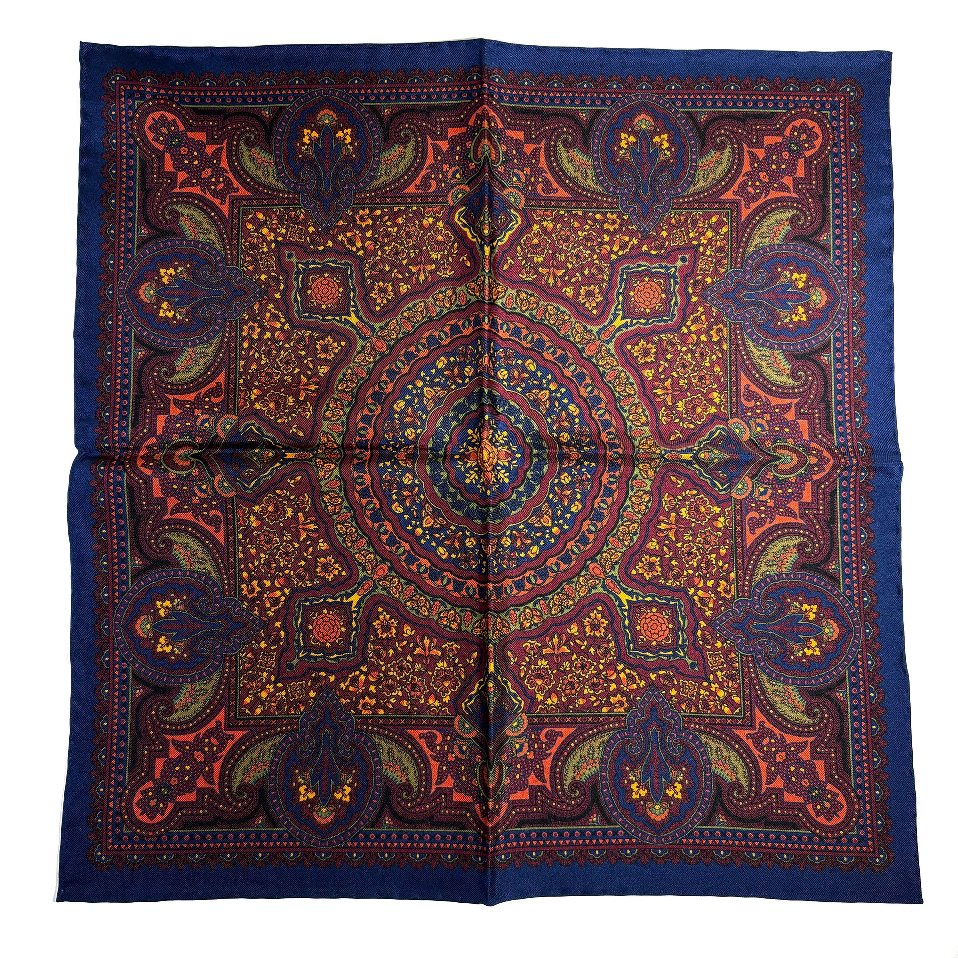 A Timeless Silk Twill Pocket Square This design features a bold center medallion with smaller geometric ornaments dancing around the center, a solid border and a shoestring edge.