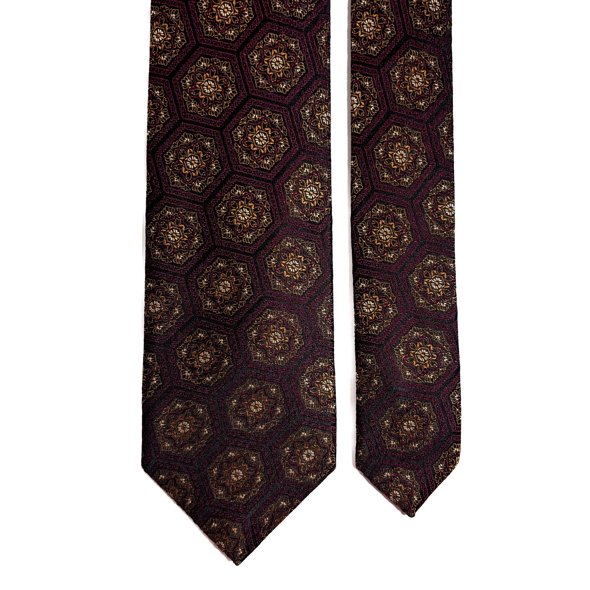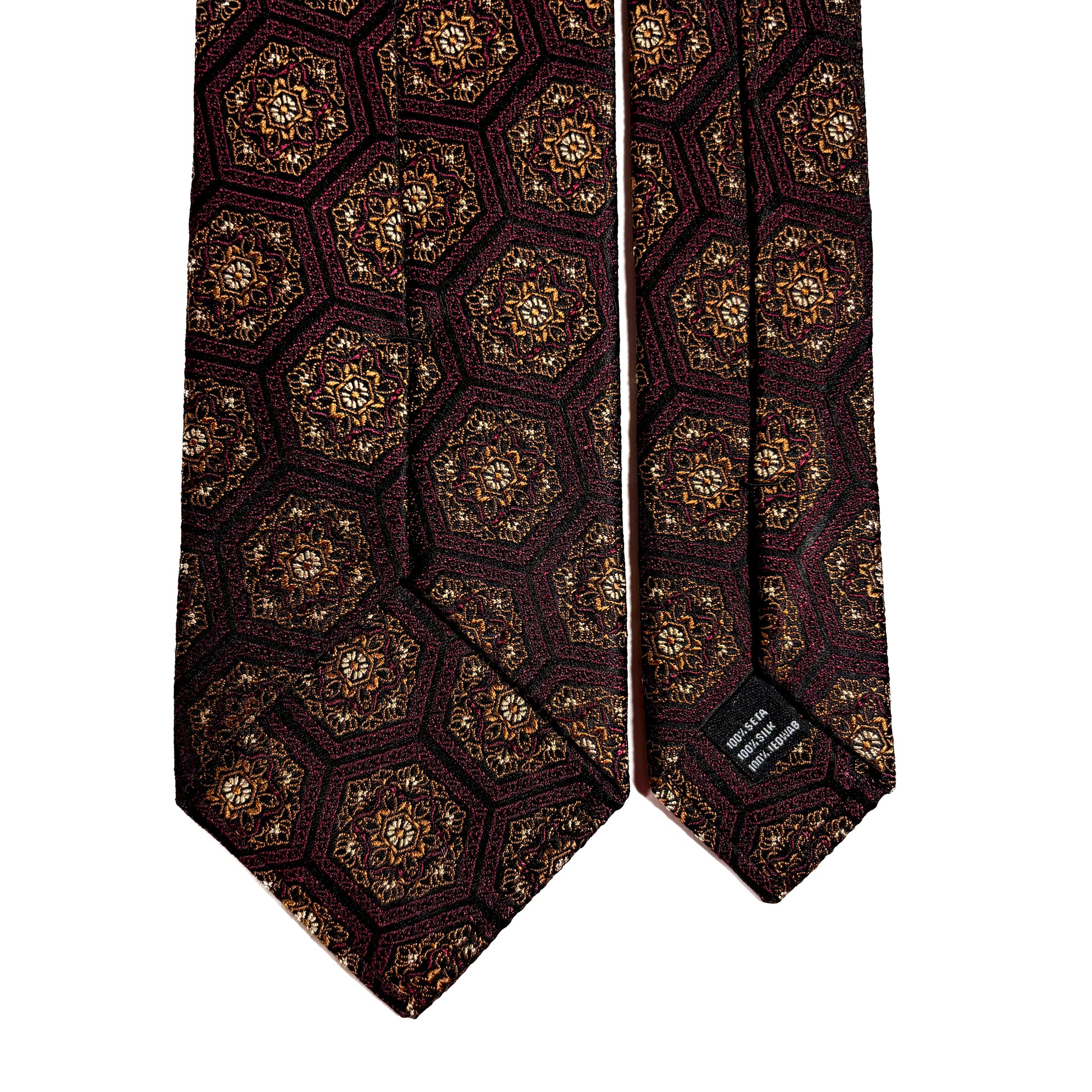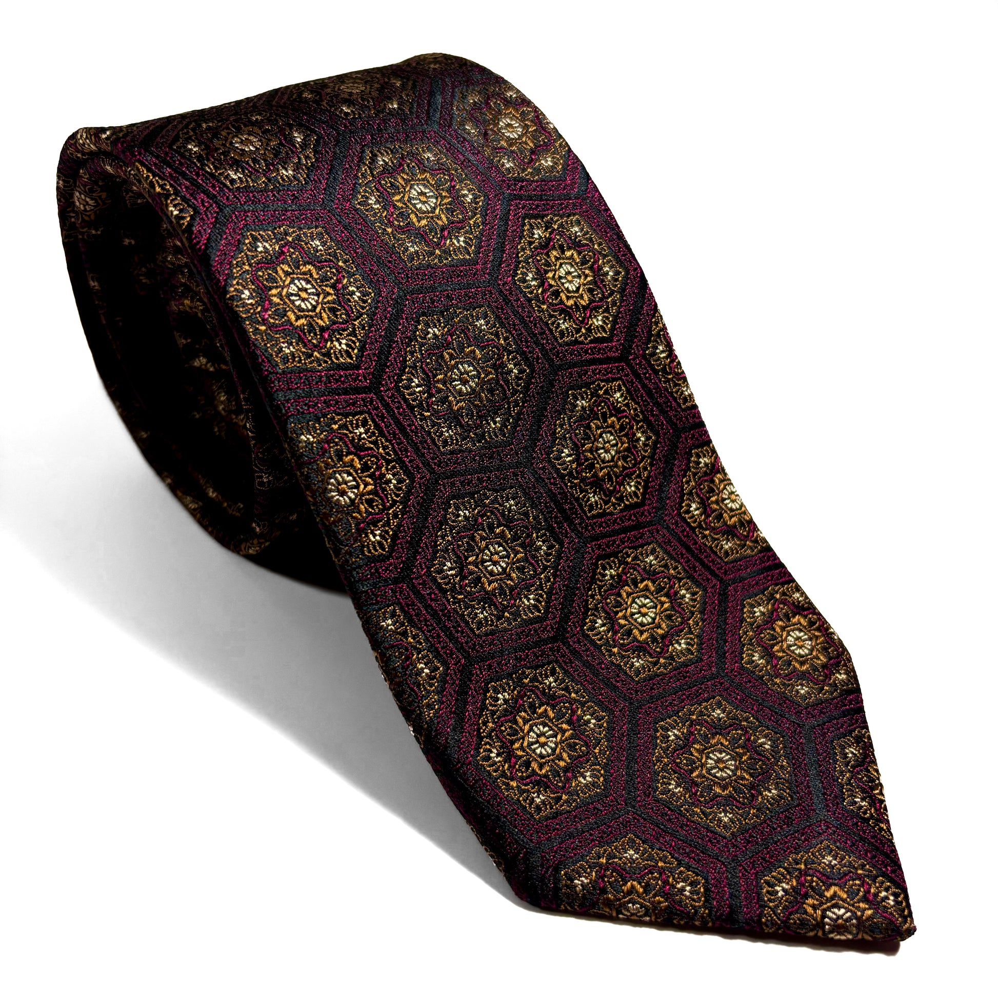 A Beautiful Silk Jacquard Tie w/ a Rich Burgundy & Gold Hexagonal Medallion & Black Outline.