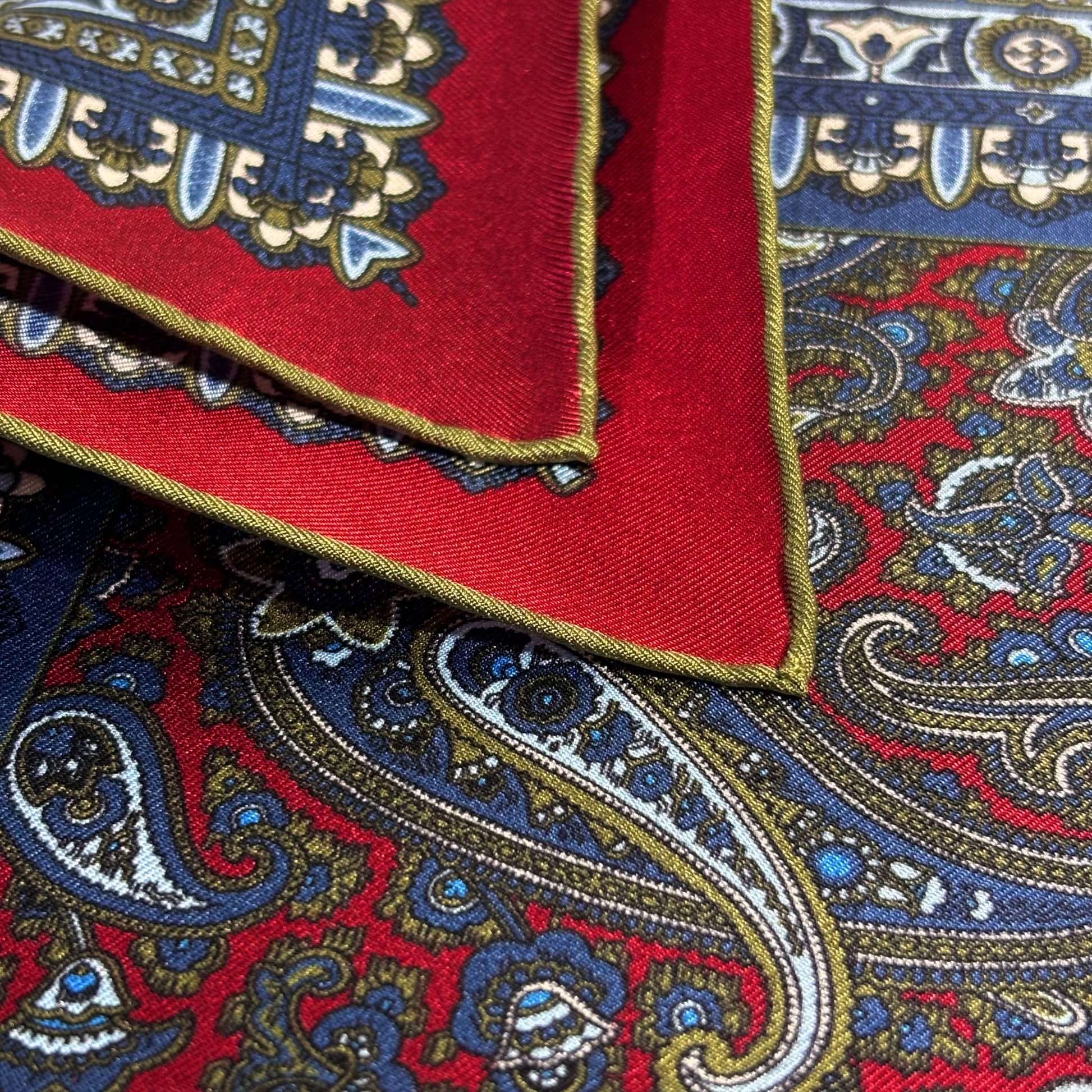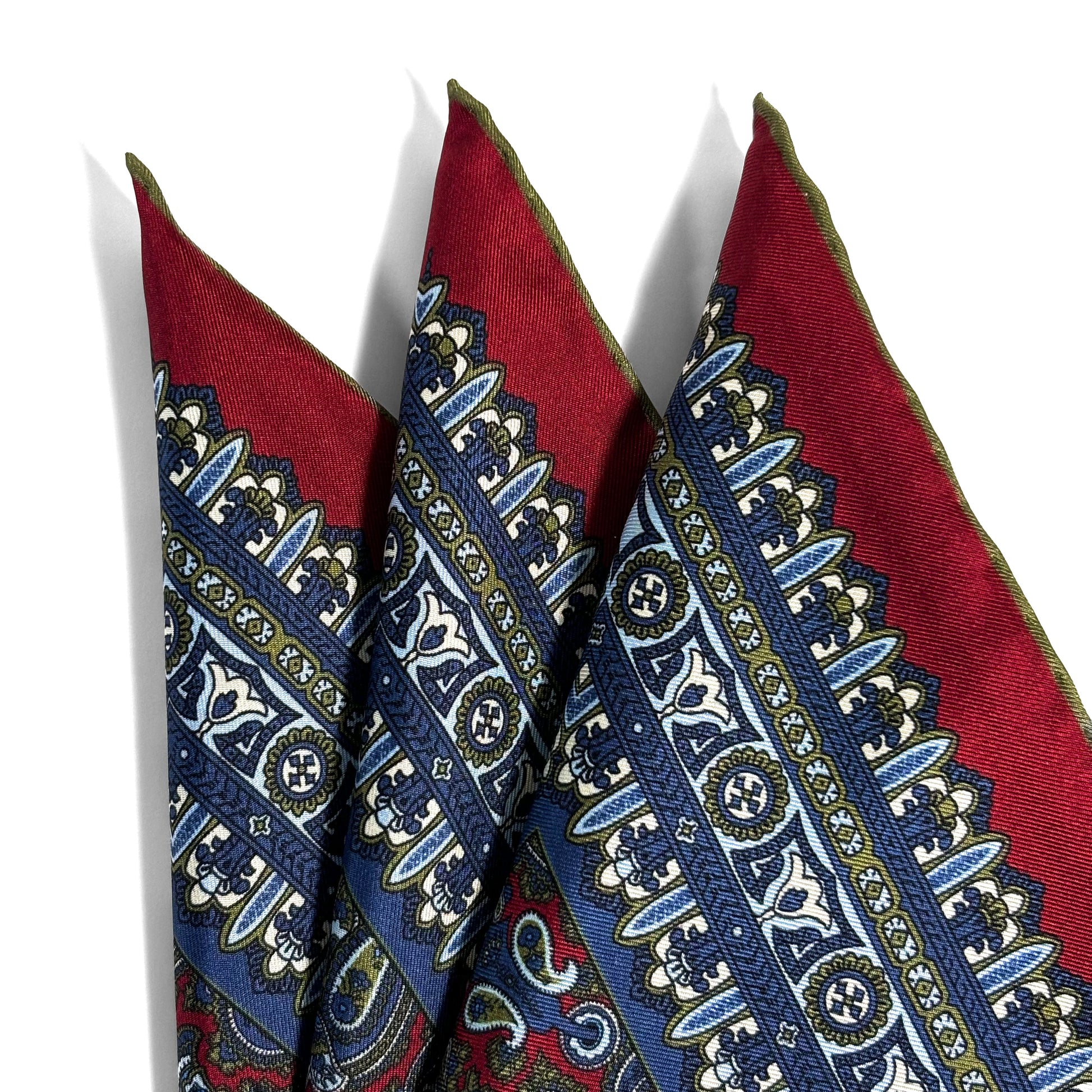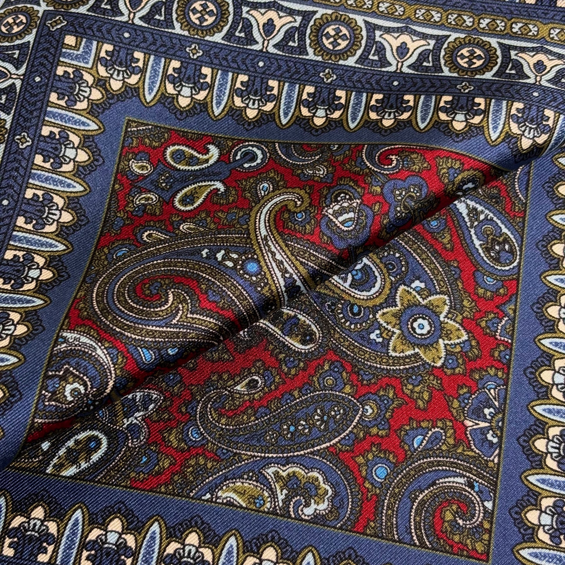 | A Timeless Silk Twill Pocket Square This design features a bold paisley pattern surrounded by a geometric frame, a solid border, and a shoestring edge.