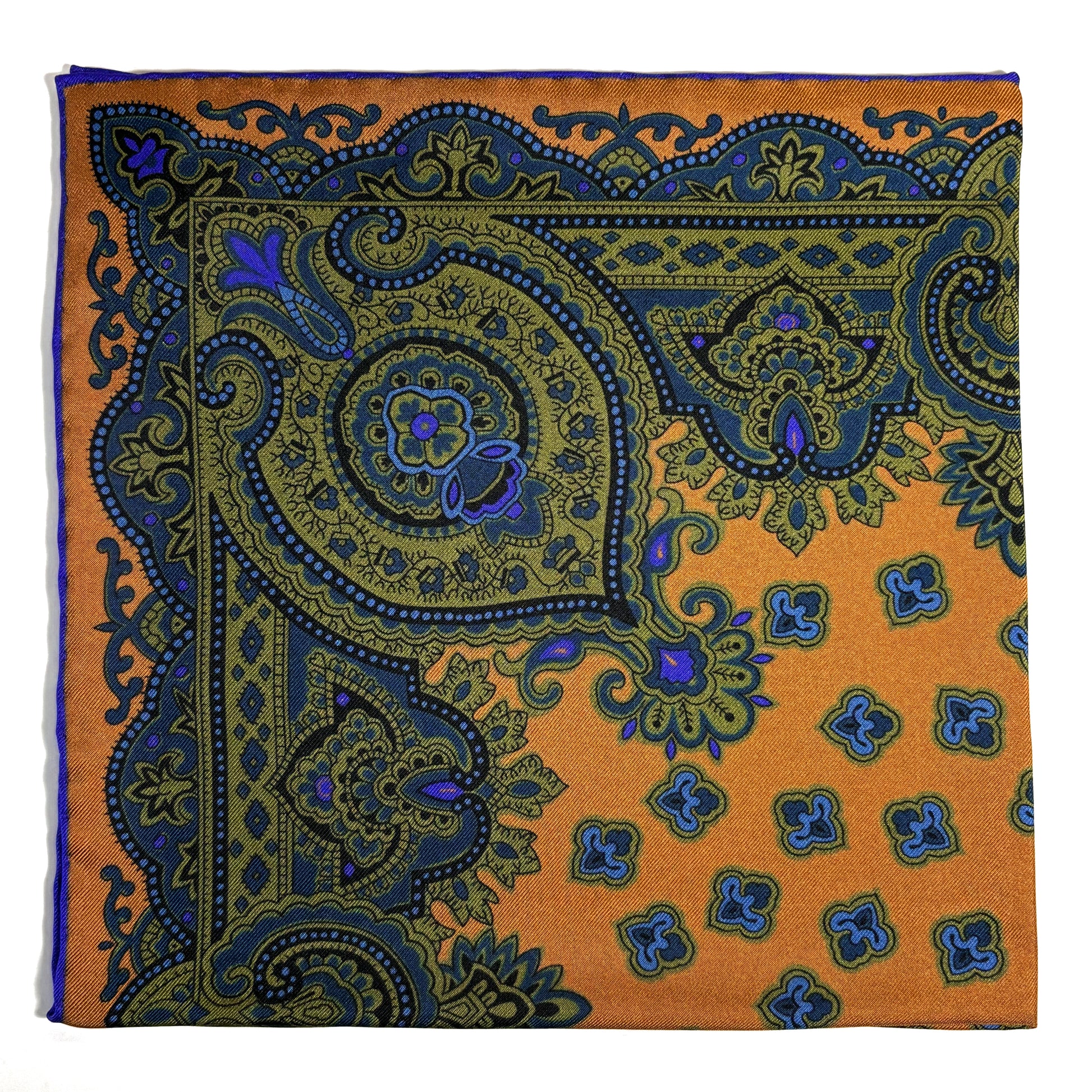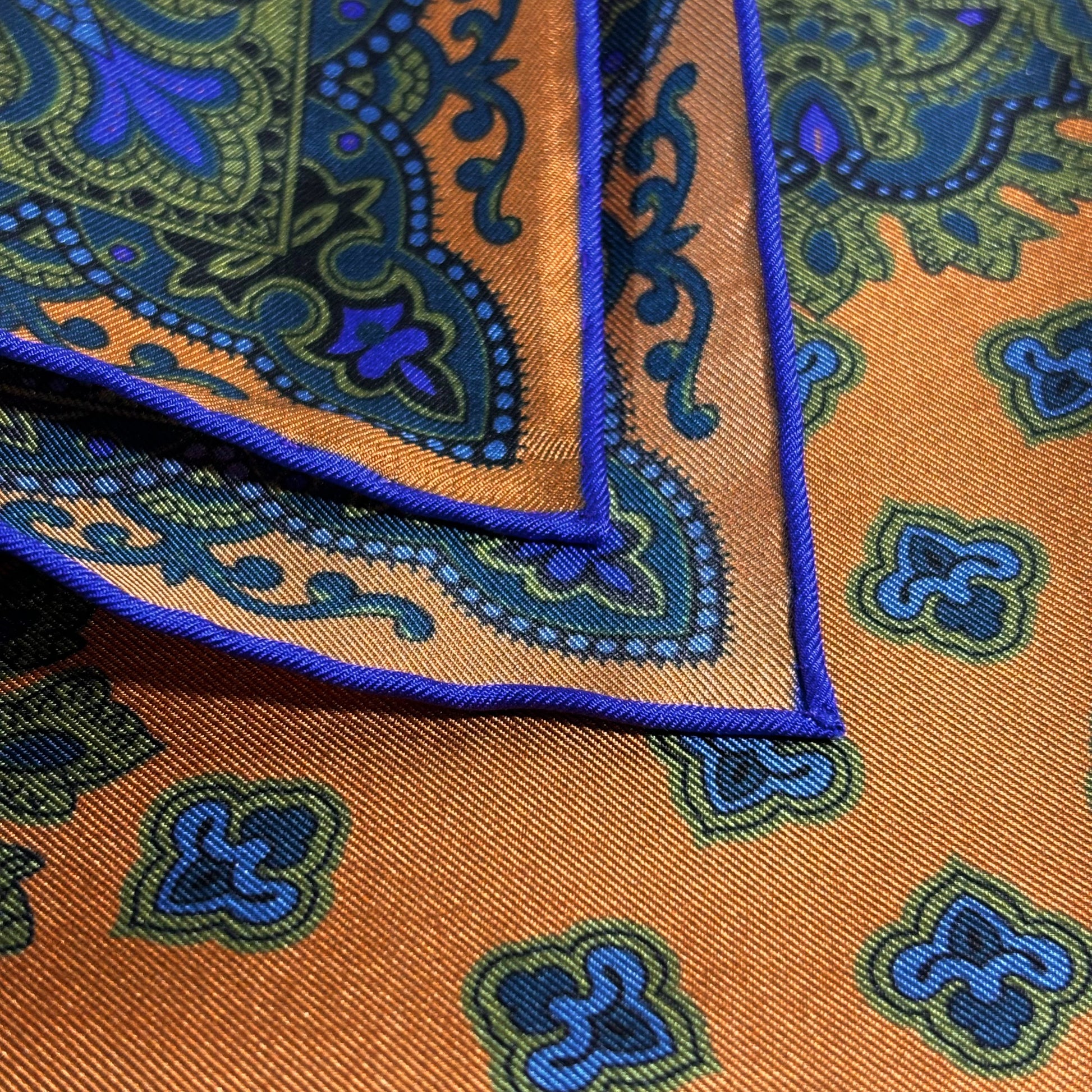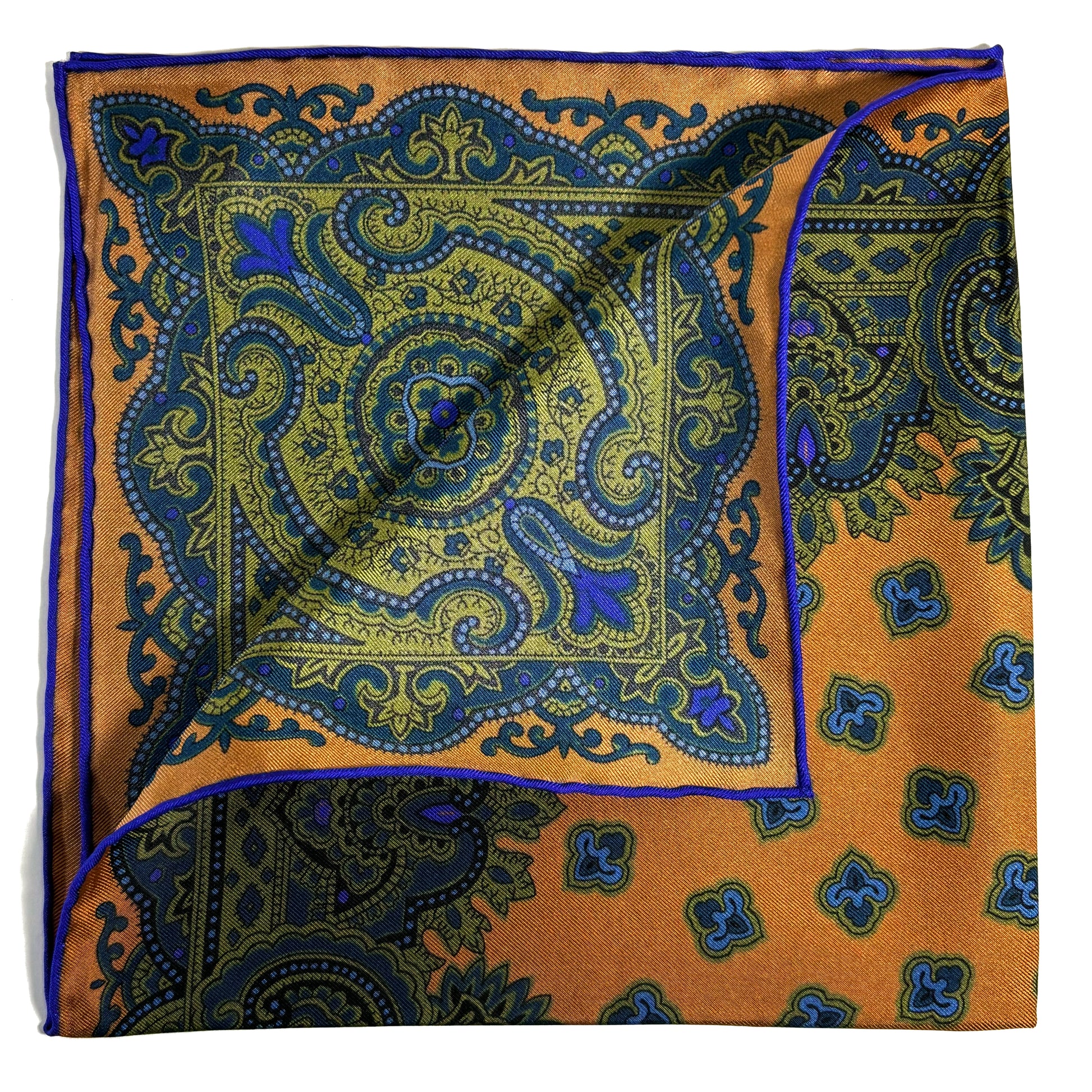 Burnt Orange & Olive Green Medallion Ancient Madder Silk Pocket Square