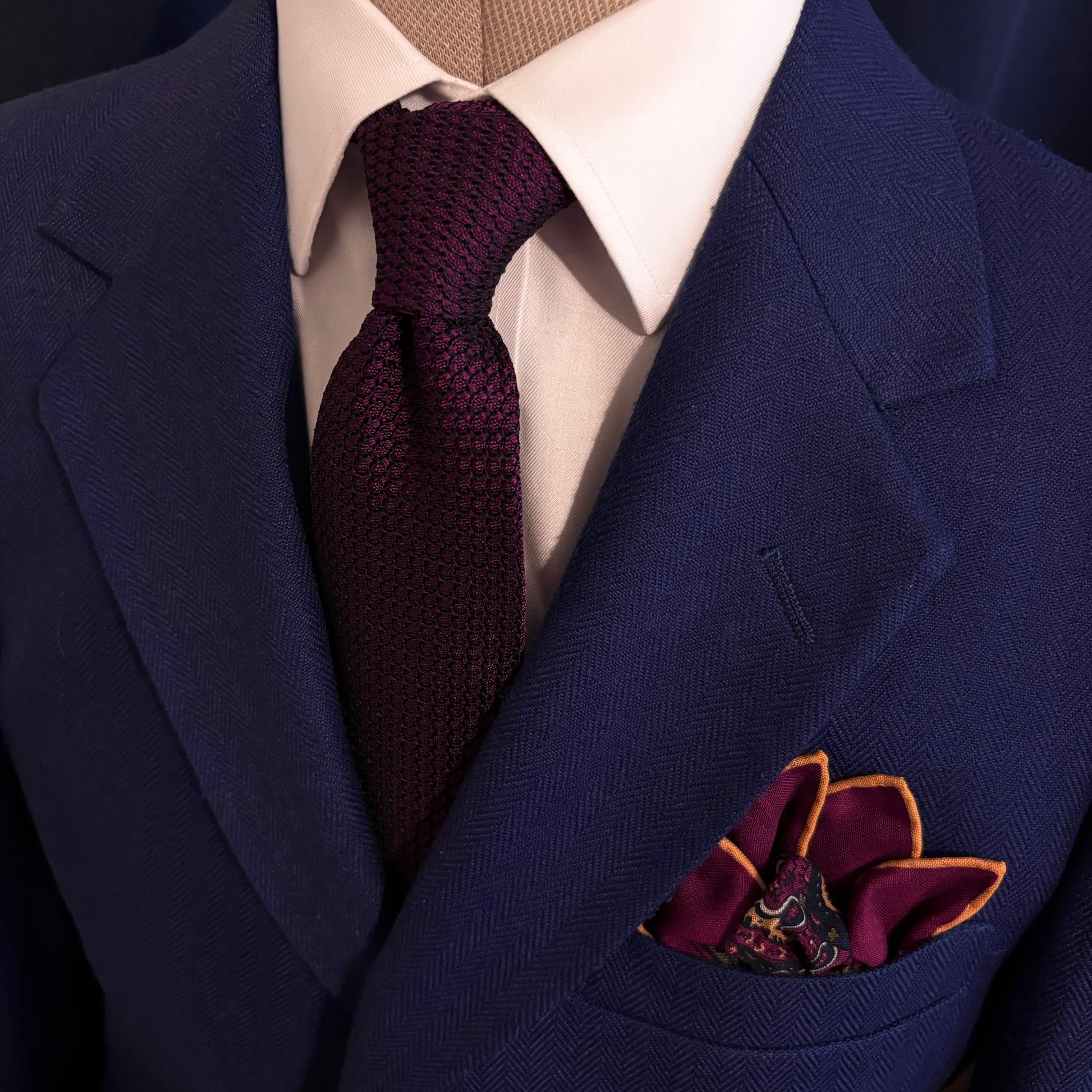 Because of it's unique texture, wool/silk squares can pair with fabrics of all formalities, ranging from classic business suits to casual tweed sport coats.