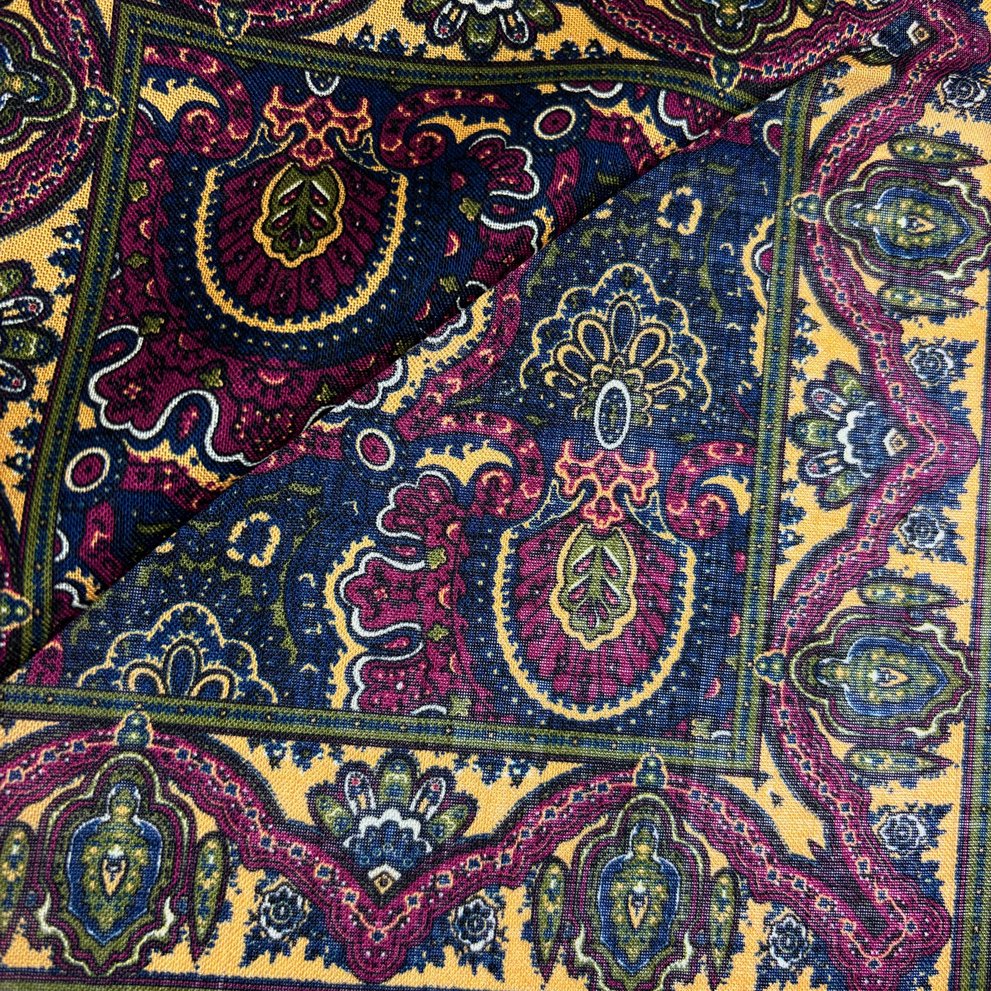 The designs were selected from a historic archive in Macclesfield, England with designs dating back hundreds of years. Each square was hand-sewn and printed in Macclesfield, ensuring a true British luxury product.