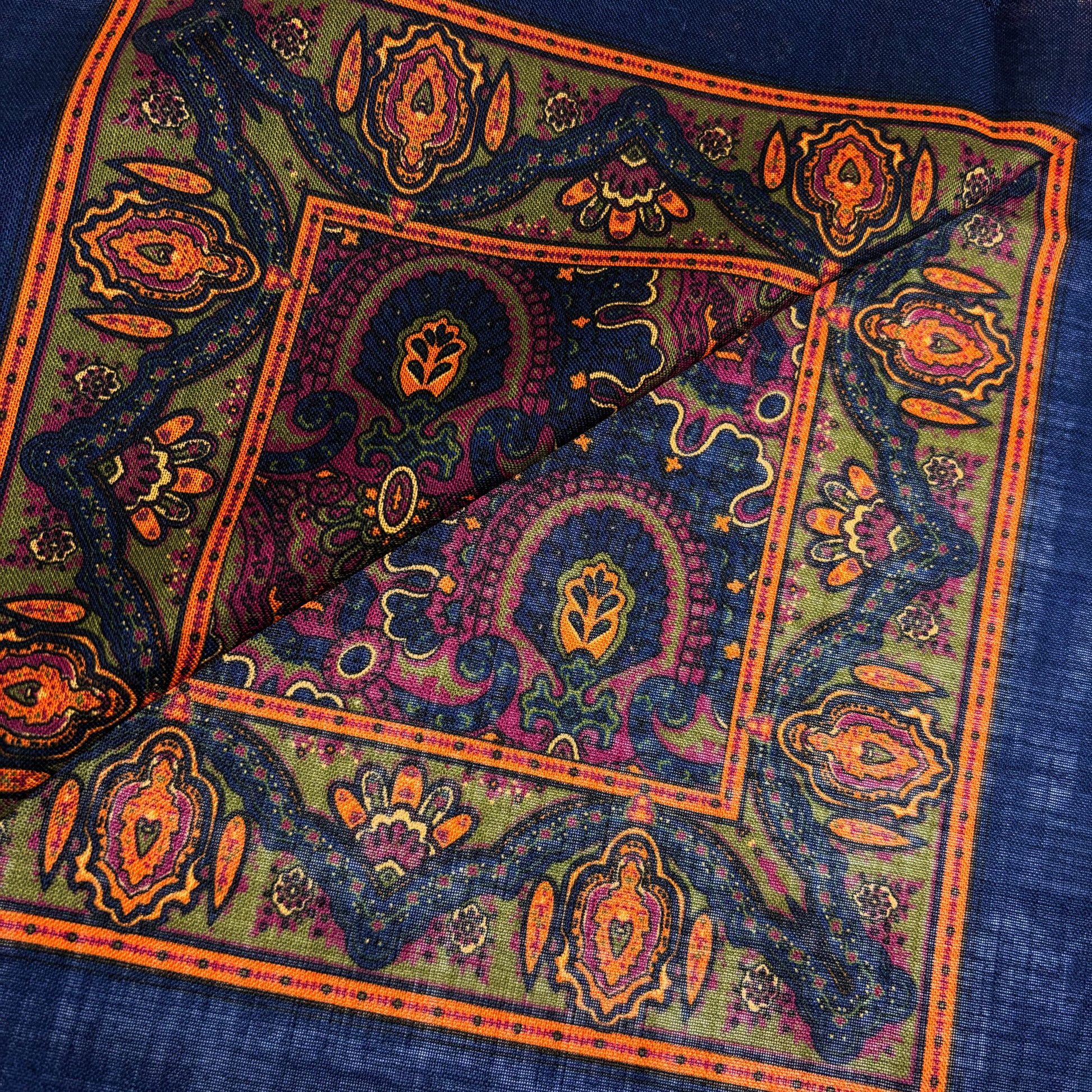The designs were selected from a historic archive in Macclesfield, England with designs dating back hundreds of years. Each square was hand-sewn and printed in Macclesfield, ensuring a true British luxury product.
