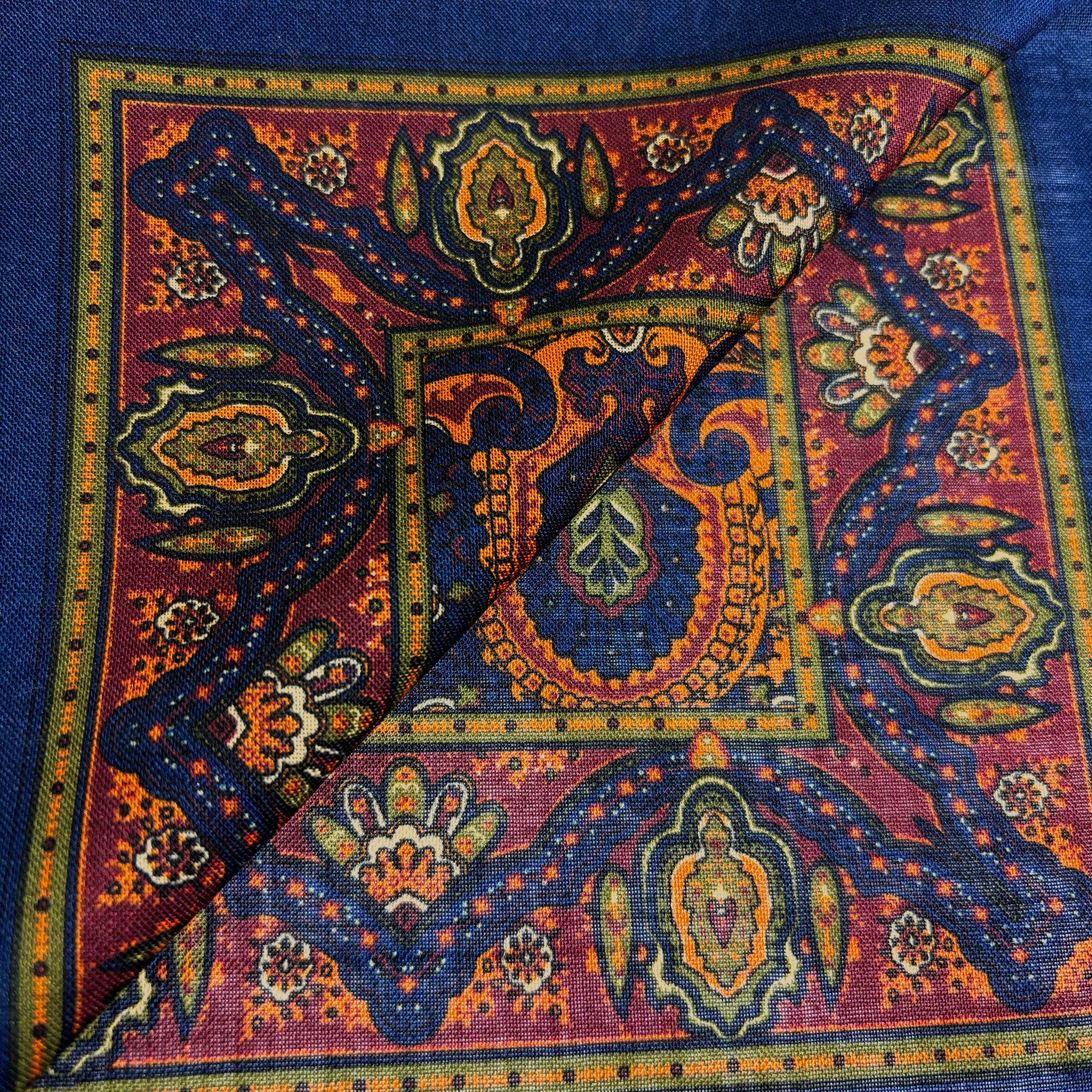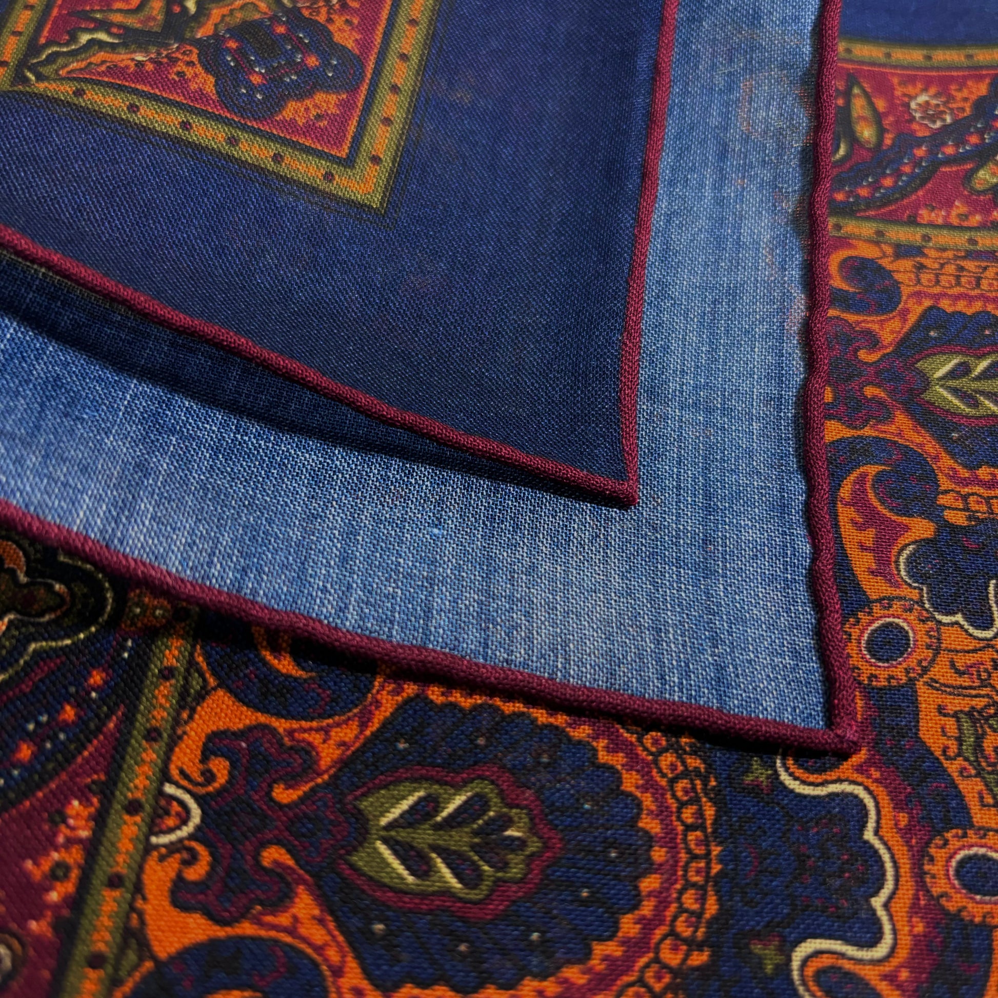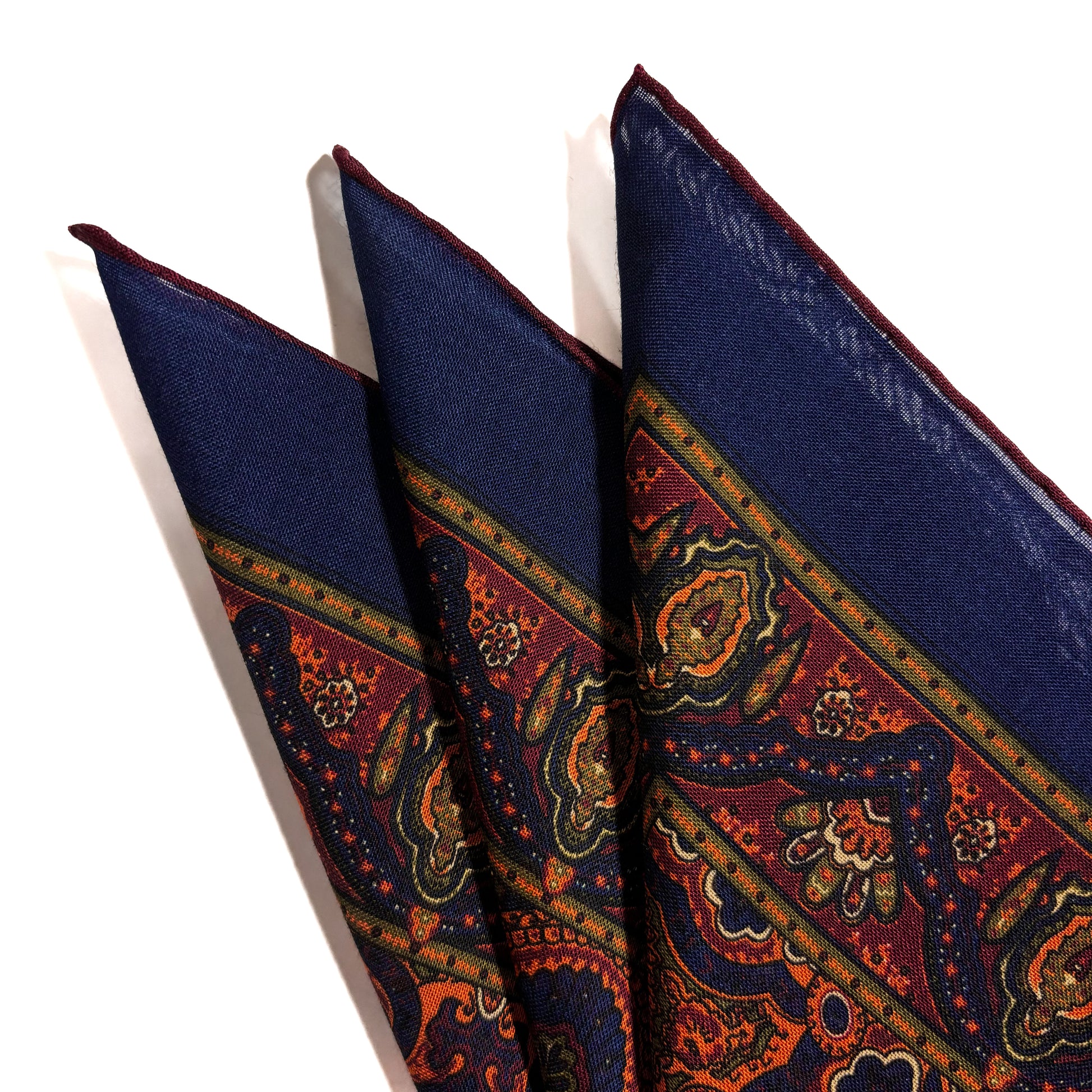 The designs were selected from a historic archive in Macclesfield, England with designs dating back hundreds of years. Each square was hand-sewn and printed in Macclesfield, ensuring a true British luxury product.