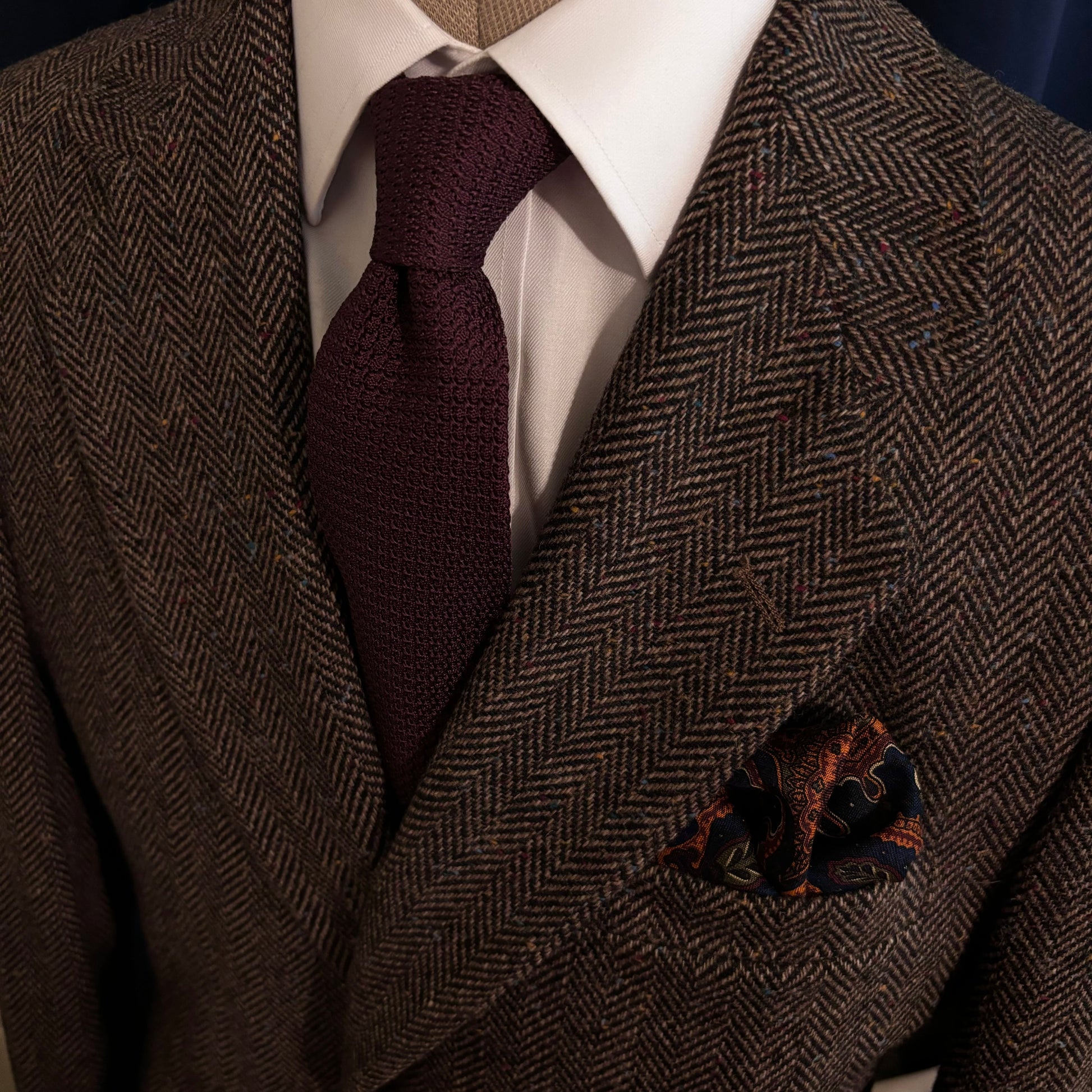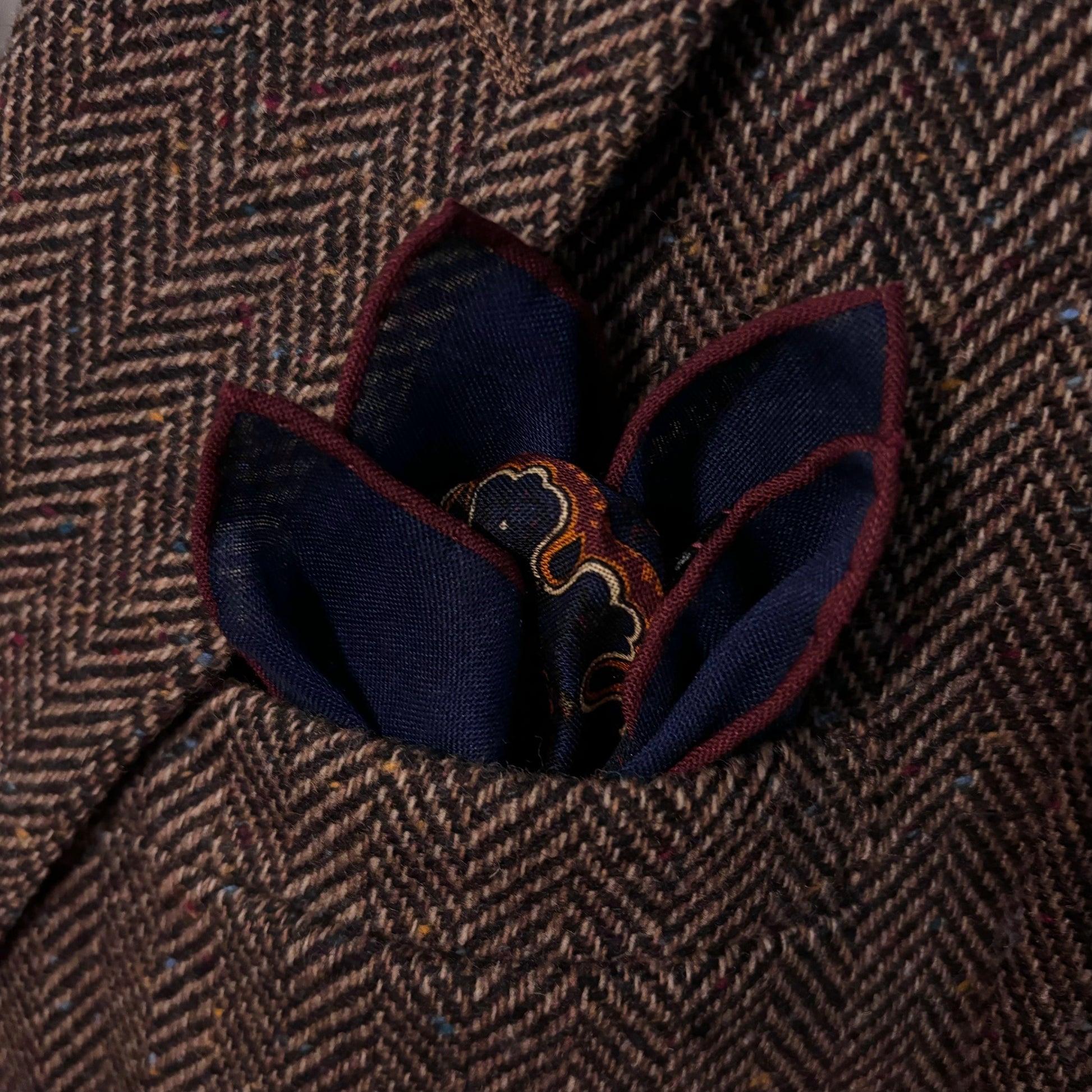 Because of it's unique texture, wool/silk squares can pair with fabrics of all formalities, ranging from classic business suits to casual tweed sport coats.