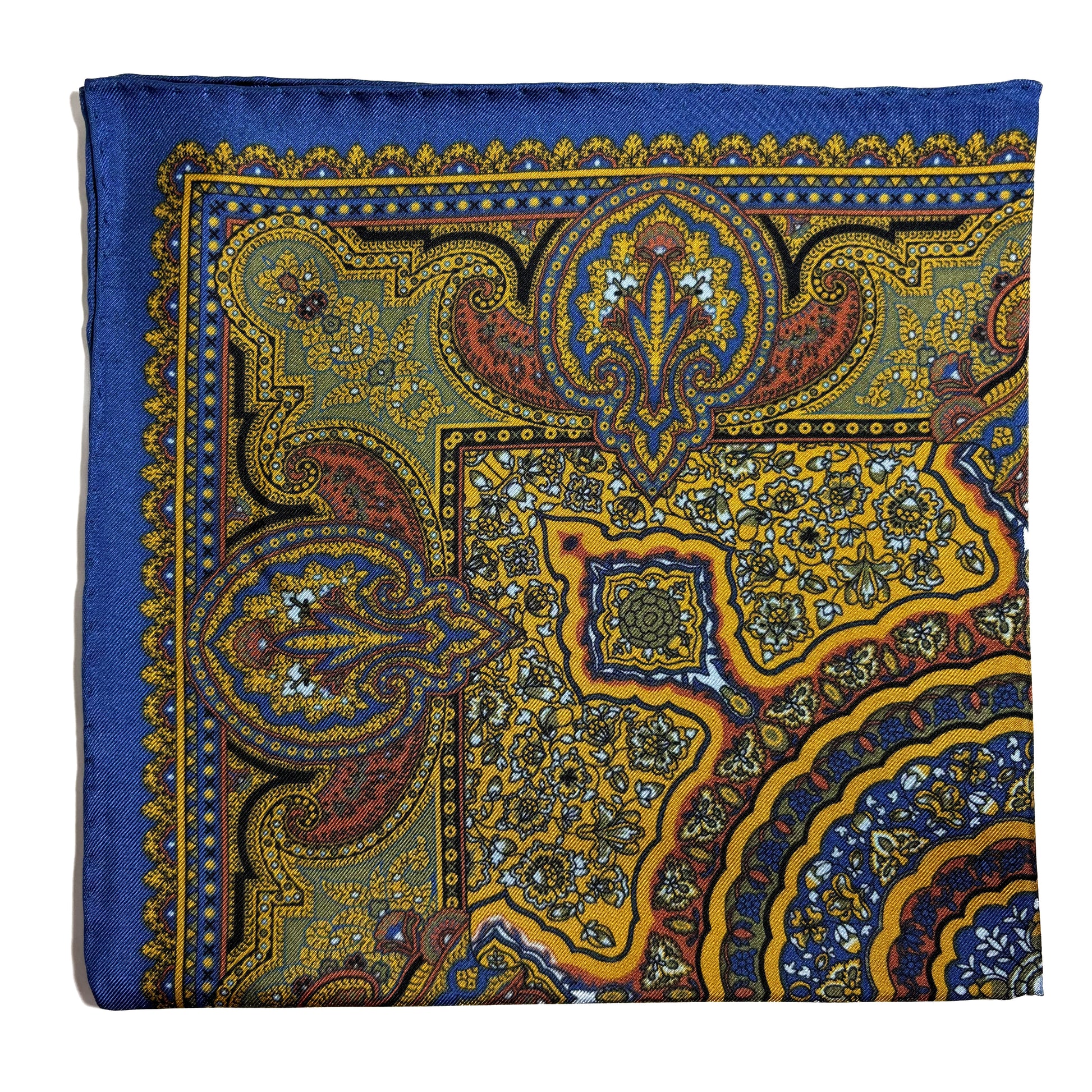 The designs were selected from a historic archive in Macclesfield, England with designs dating back hundreds of years. Each square was hand-sewn and printed in Macclesfield, ensuring a true British luxury product.