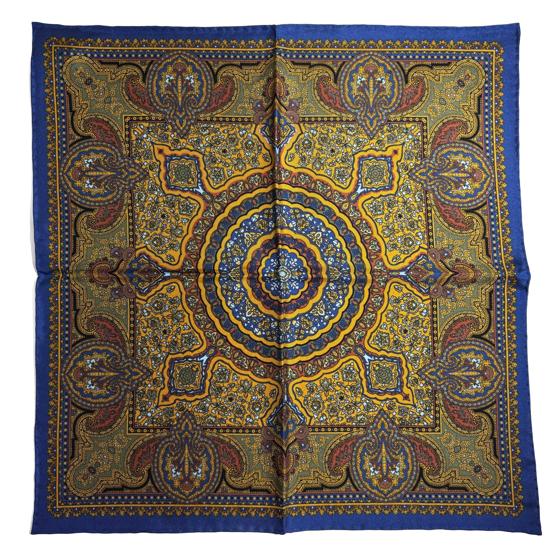 | A Timeless Silk Twill Pocket Square This design features a bold center medallion with smaller geometric ornaments dancing around the center, a solid border and a shoestring edge.