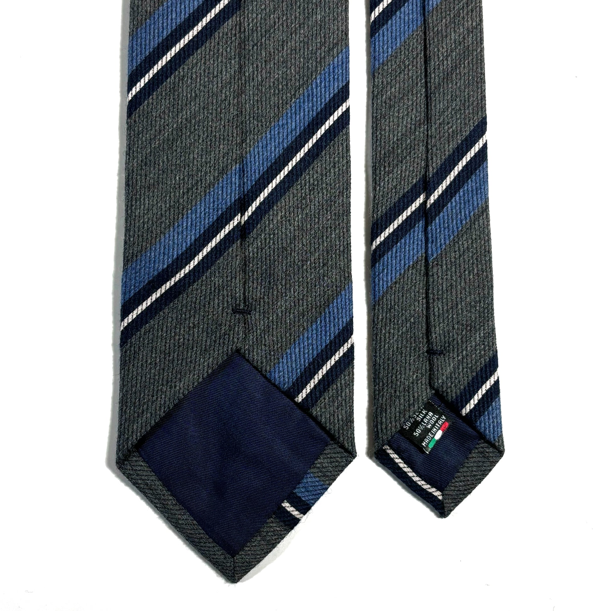 A Sophisticated Wool/Silk Tie Wool/Silk ties are an underrated classic of menswear that combines the shine and flexibility of silk, with the texture and softness of wool. This fabric features a soft texture, giving it a relaxed look that is perfect for the fall/winter months! It was woven in Como, Italy, and hand-sewn by our tailor in Italy. We recommend wearing this tie with a navy blue or gray suit to bring out its qualities.
