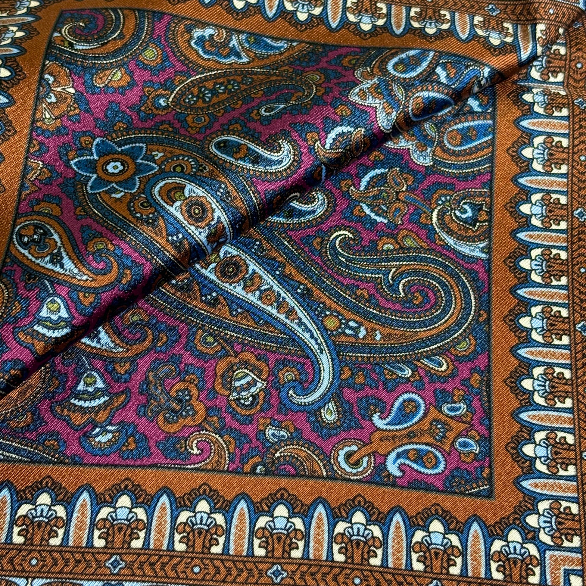 | A Timeless Silk Twill Pocket Square This design features a bold paisley pattern surrounded by a geometric frame, a solid border, and a shoestring edge.