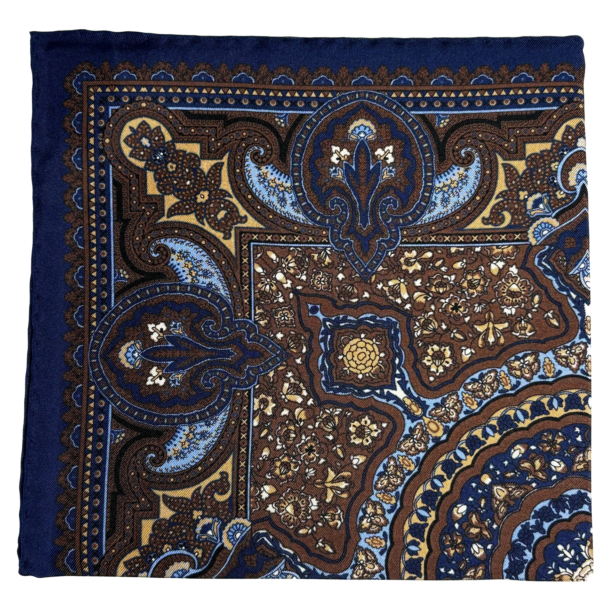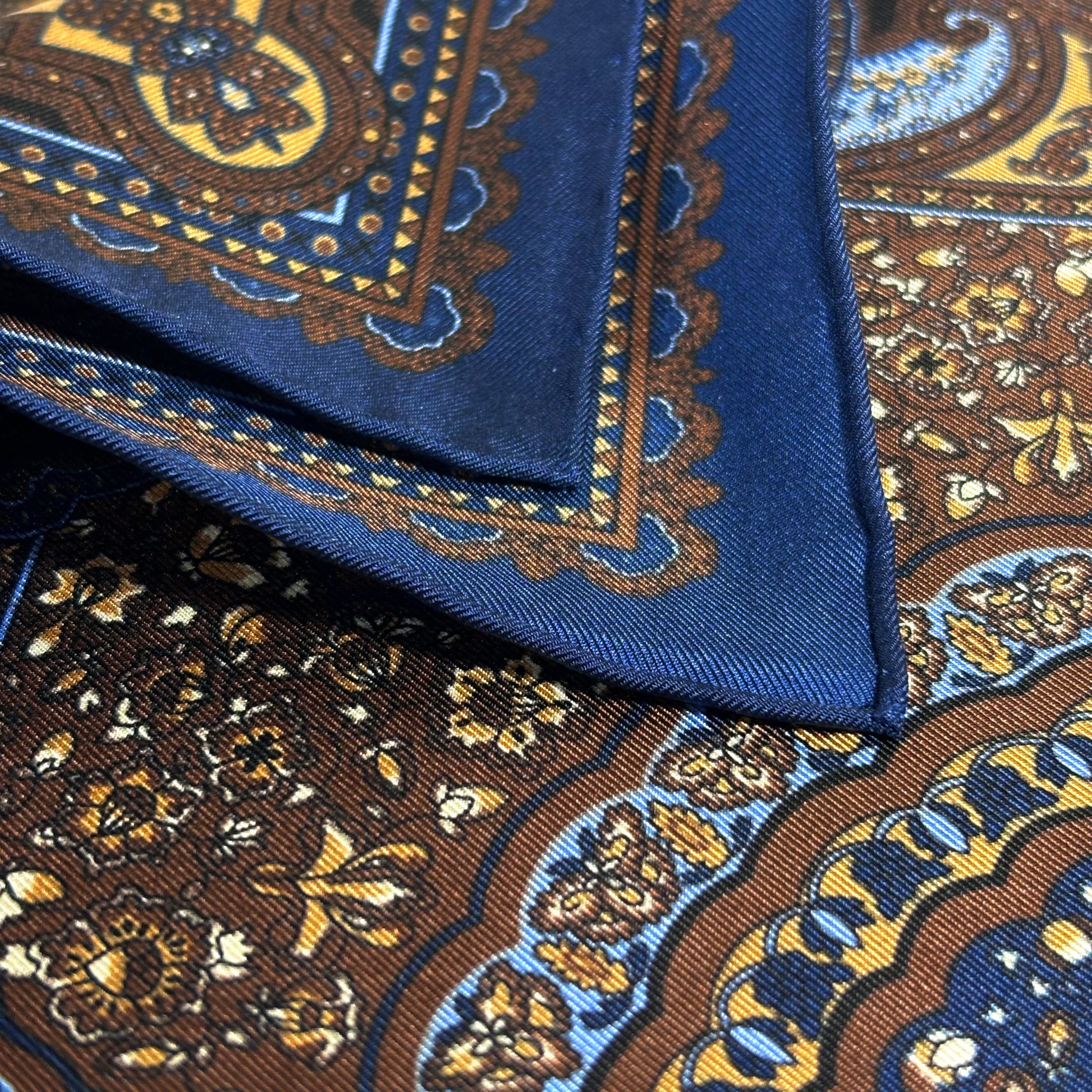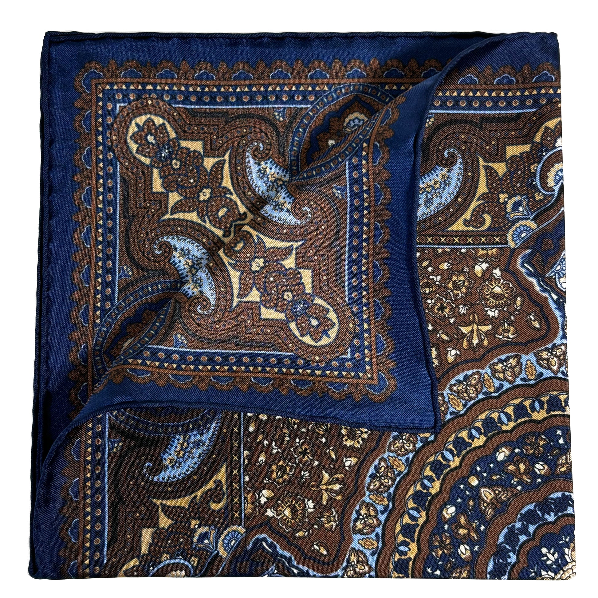 Navy Blue & Brown Floral Medallion Ancient Madder Silk Pocket Square