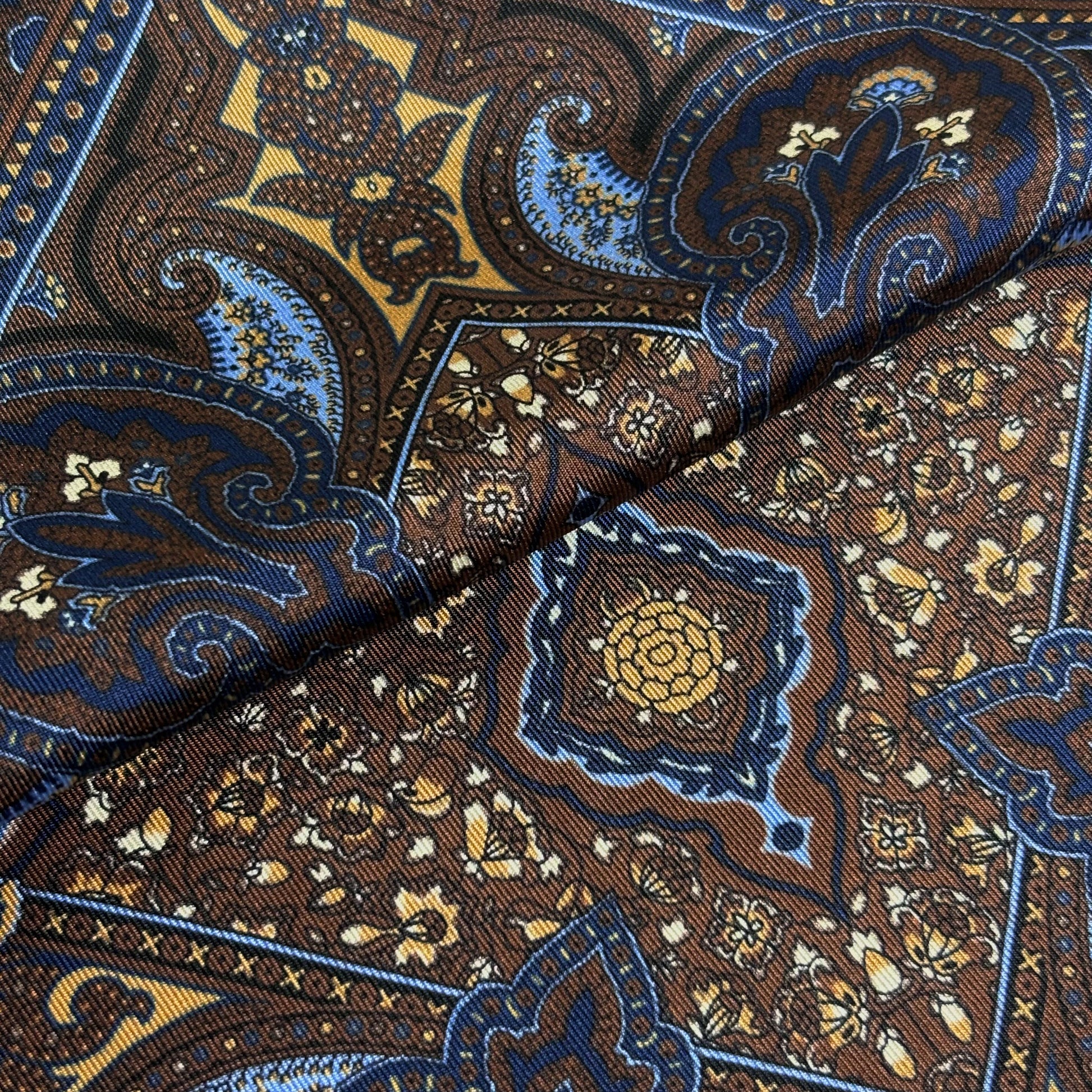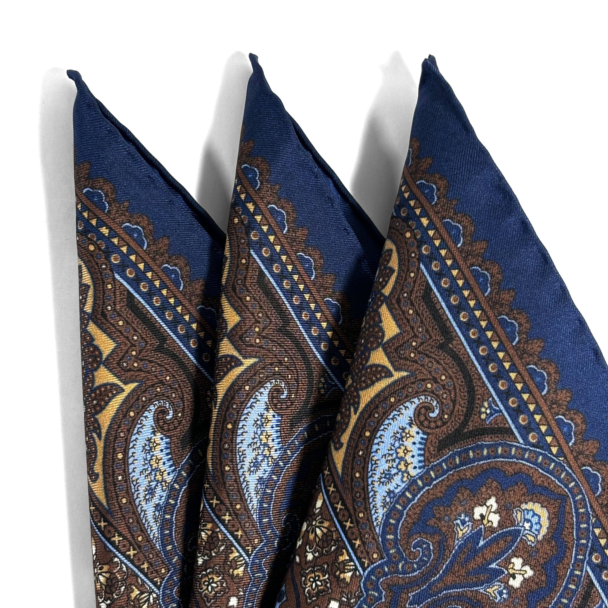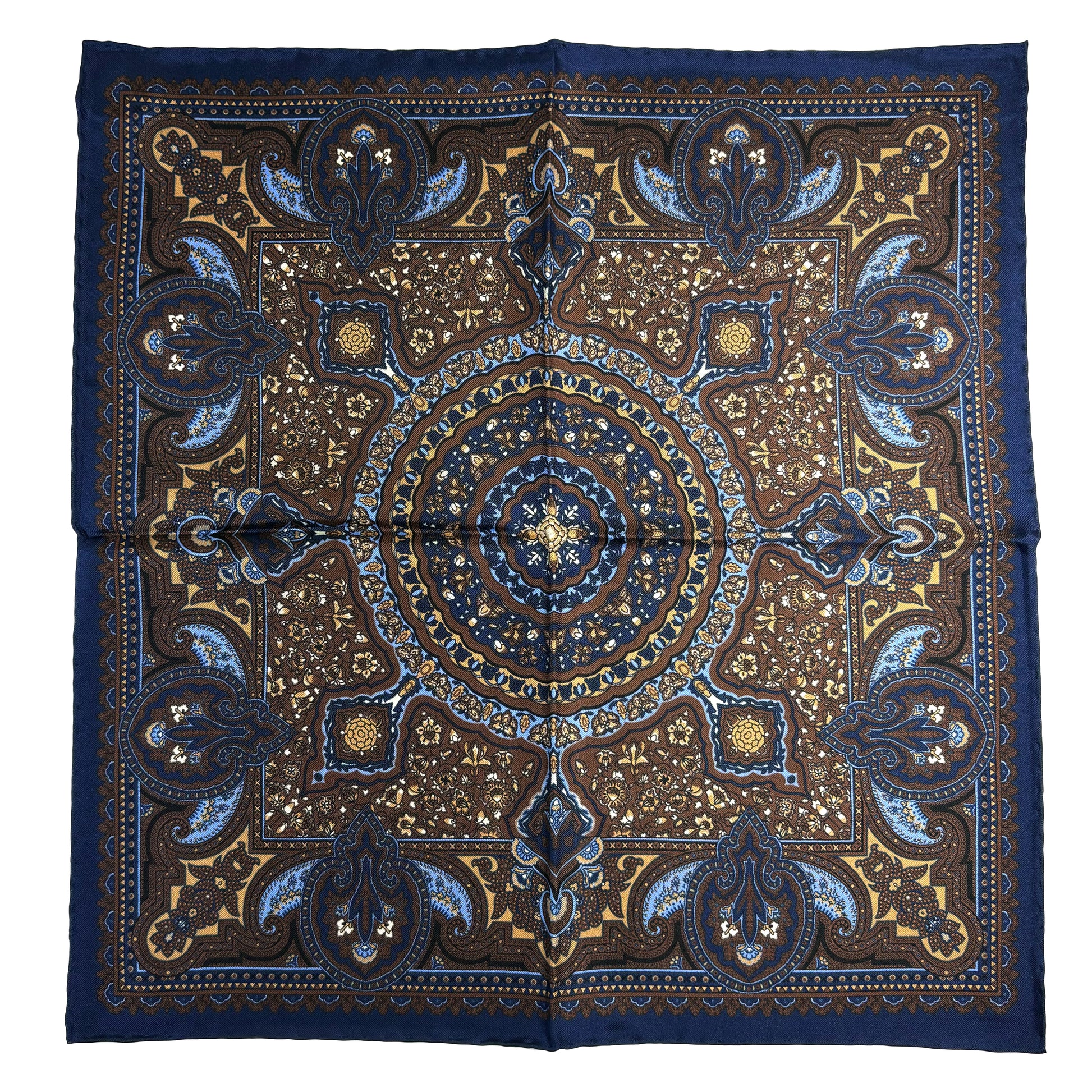 Navy Blue & Brown Floral Medallion Ancient Madder Silk Pocket Square
