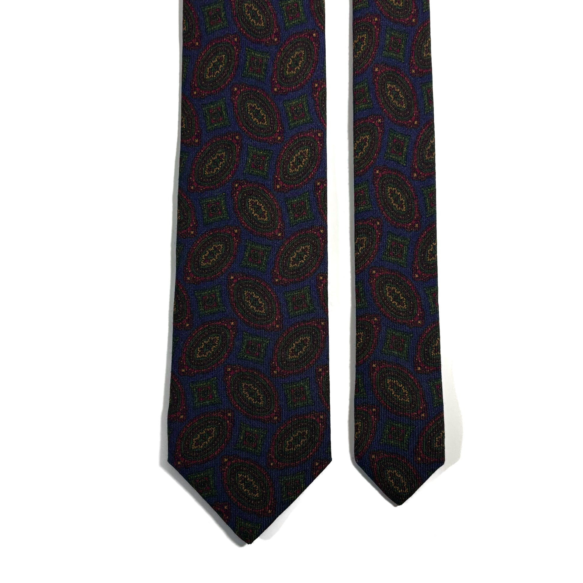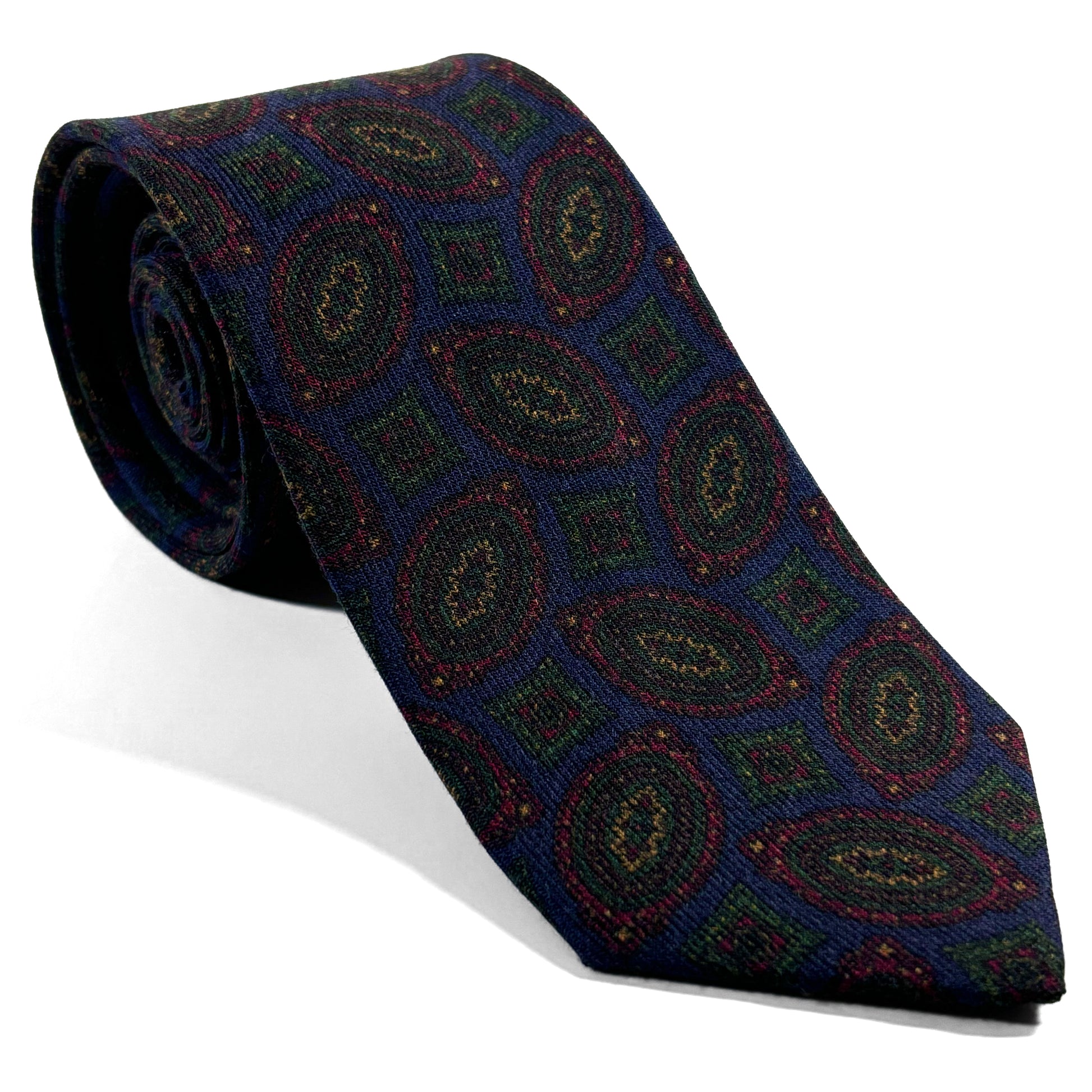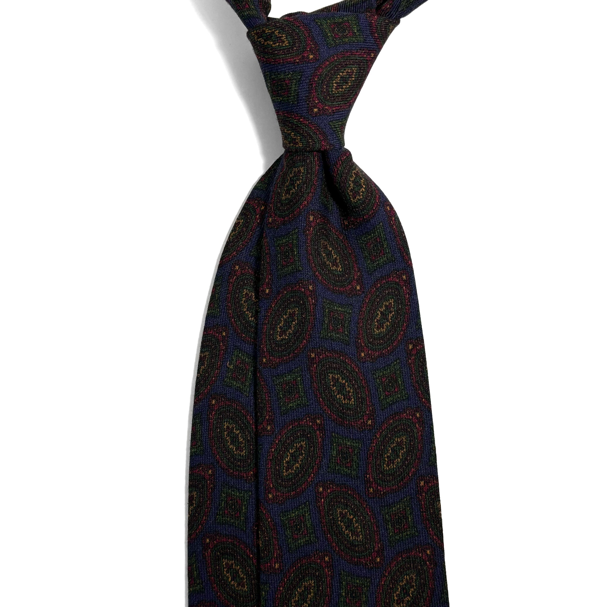 This wool–silk blend offers a naturally soft hand and a refined, understated texture that tempers the colors into a muted palette. The patterns appear rich without being loud, giving the tie a quietly luxurious character that suits both business attire and more relaxed tailoring, especially in the colder seasons.