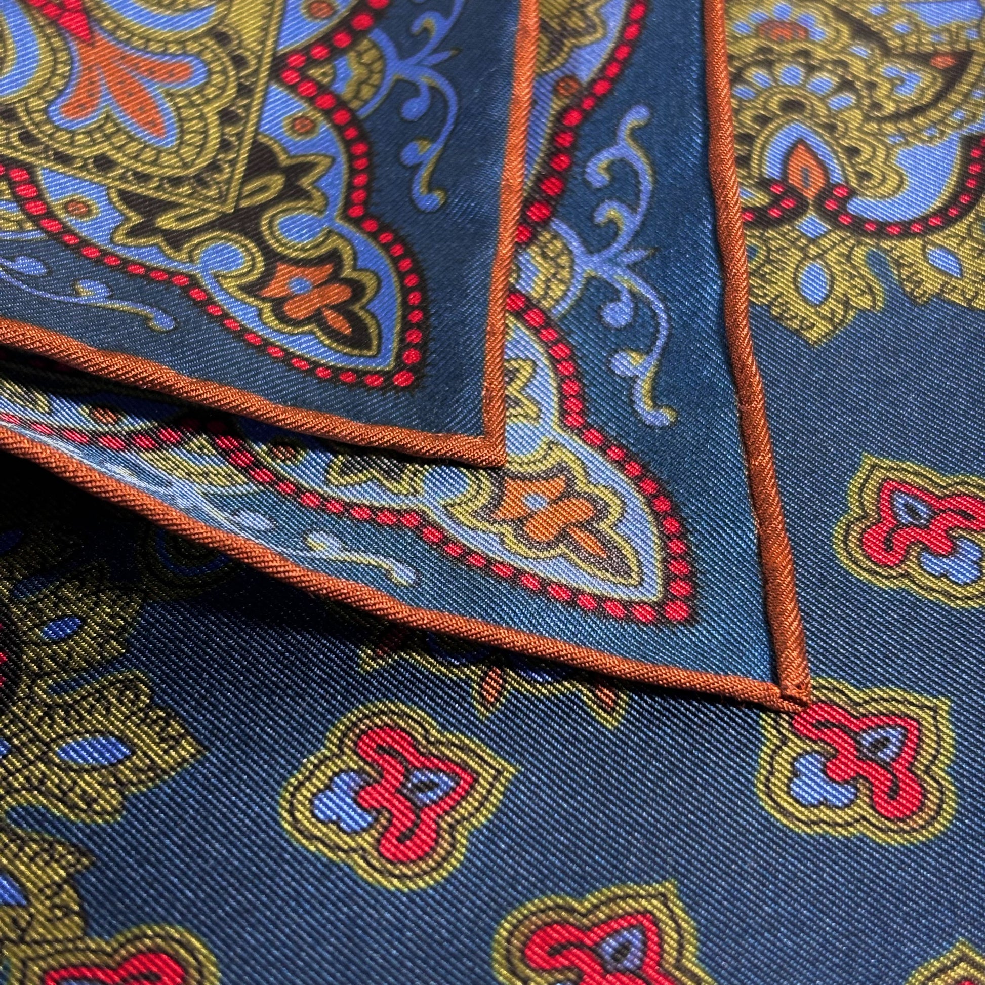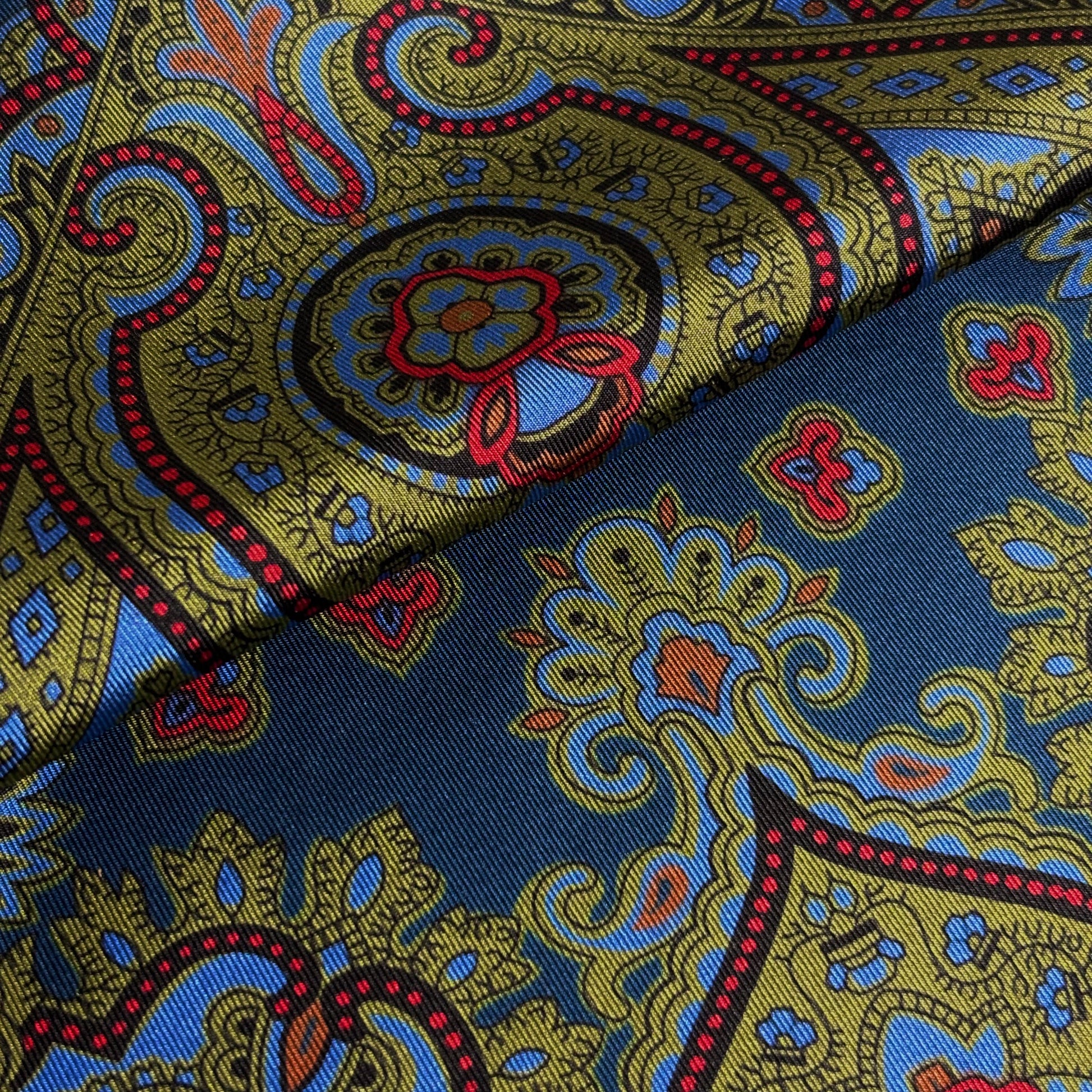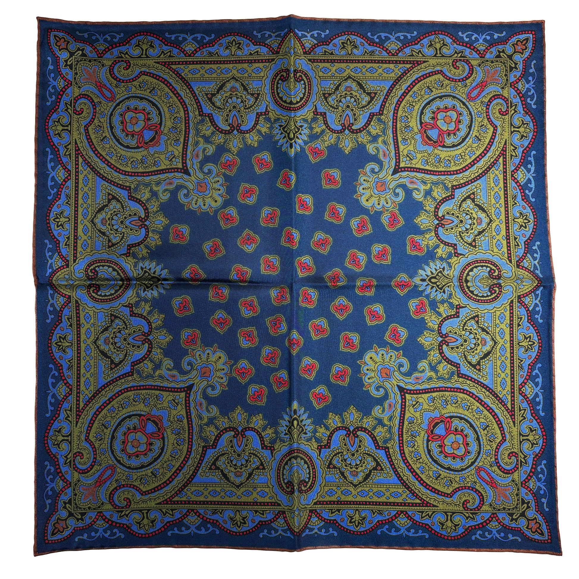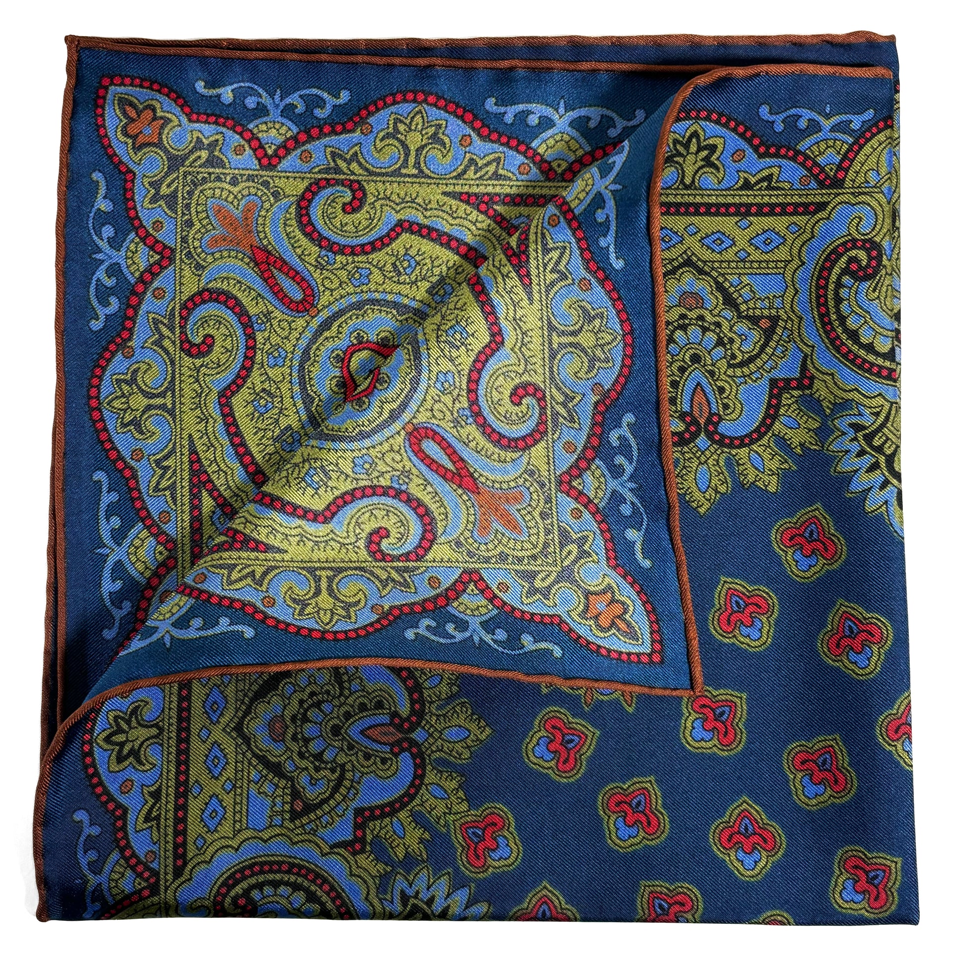 Navy Blue & Olive Green Medallion Ancient Madder Silk Pocket Square