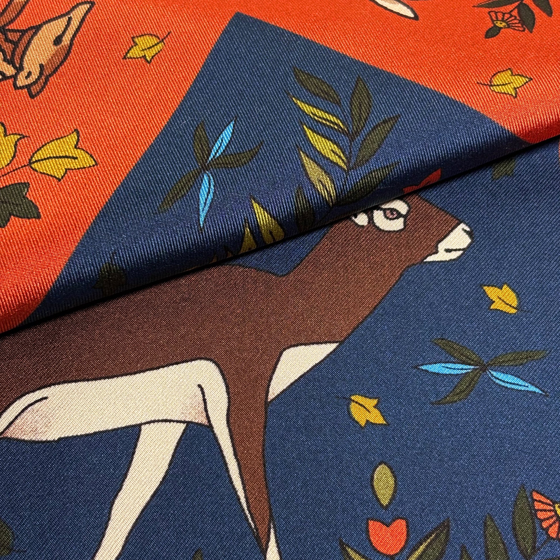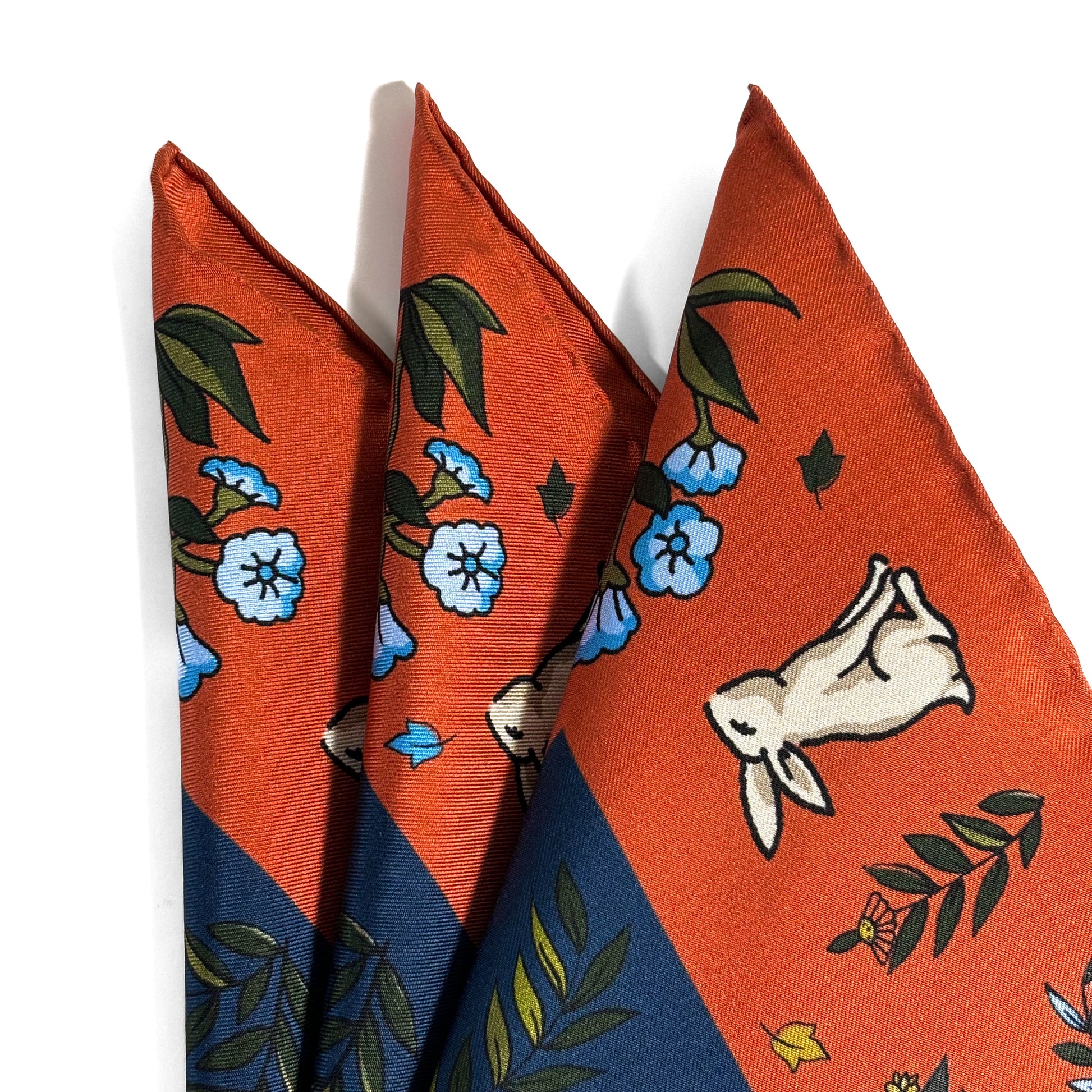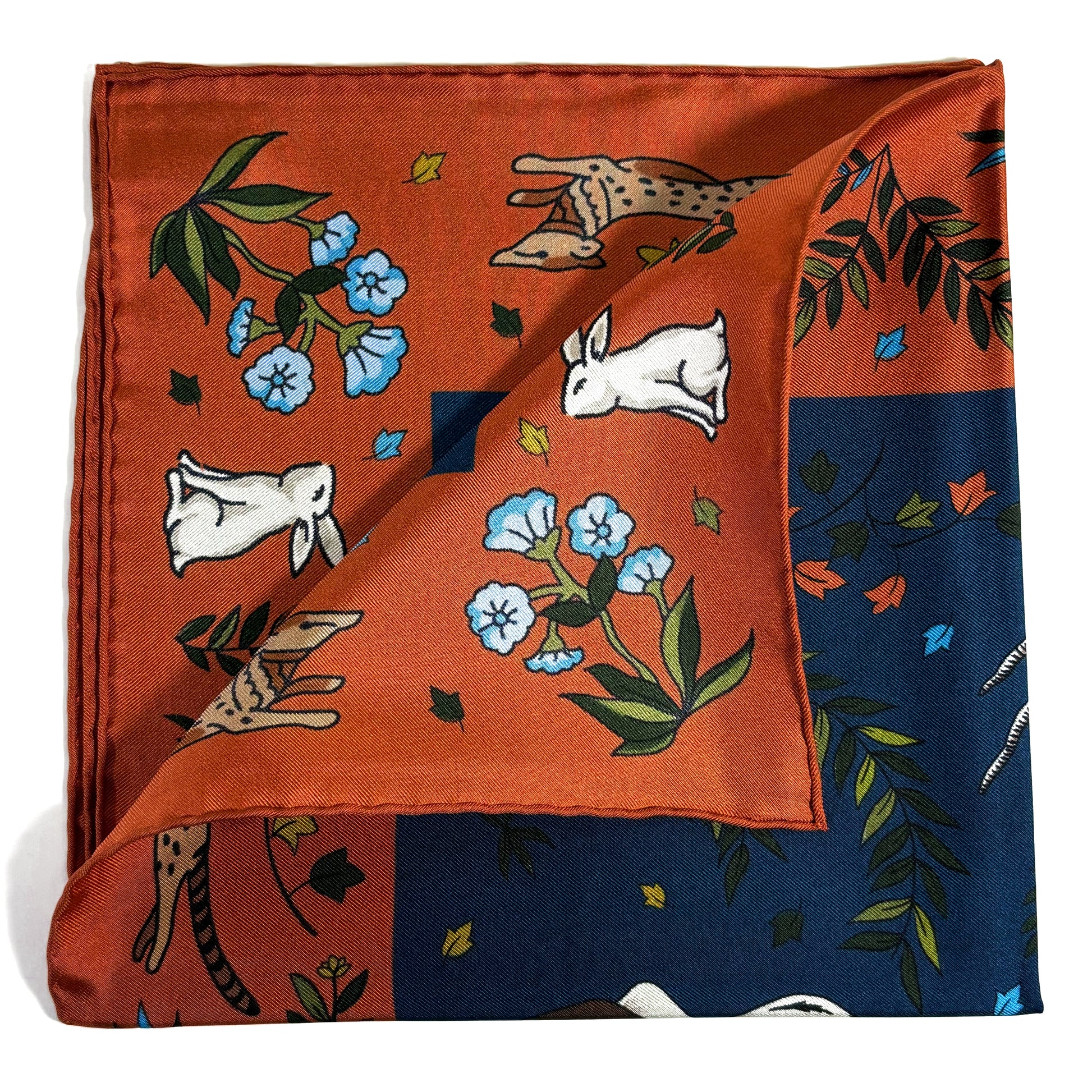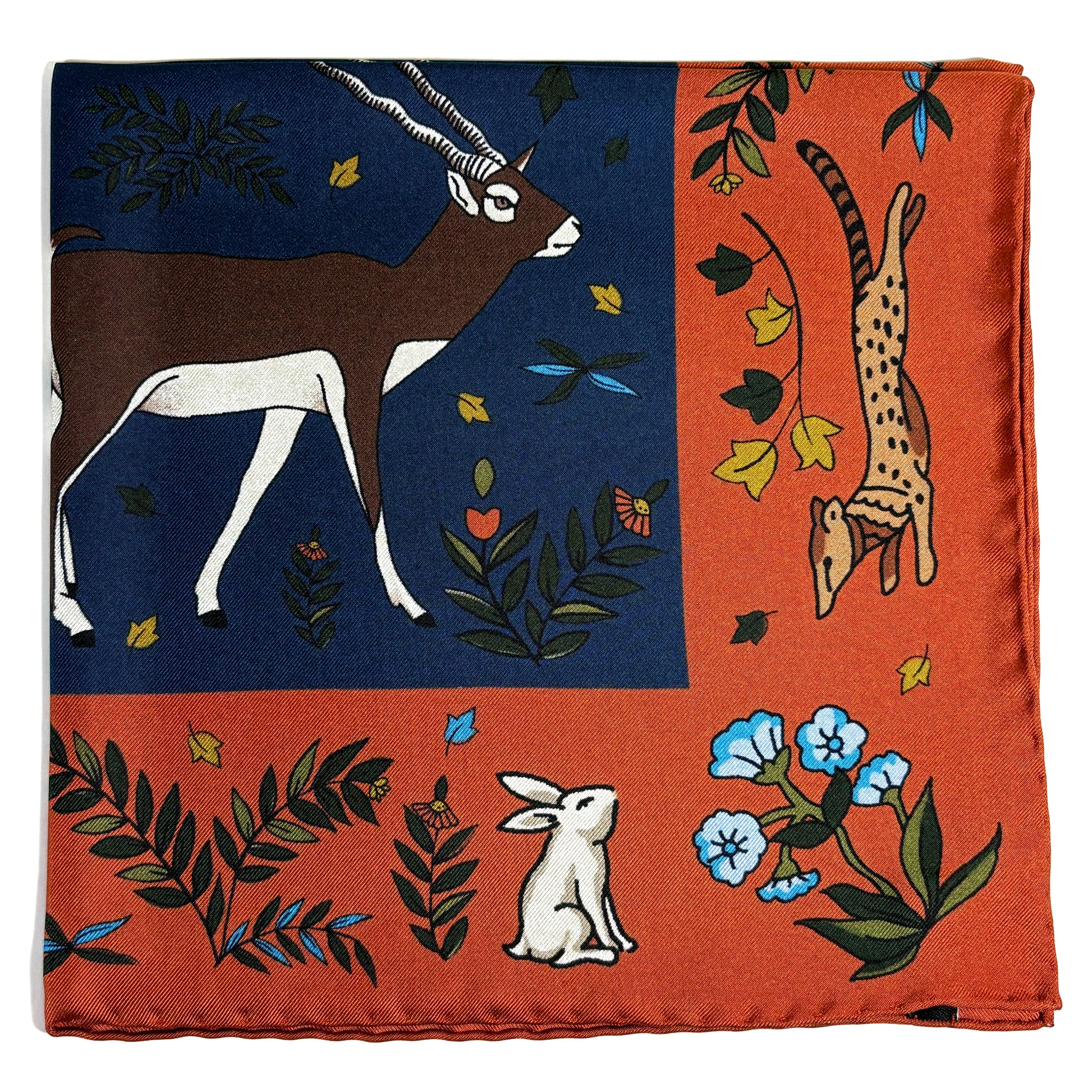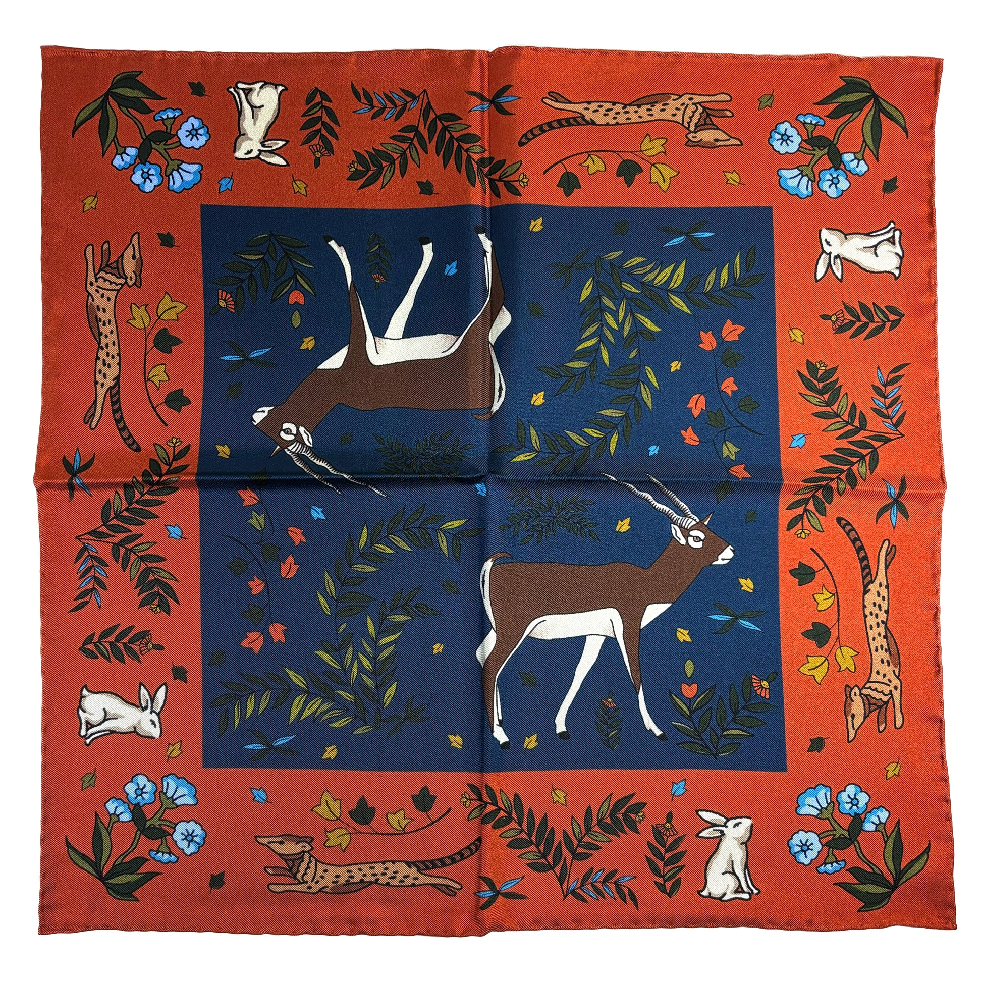 Navy Blue & Orange Gazelle Motif Ancient Madder Silk Pocket Square