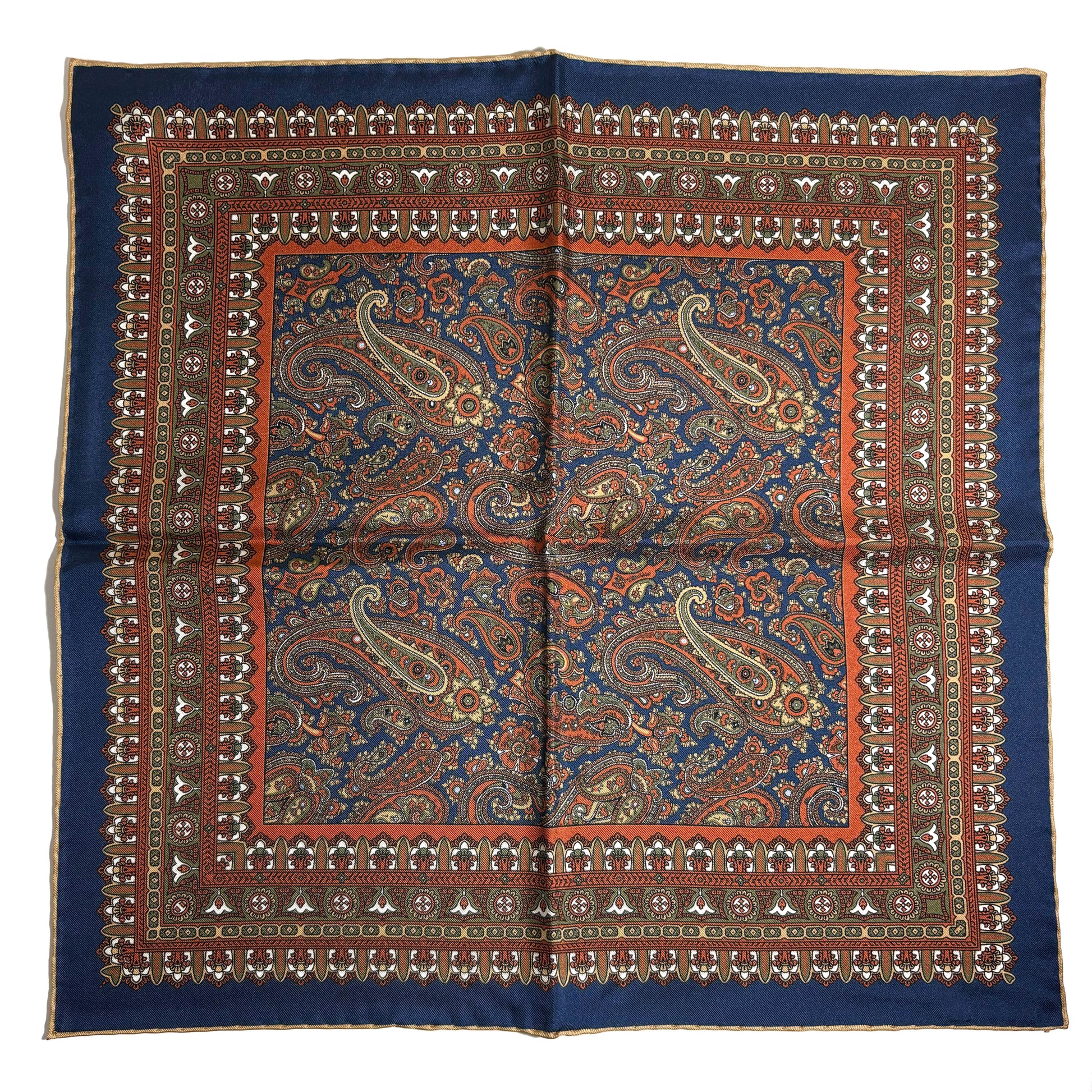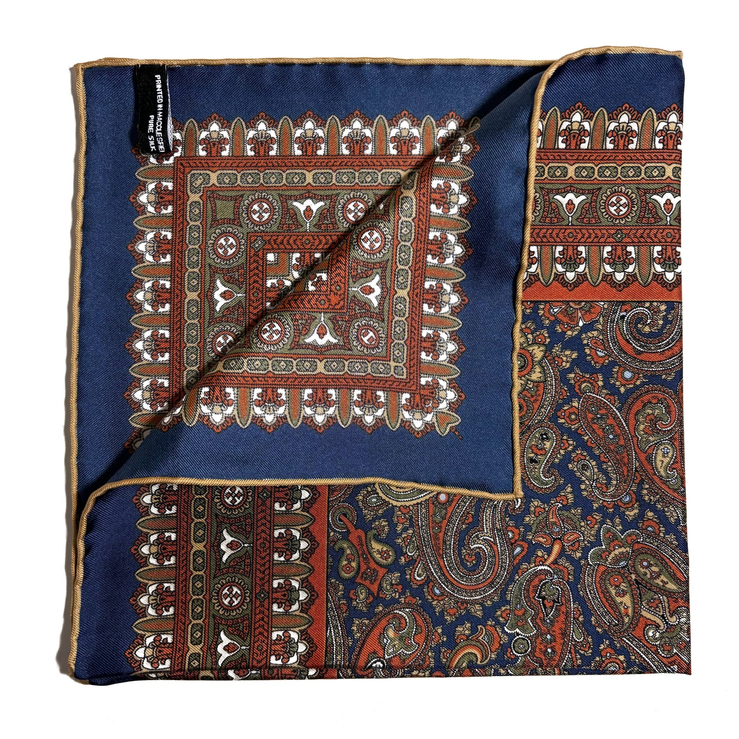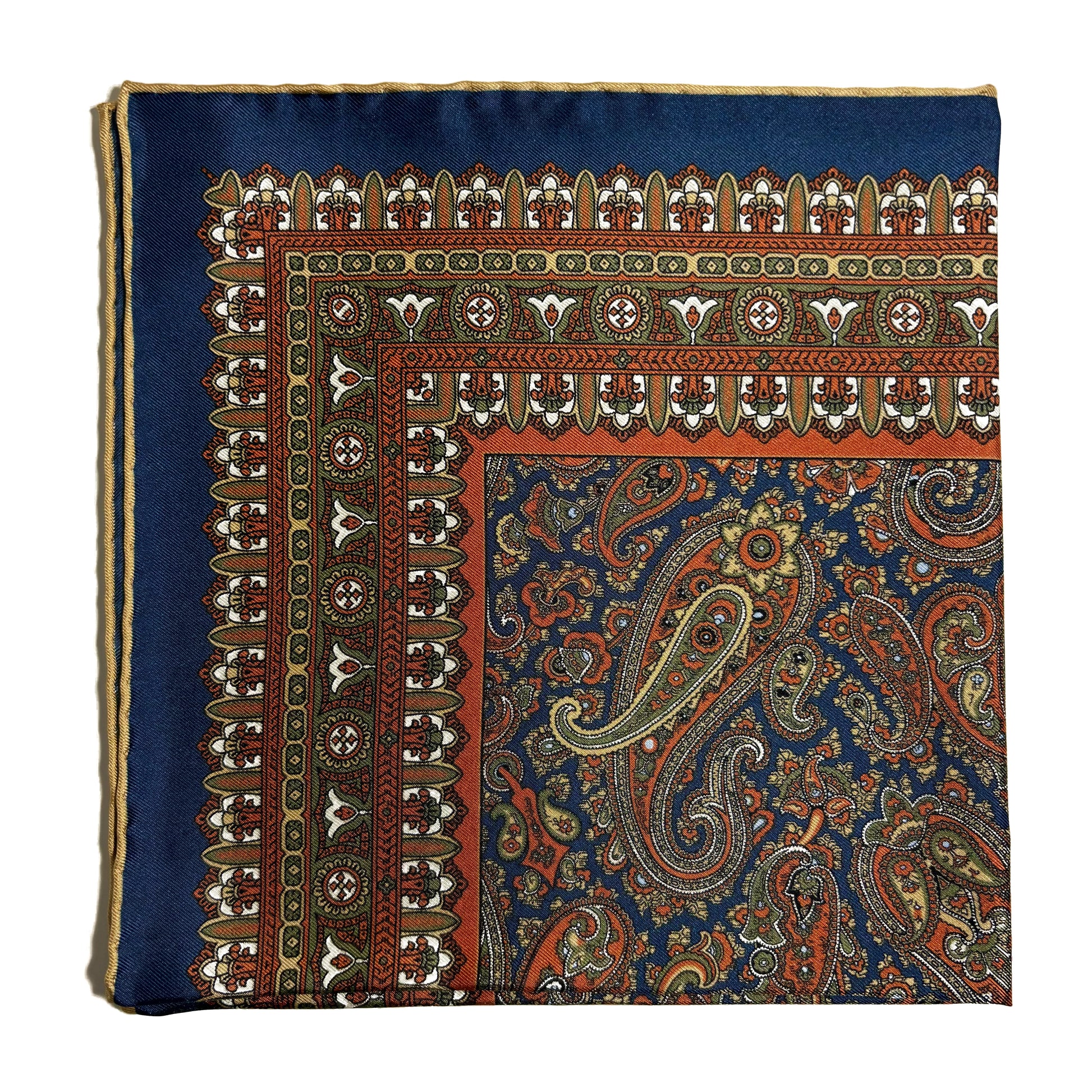 | A Timeless Silk Twill Pocket Square This design features a bold paisley pattern surrounded by a geometric frame, a solid border, and a shoestring edge.