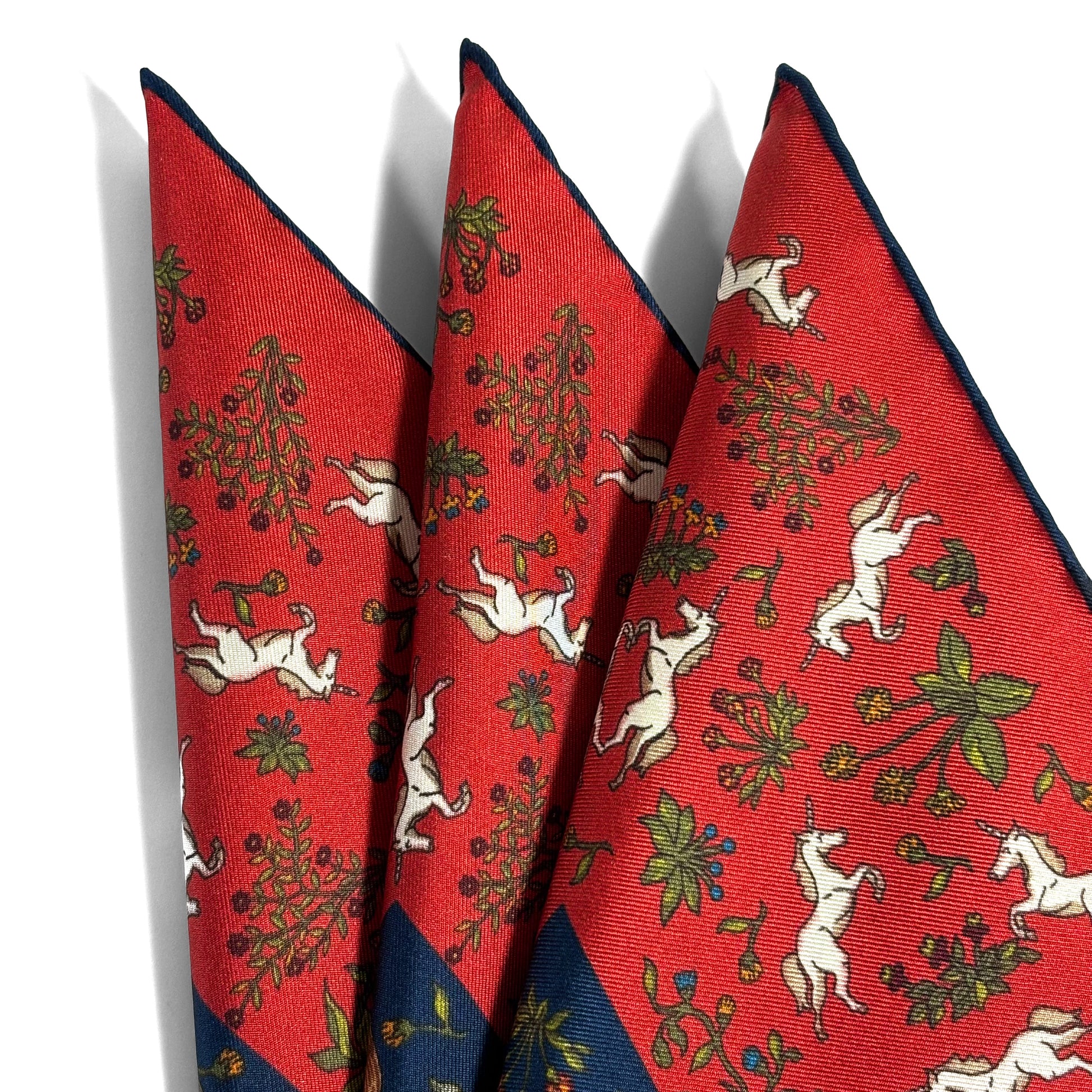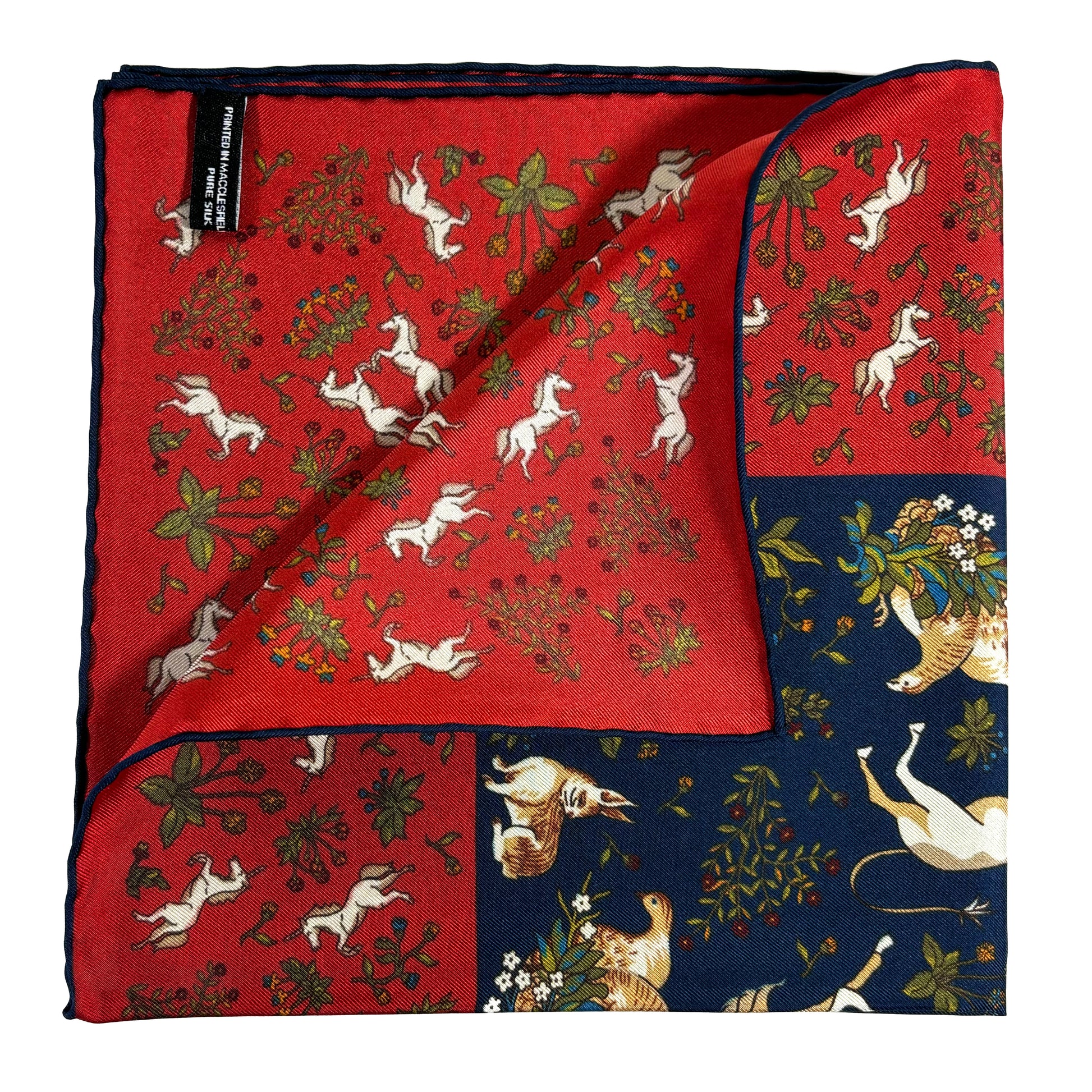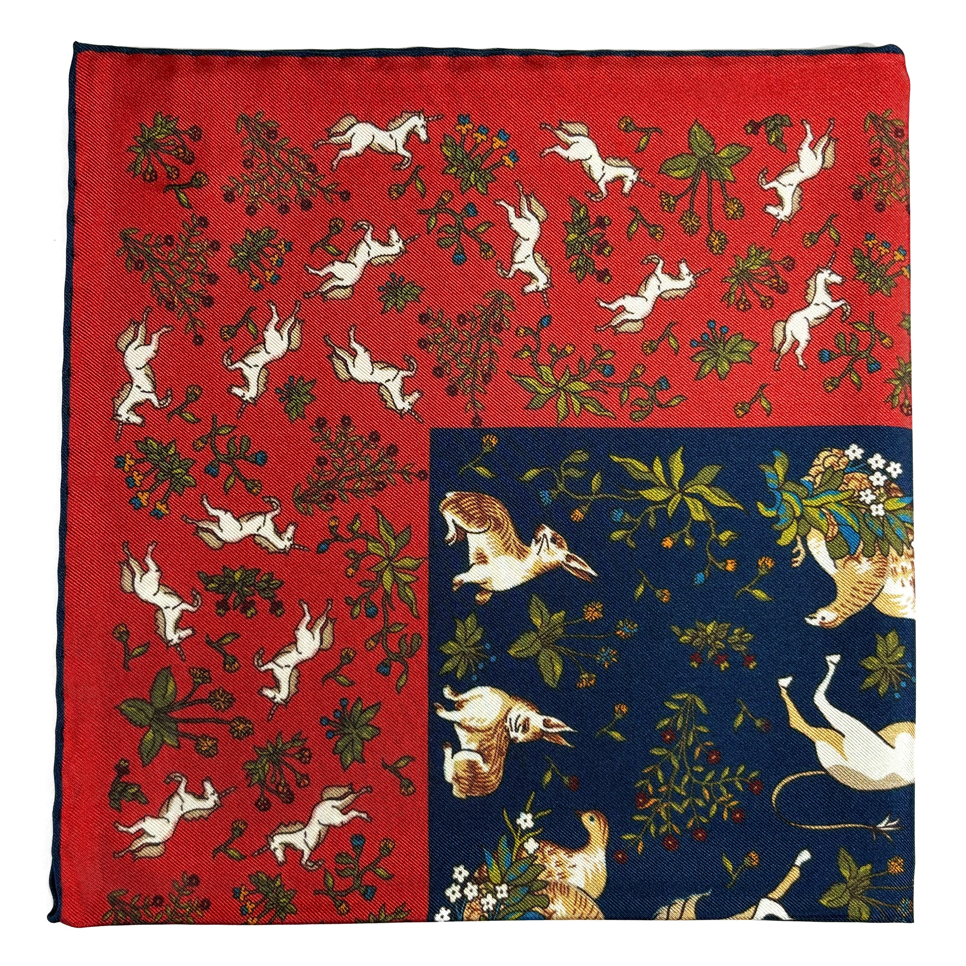 Navy Blue & Red Unicorn Motif Ancient Madder Silk Pocket Square