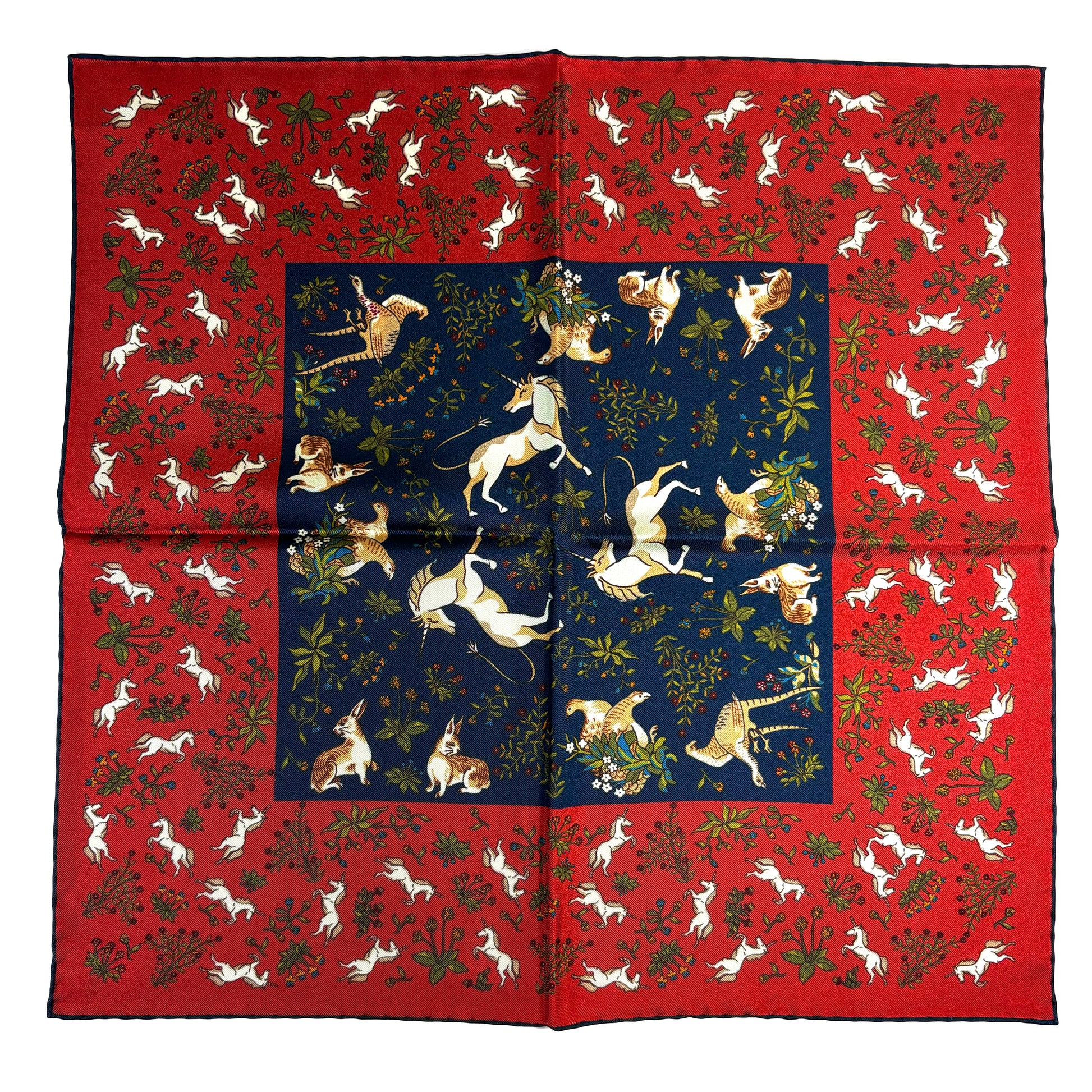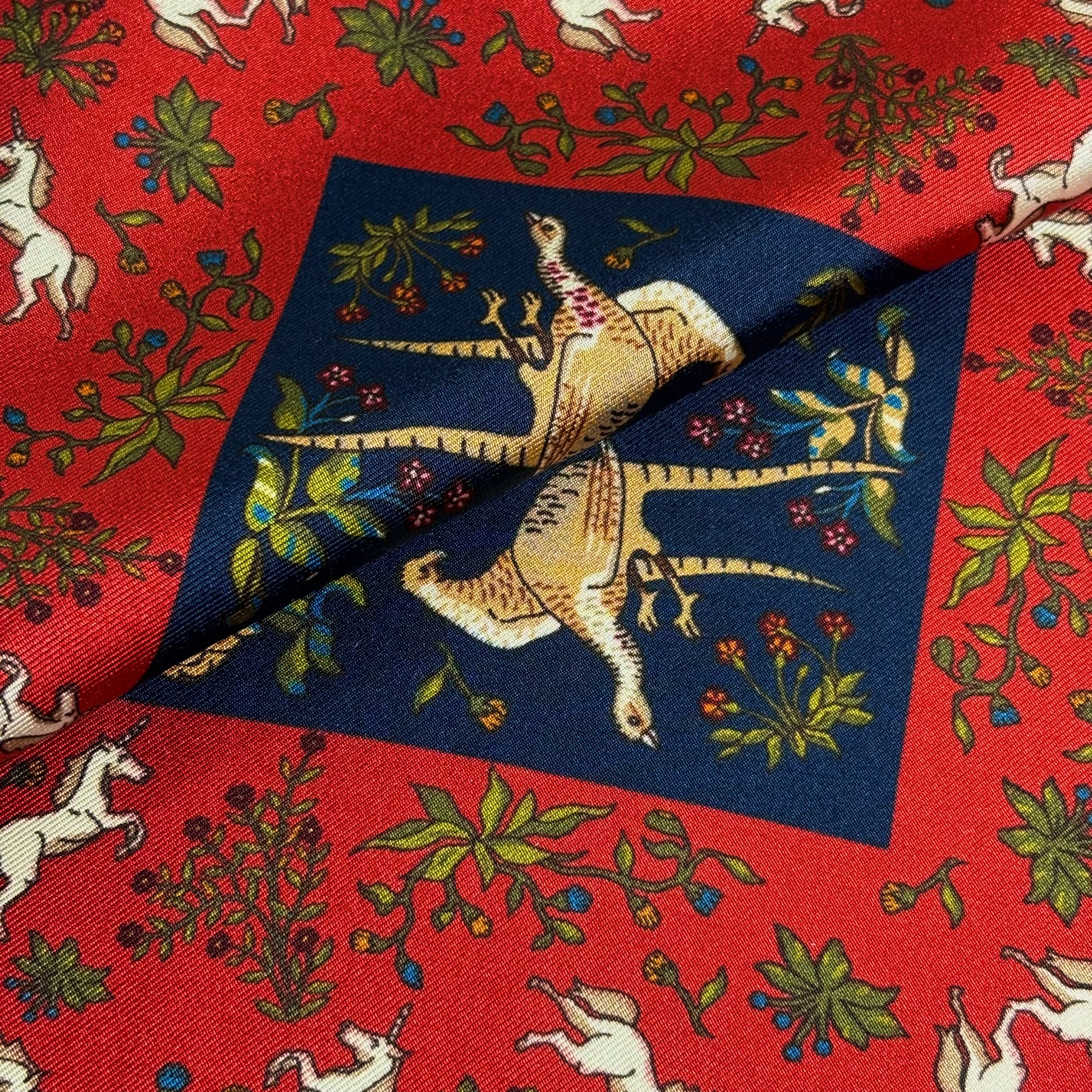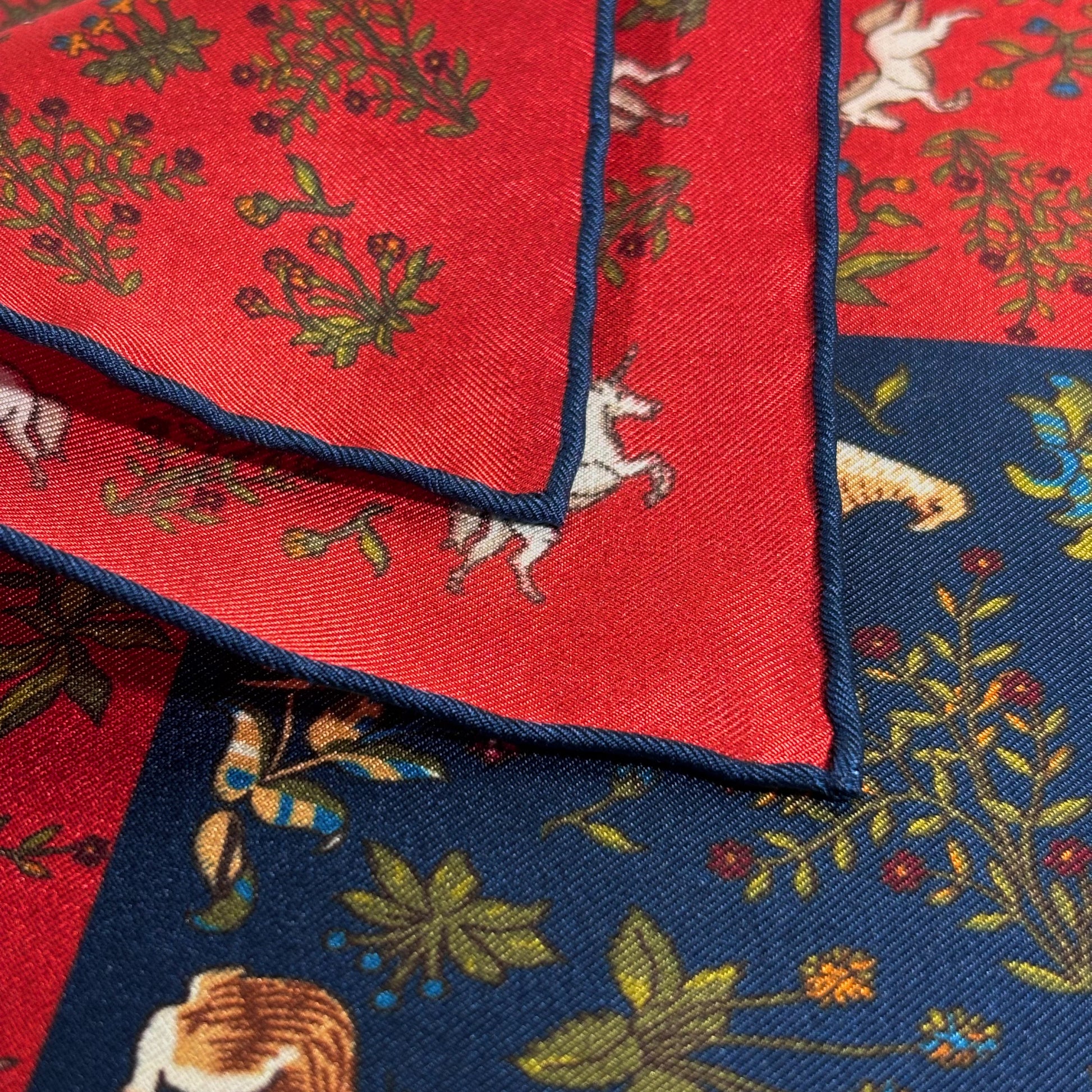 Navy Blue & Red Unicorn Motif Ancient Madder Silk Pocket Square