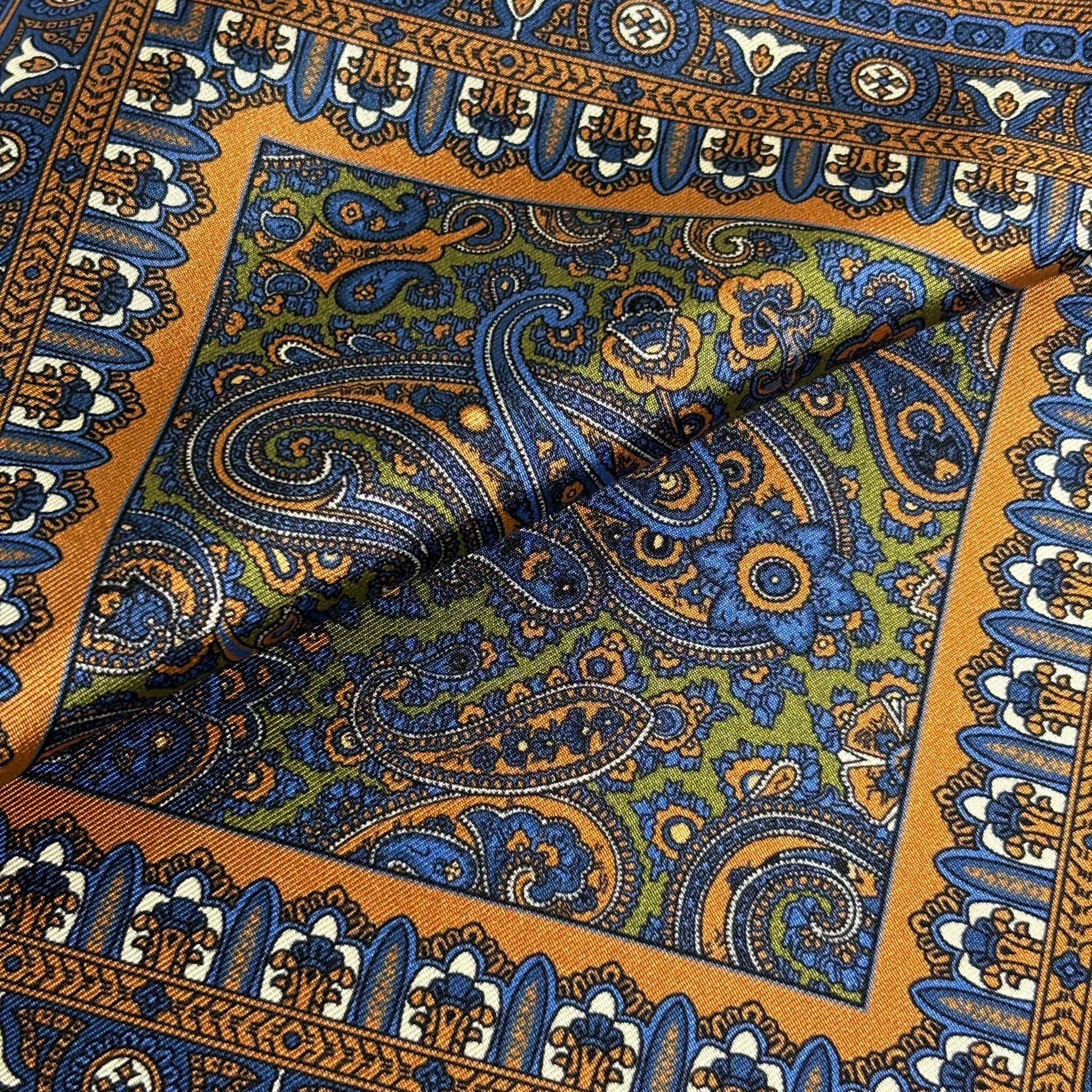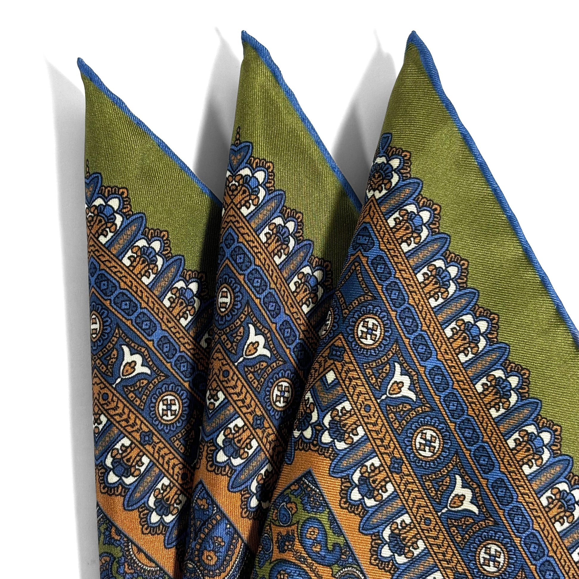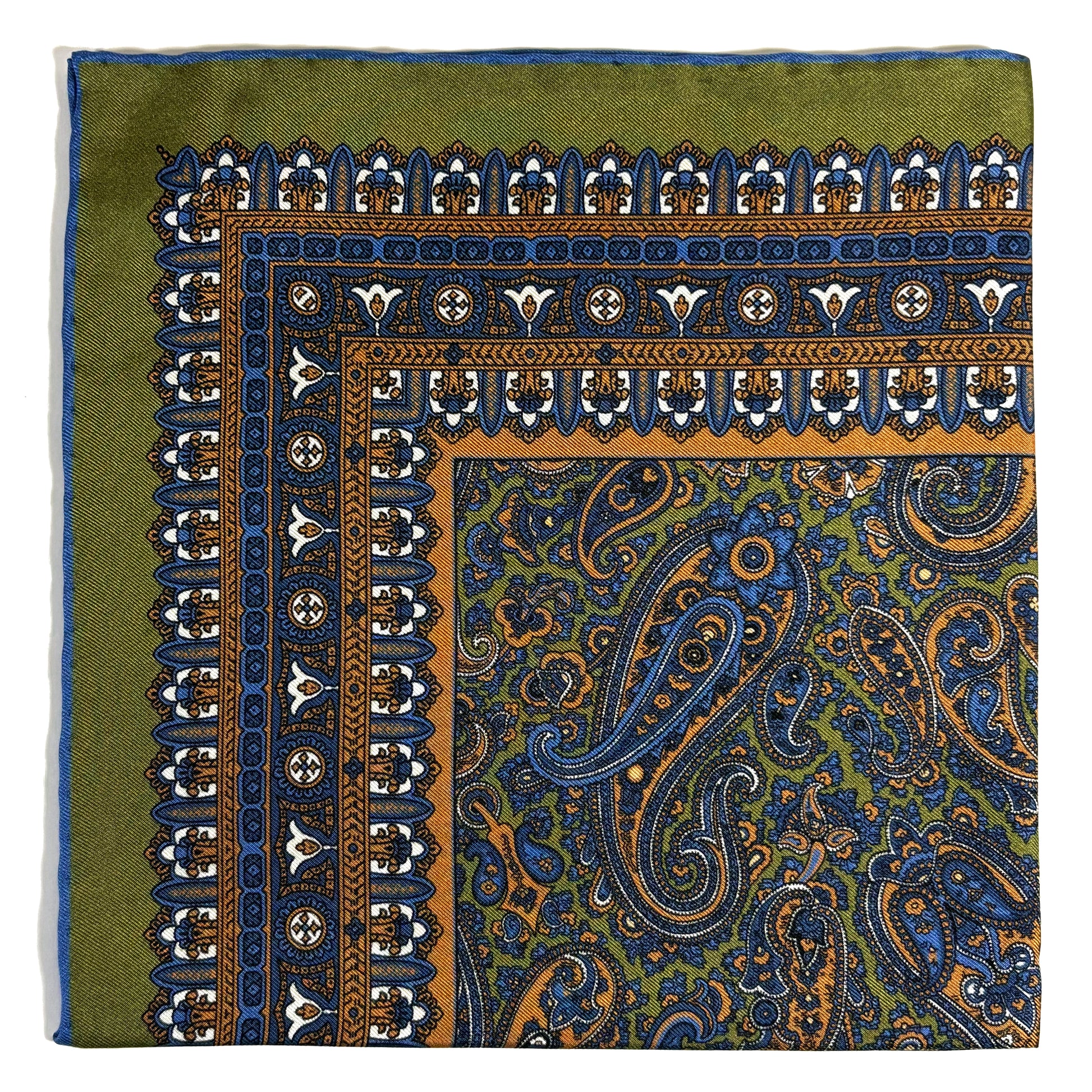 | A Timeless Silk Twill Pocket Square This design features a bold paisley pattern surrounded by a geometric frame, a solid border, and a shoestring edge.