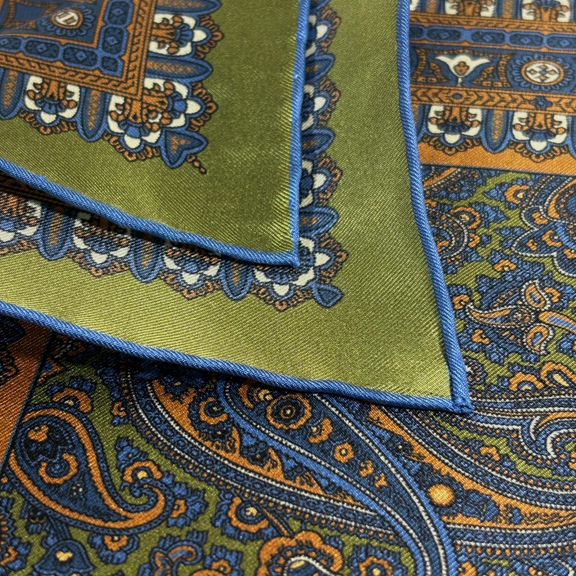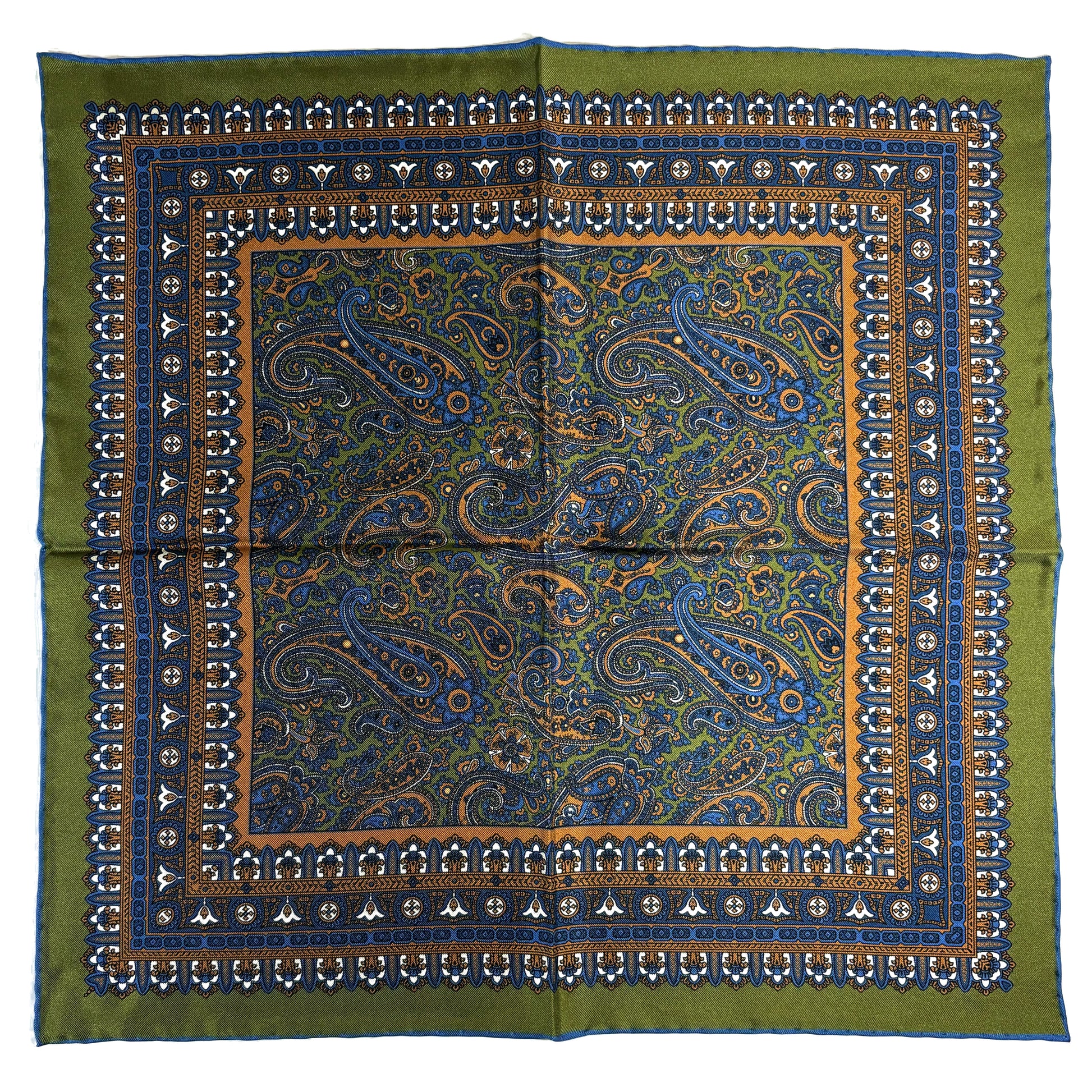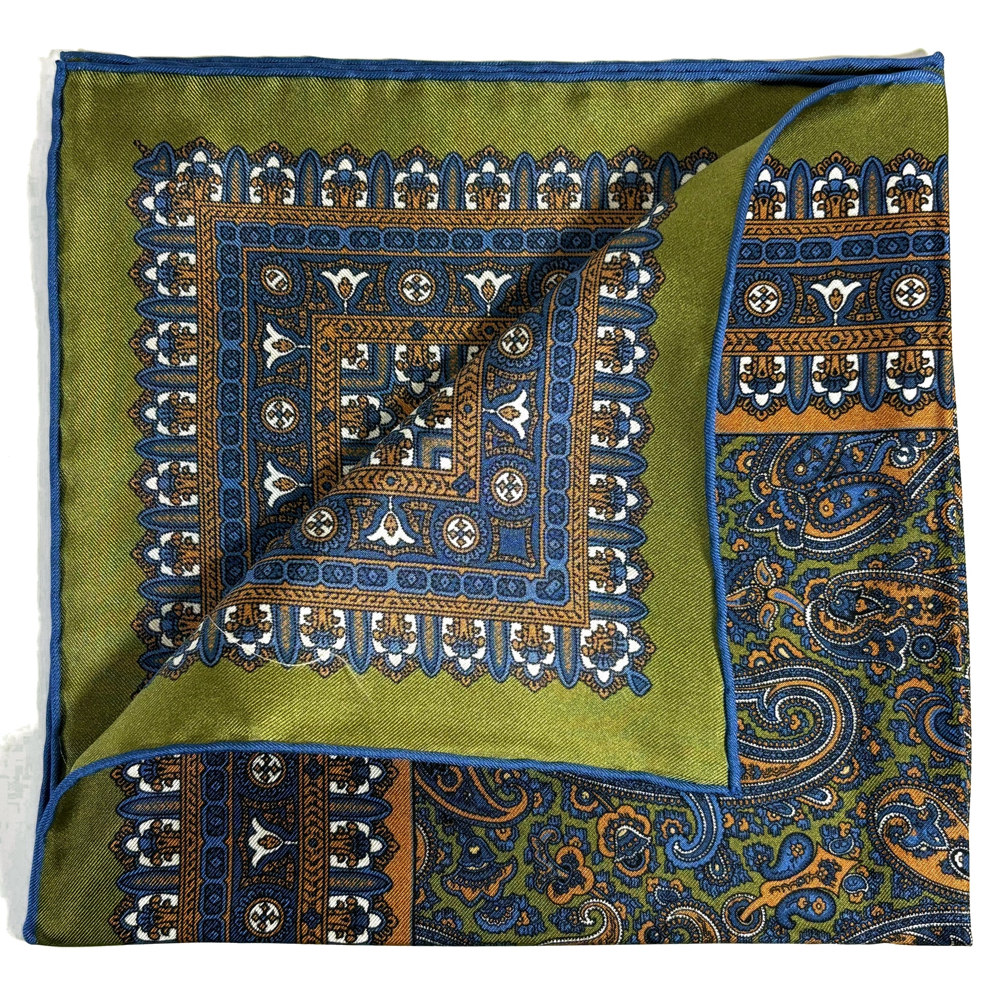 | A Timeless Silk Twill Pocket Square This design features a bold paisley pattern surrounded by a geometric frame, a solid border, and a shoestring edge.