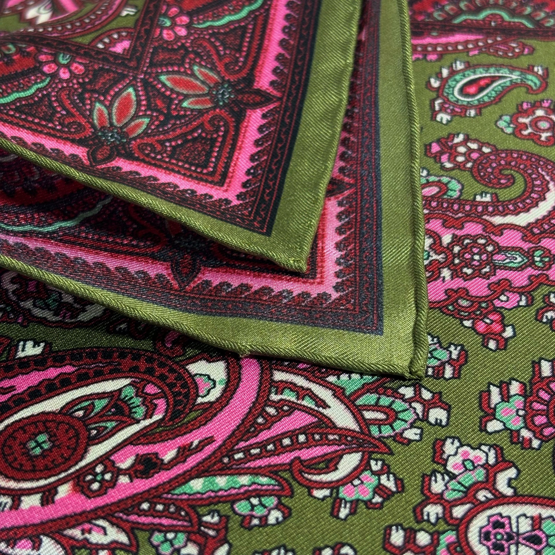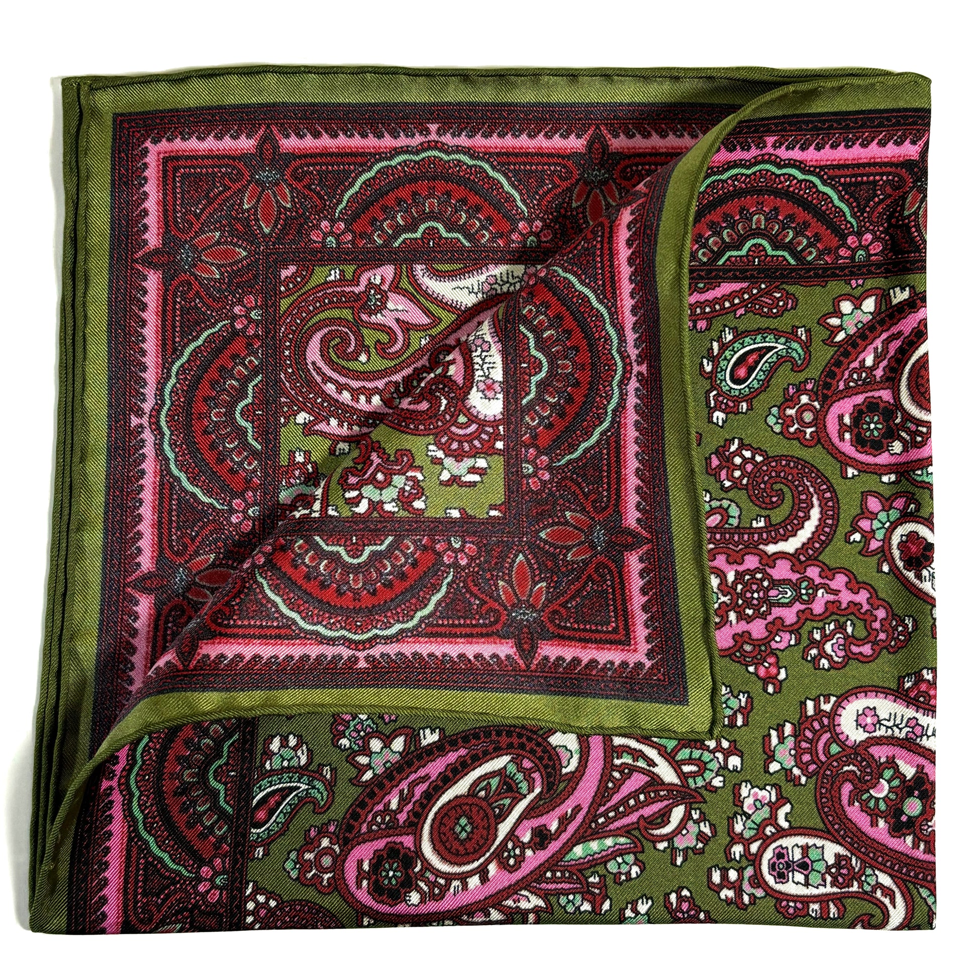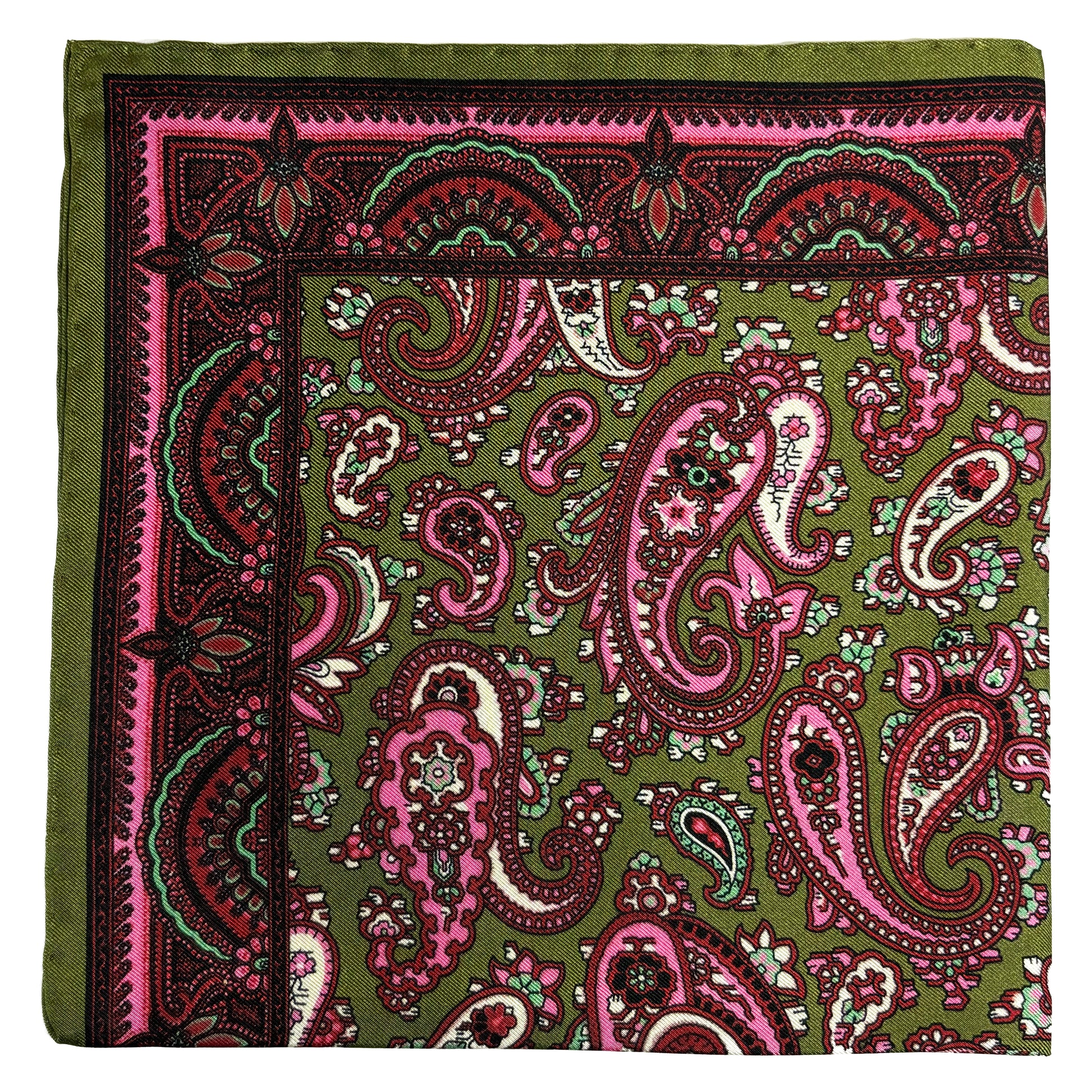 Olive Green & Pink Paisley Ancient Madder Silk Pocket Square