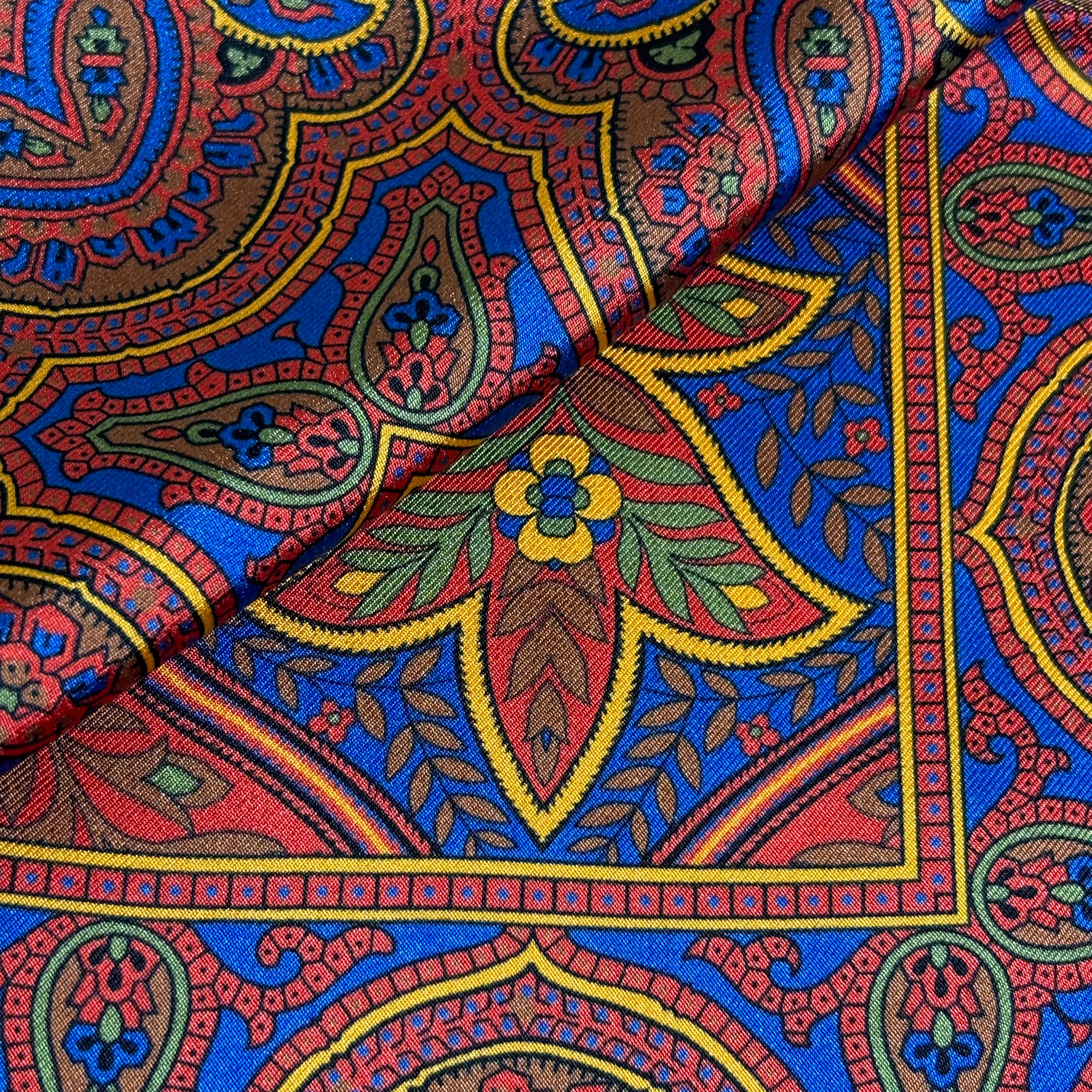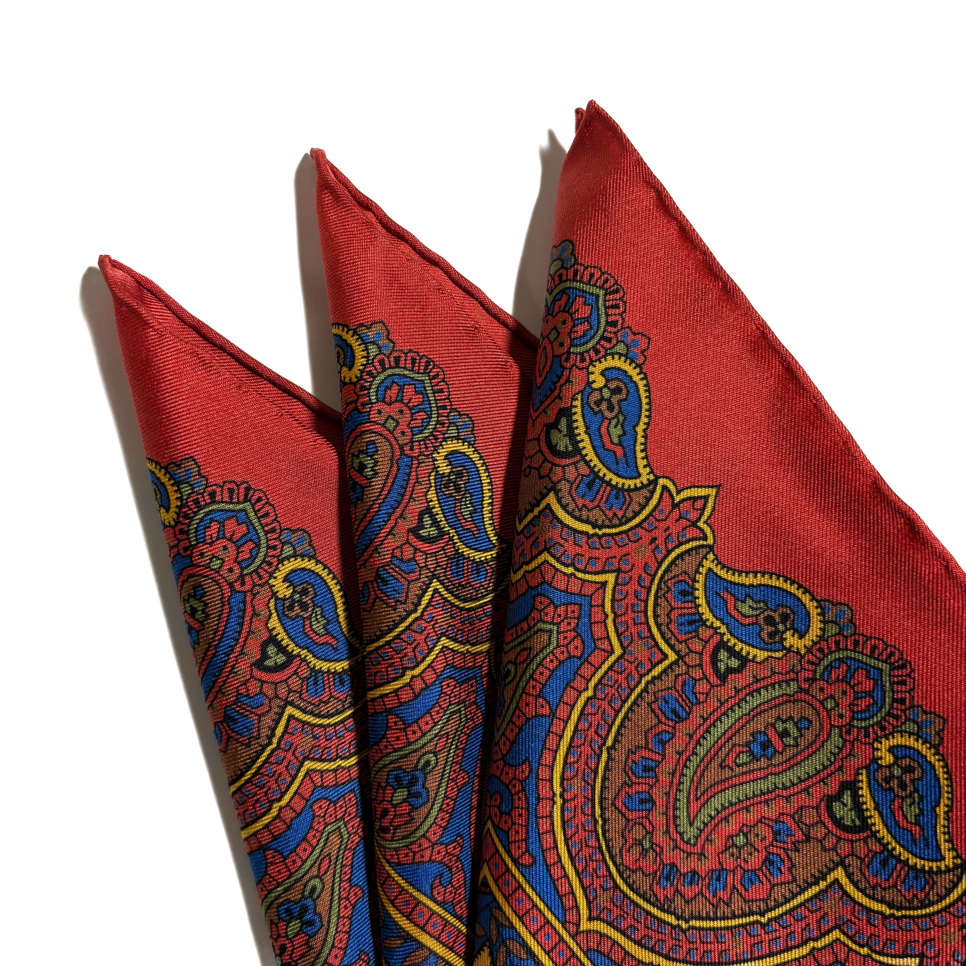 The designs were selected from a historic archive in Macclesfield, England with designs dating back hundreds of years. Each square was hand-sewn and printed in Macclesfield, ensuring a true British luxury product.
