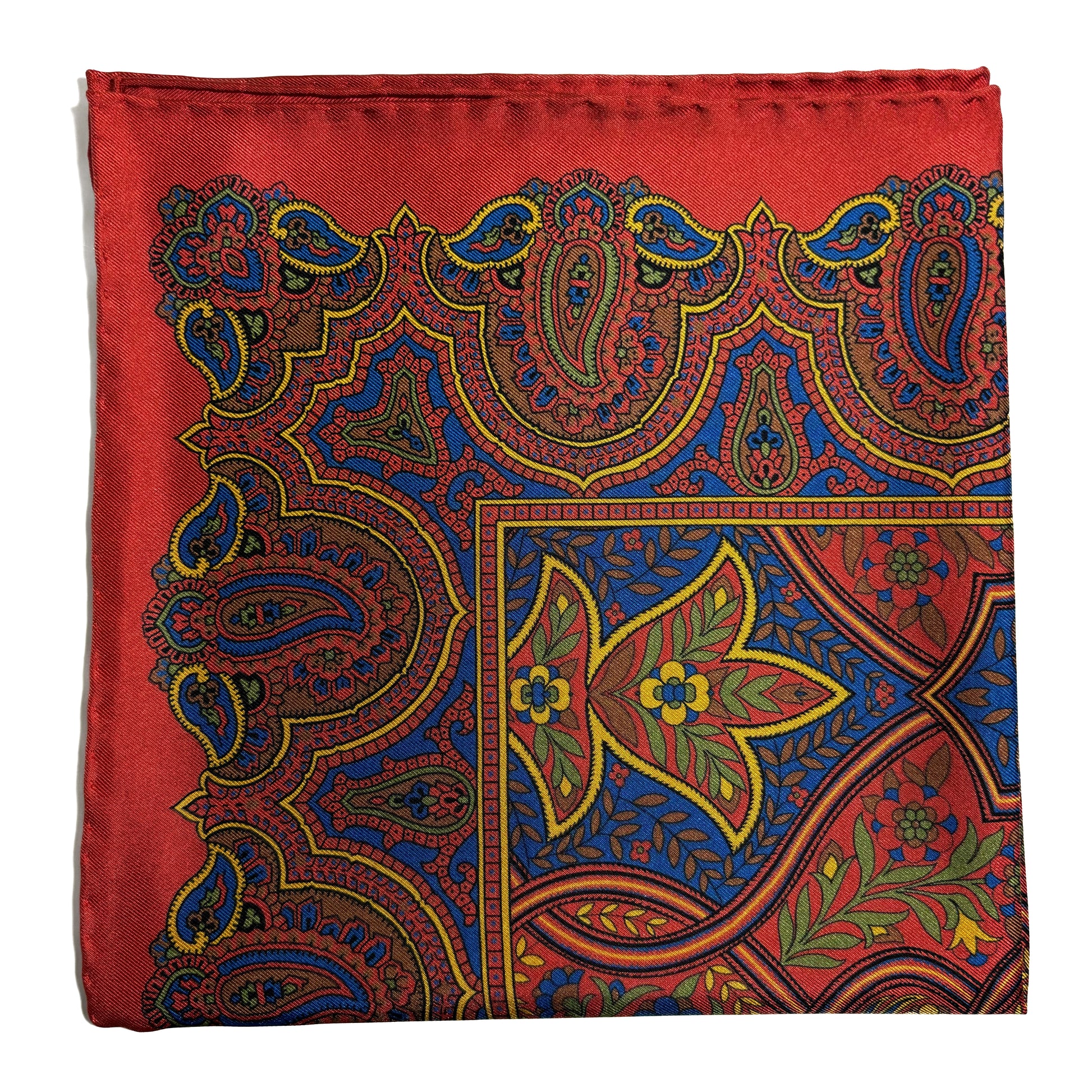 | A Timeless Silk Twill Pocket Square This design features a bold center medallion with smaller geometric ornaments dancing around the center, a solid border and a shoestring edge.