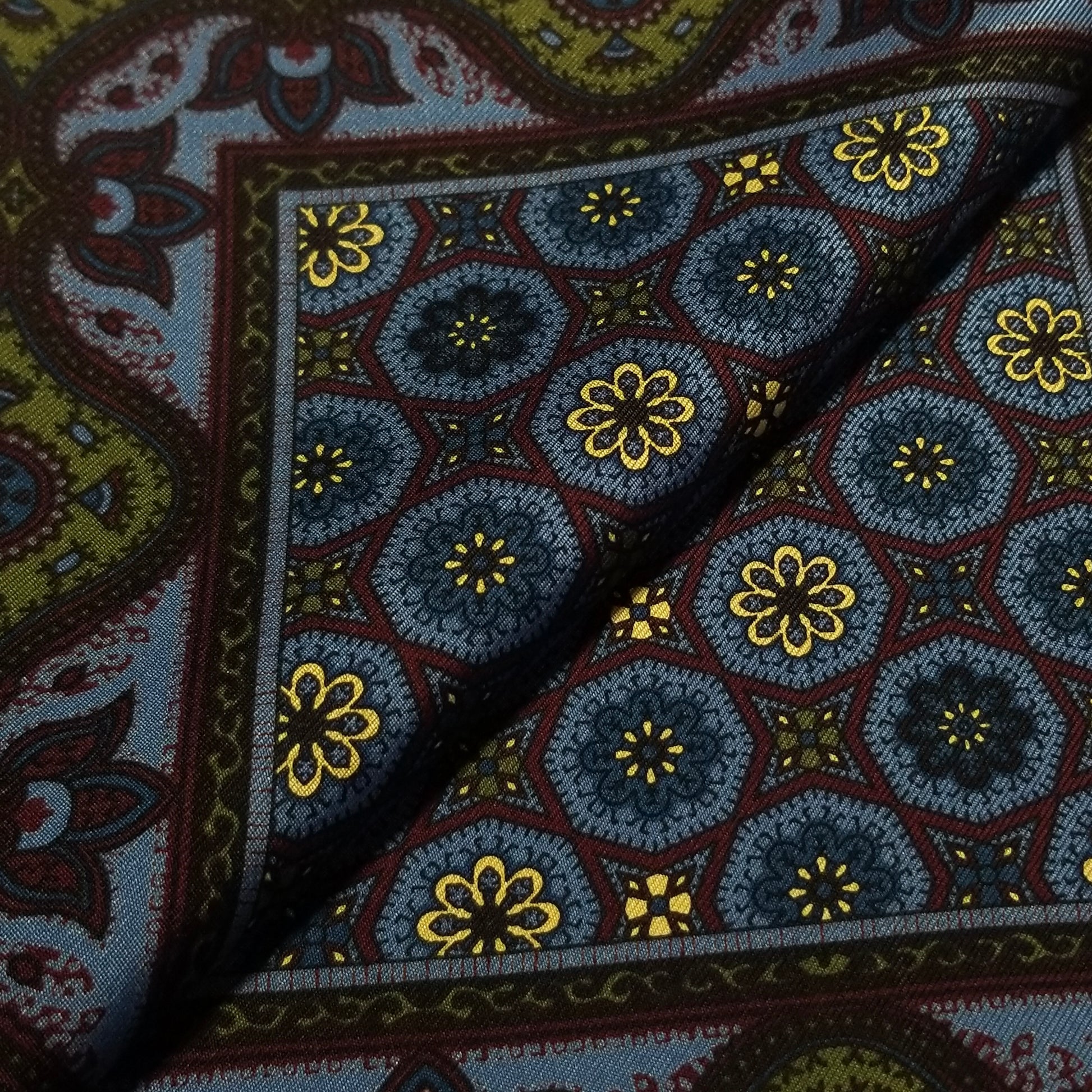 Ancient madder fabric, synonymous with timeless elegance, finds its roots in Macclesfield, England, renowned for its historic silk industry. This exquisite silk is distinguished by its rich, deep colors, velvety-matte texture, and “chalky hand”, achieved through a traditional dyeing process dating back centuries. Adorned with intricate patterns developed over years of refinement, each square is guaranteed to be a masterpiece.