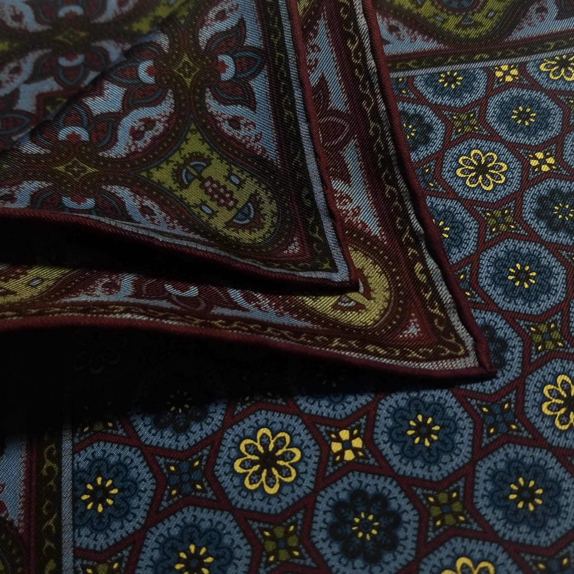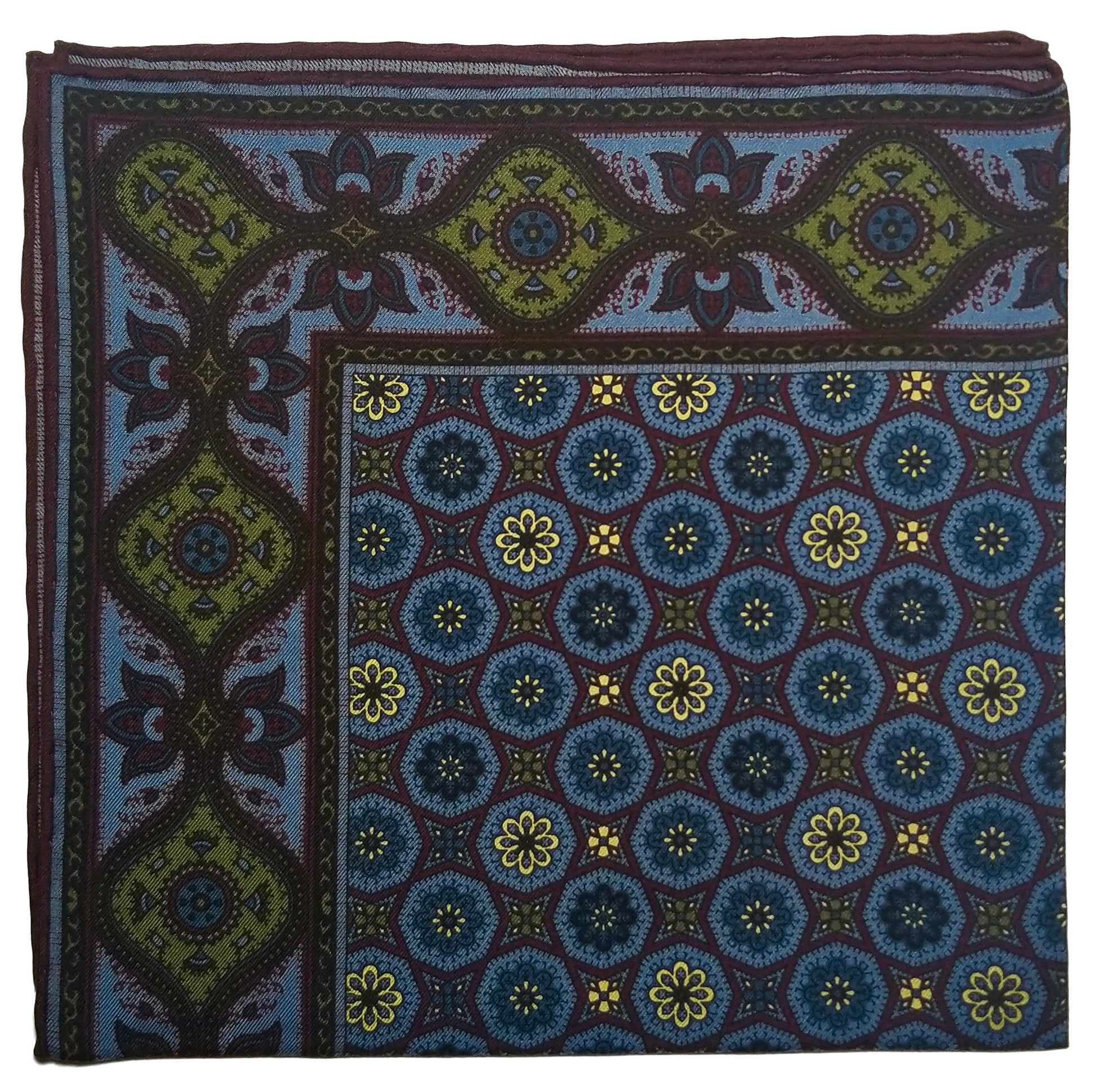 Screen-Printed Blue & Burgundy Ancient Madder Silk Pocket Square